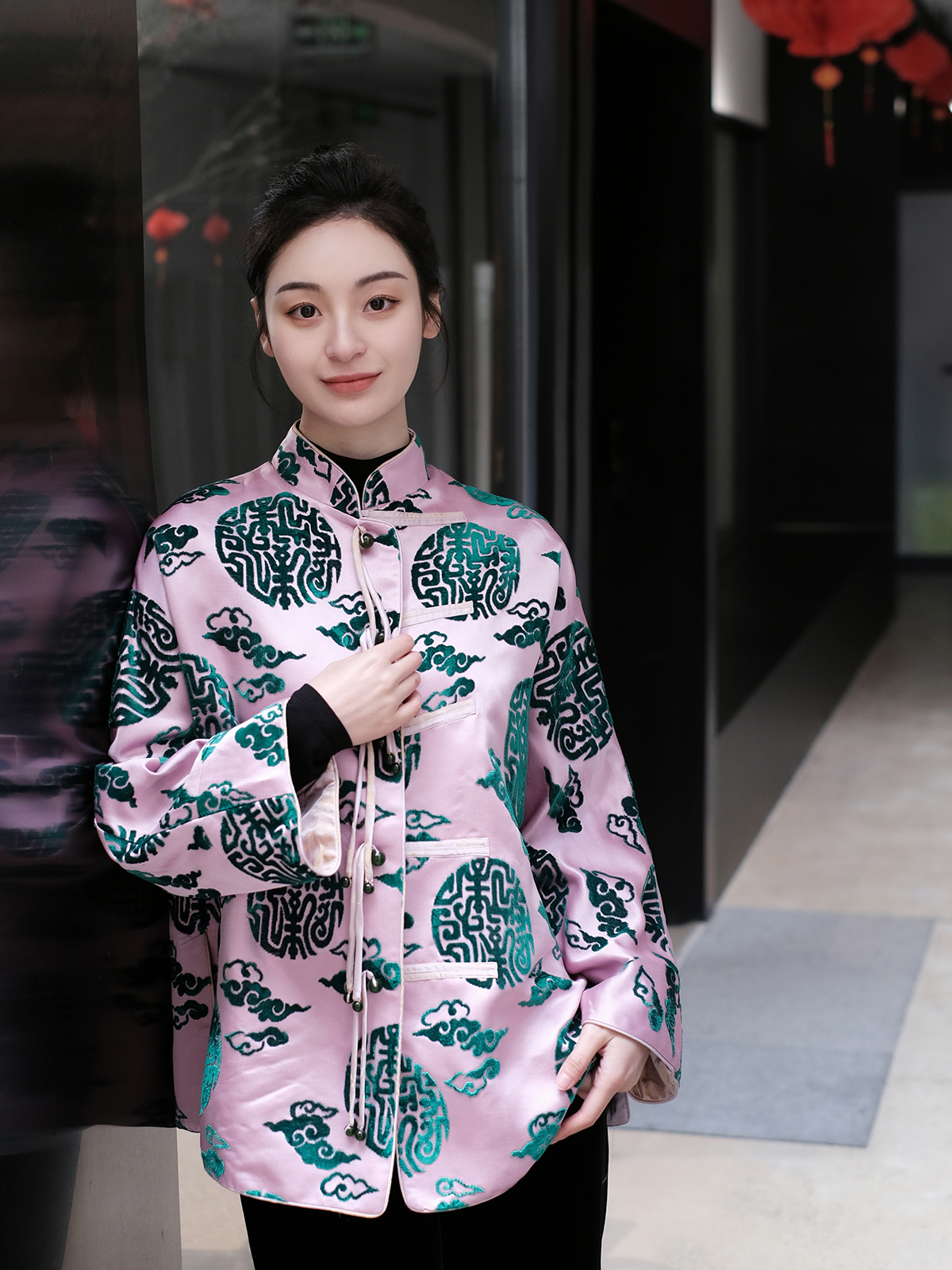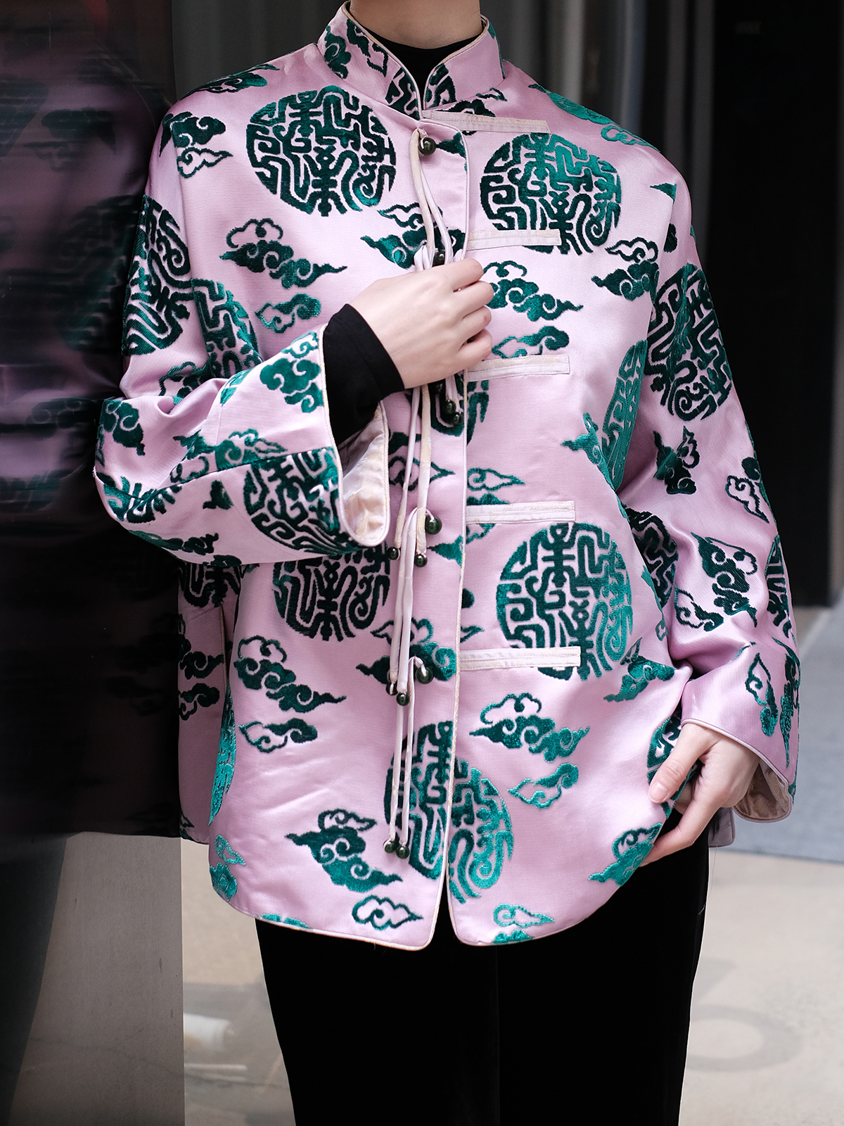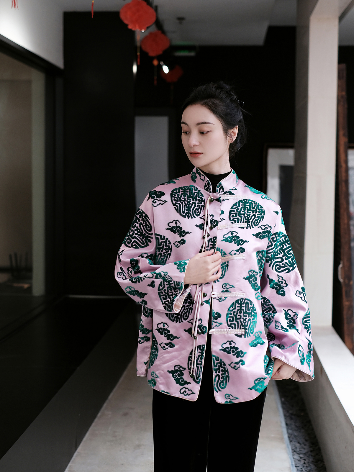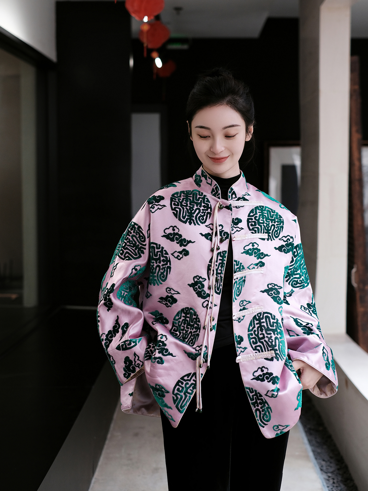 暂不上架|盛唐牡丹|粉色漳绒祥云百寿纹外套-钉珠款(钉珠花纹随机)