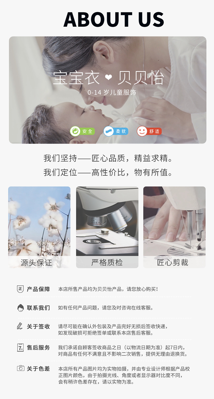- 贝贝怡专注0-6岁婴幼儿服饰,坚持安全、柔软、舒适的产品理念,为千万中国家庭提供超高品质、安全可靠的婴幼儿服饰产品,妈妈放心,宝宝开心!