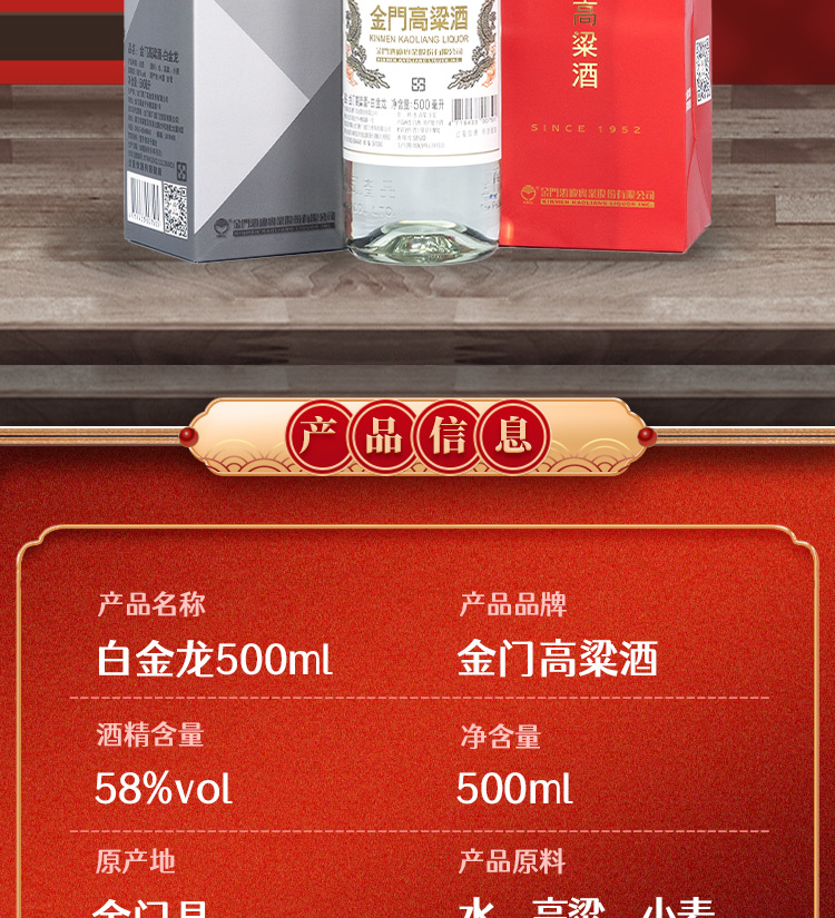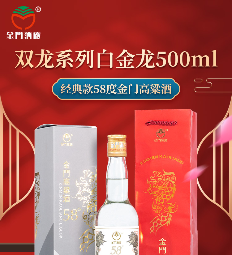 台湾金门高粱酒 双龙系列白金龙 0.5L-58度 6瓶整箱装