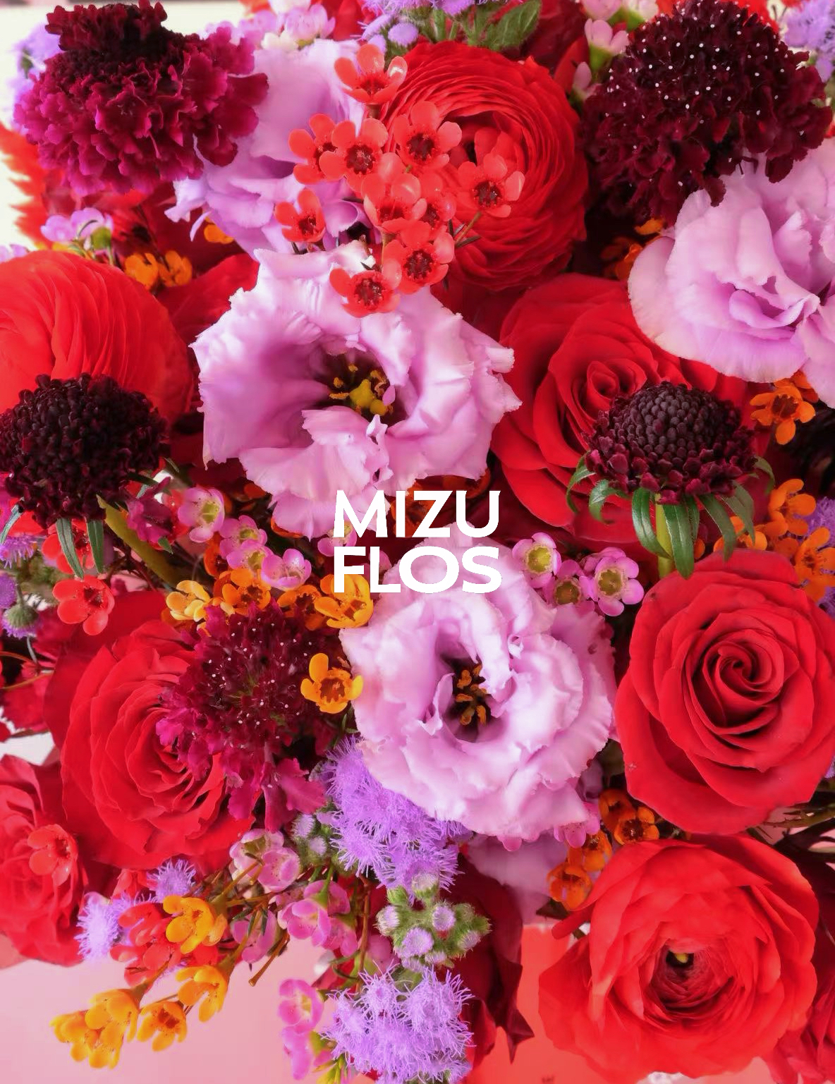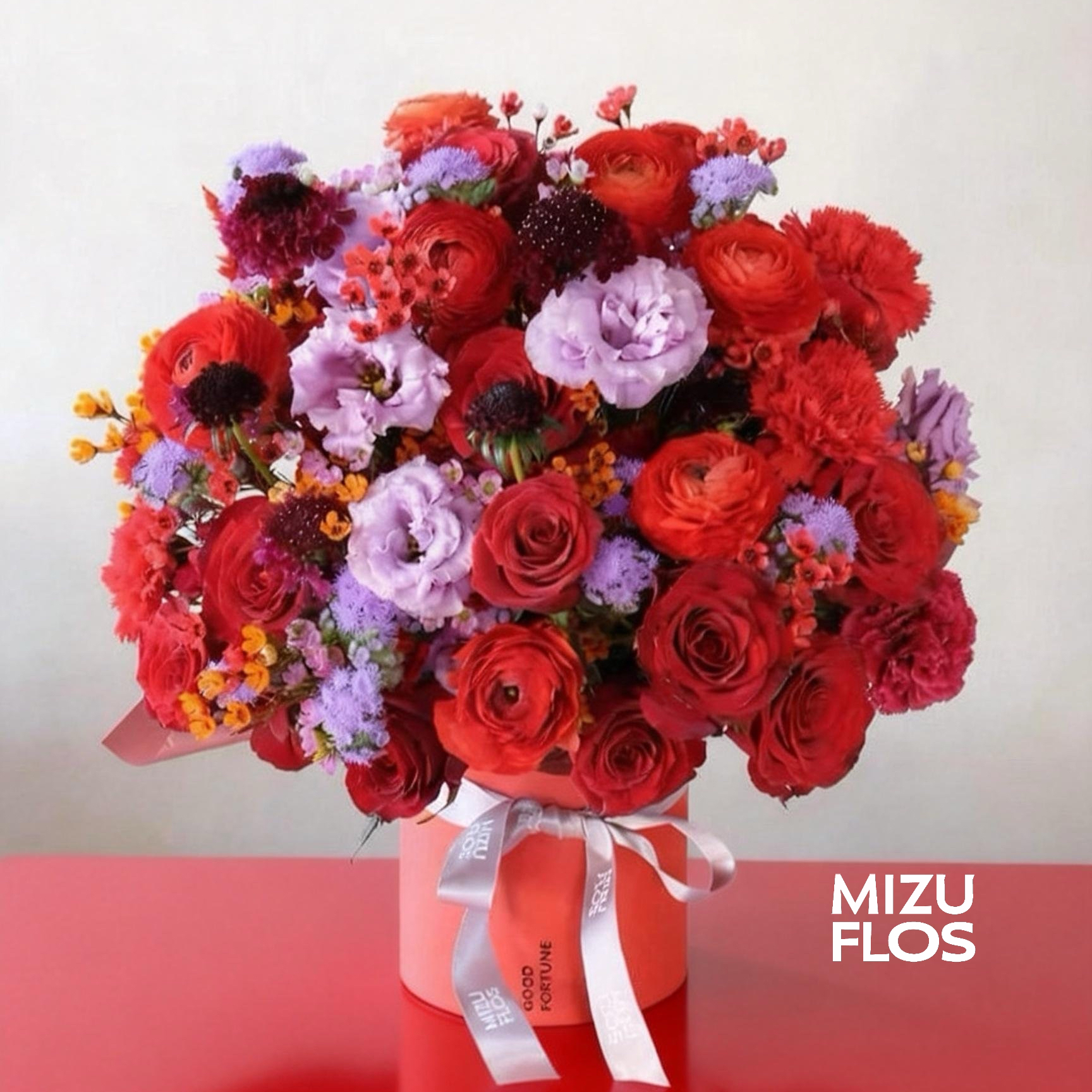红玫瑰、红色洋牡丹、洋桔梗、松虫草、澳洲腊梅