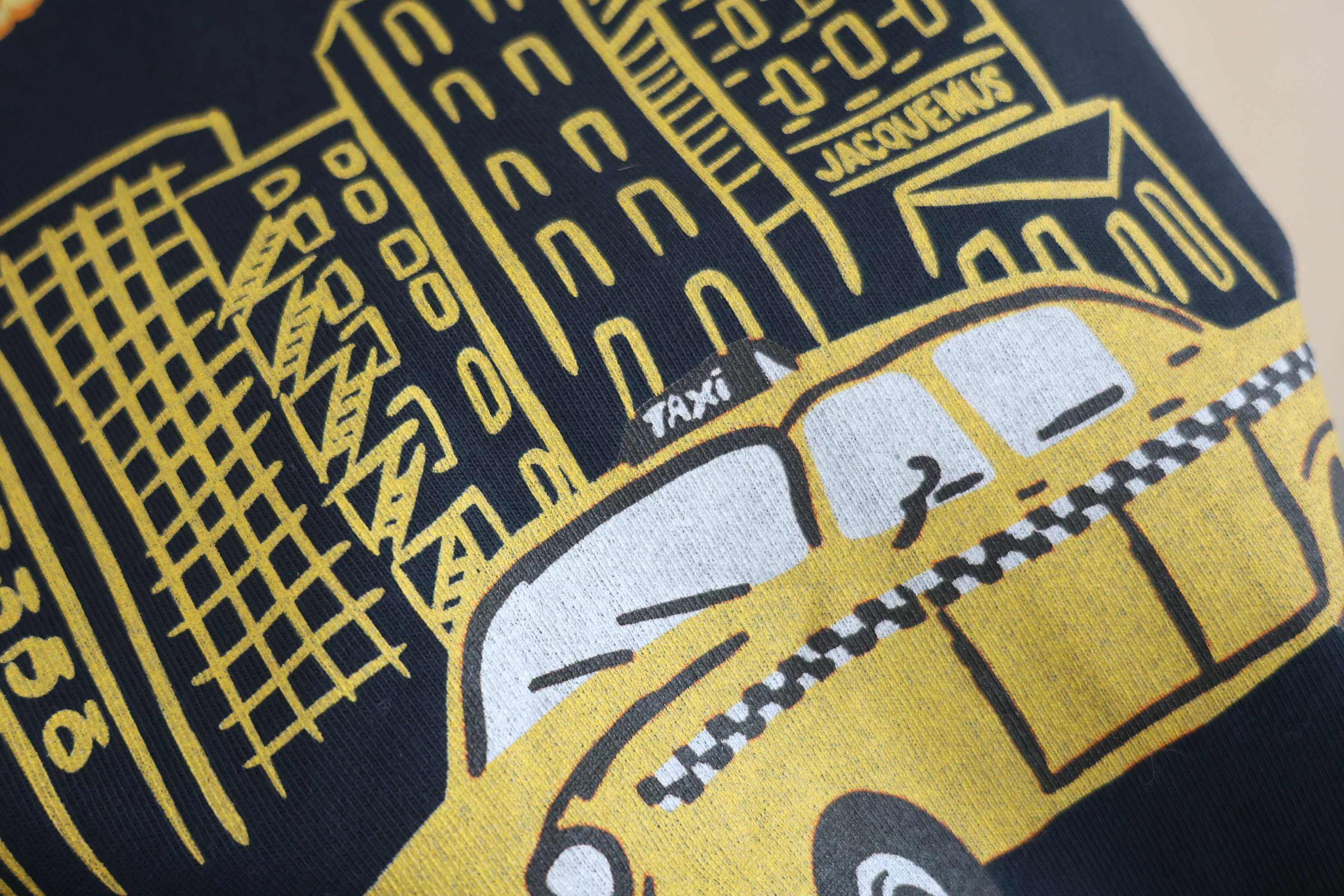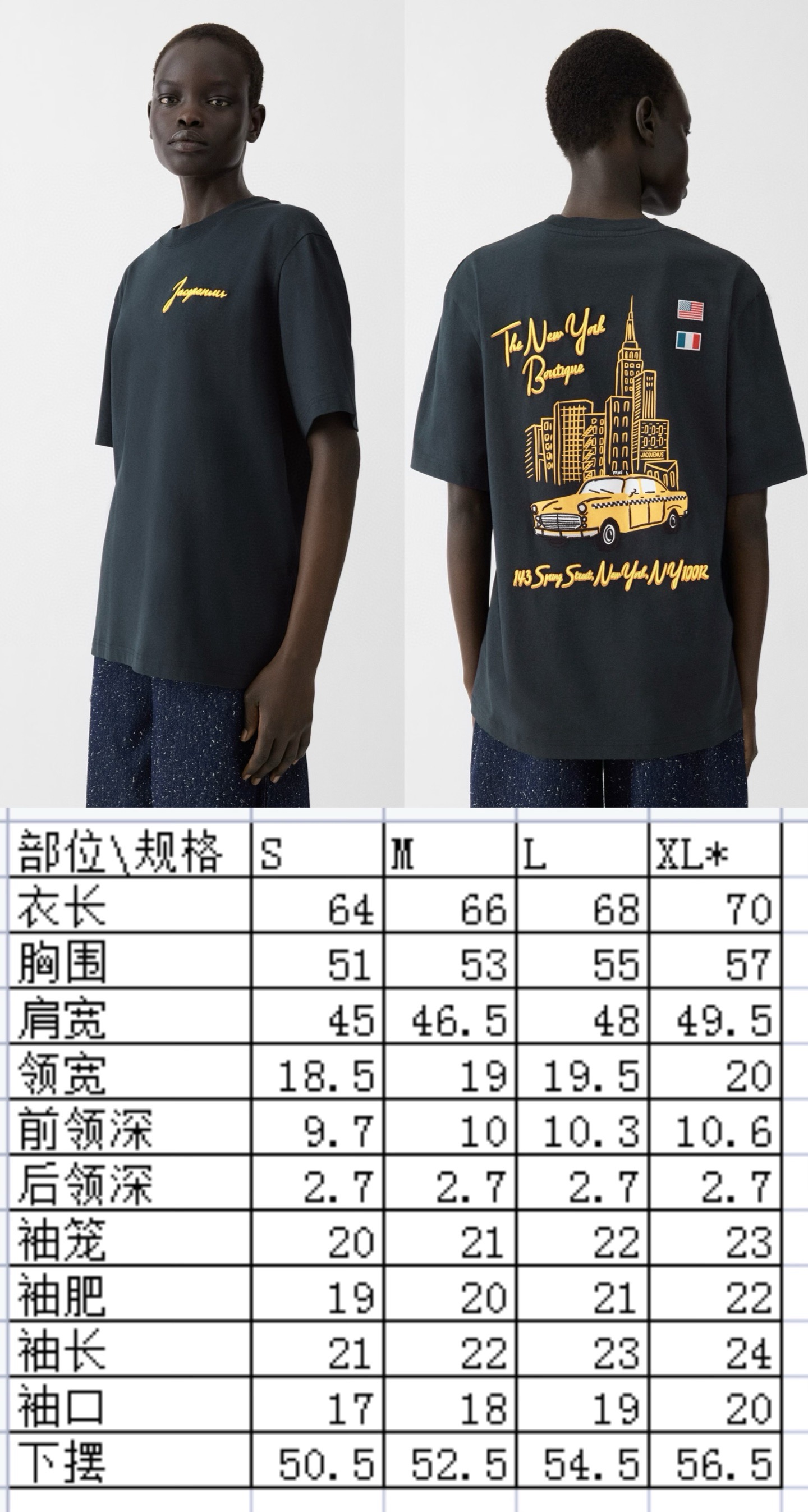 Jacquemus 2026春夏新款纽约精品店限定印花短袖T恤,沉稳的藏青色,厚实的棉质感,宽松休闲版型,胸前简约干净,草写的品牌字母在胸口呈现,辨识度丝毫不减;后背大幅纽约主题印花, 纽约城市文化元素的氛围感十足,右上角法国🇫🇷和美国🇺🇸国旗小印花,背景是纽约天际线(含帝国大厦等高楼剪影),融入了经典黄色出租车,下方为“143 Spring Street, New York, NY 10012”(纽约市斯普林街143号邮编10012)纽约精品店铺地址,将街头文化与城市主题结合,用单品设计推广城市据点。280克高磅棉质,正品级!