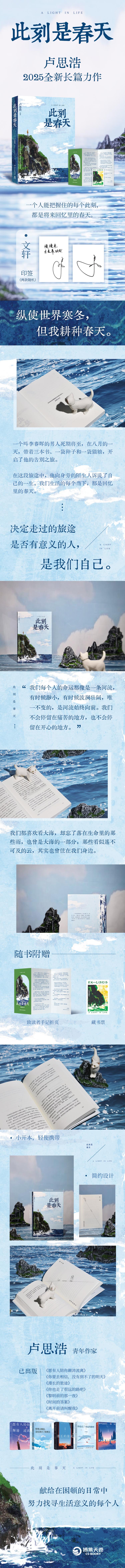 一个人能把握住的每个此刻,都是将来回忆里的春天。该书为青年作家卢思浩2025全新创作的长篇小说,也是他沉淀四年后又一长篇力作。献给在困顿的日常中努力找寻生活意义的每个人。一个叫春晖的男人死期将至。在八月的一天,他带着三本书、一袋花种和一袋猫粮,搭上了一辆车,开始展开他的告别之行。这一路上,他和司机叙述了自己曲折的一生。而在李春晖的人生经历中,他看似什么都没有做到,但他的一生依然有属于自己的颜色。我们也一样,决定走过的旅途是否有意义的人,永远是我们自己。我们生活的每个当下,都是回忆里的春天。