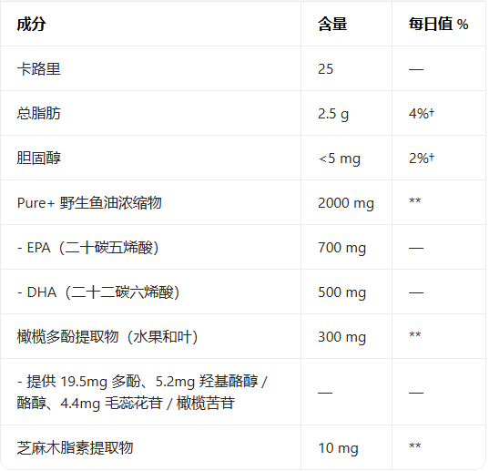 核心 Omega-3:每份含 2000mg 高浓缩鱼油,其中 EPA 700mg + DHA 500mg,为心血管和认知健康提供基础支持