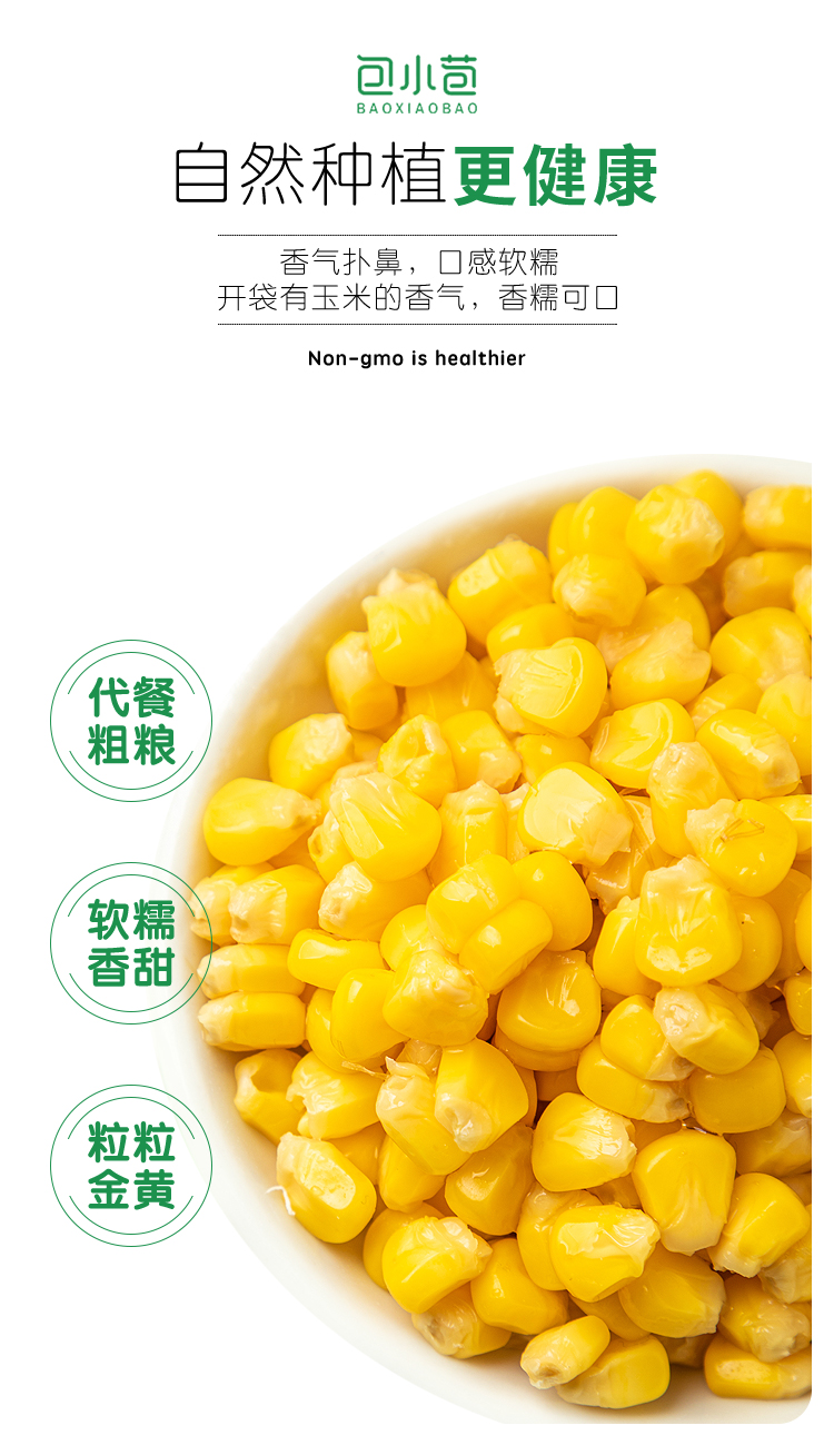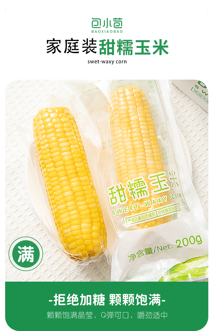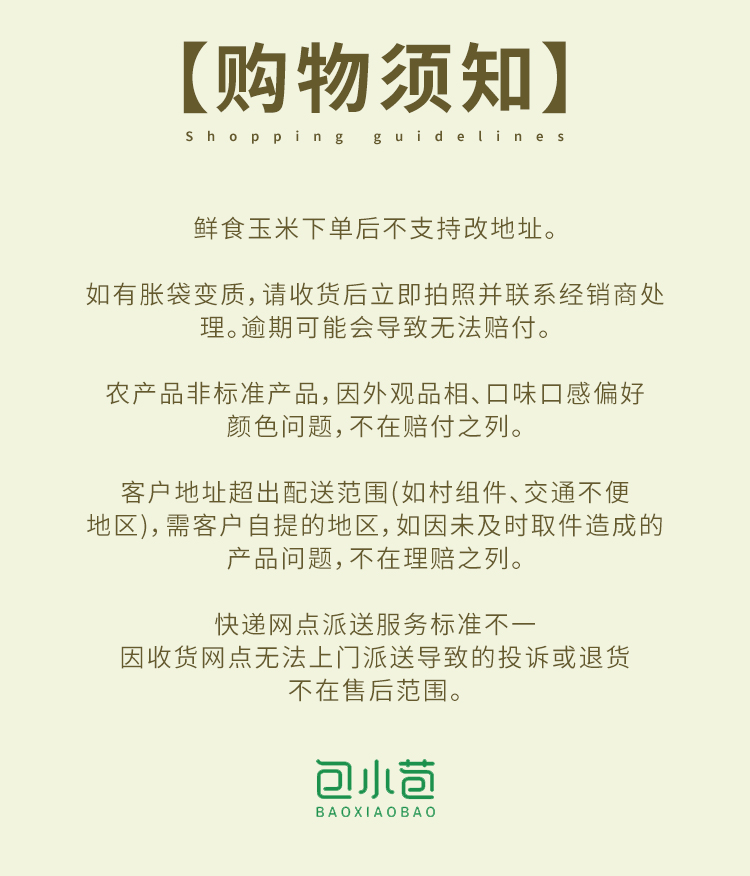【品名】包小苞非转基因甜糯玉米 【规格】家庭装200g*10根/箱 【保质期】12个月 【储存方法】请置于阴凉干燥处,避免阳光直射 【产地】松原 【发货地】长春 【发货快递】圆通、中通 【不发货区域】新疆、西藏、四川省甘孜地区、港澳台地区不发 【补邮费地区】海南+5元 【发货时效】48小时,节假日顺延 |
