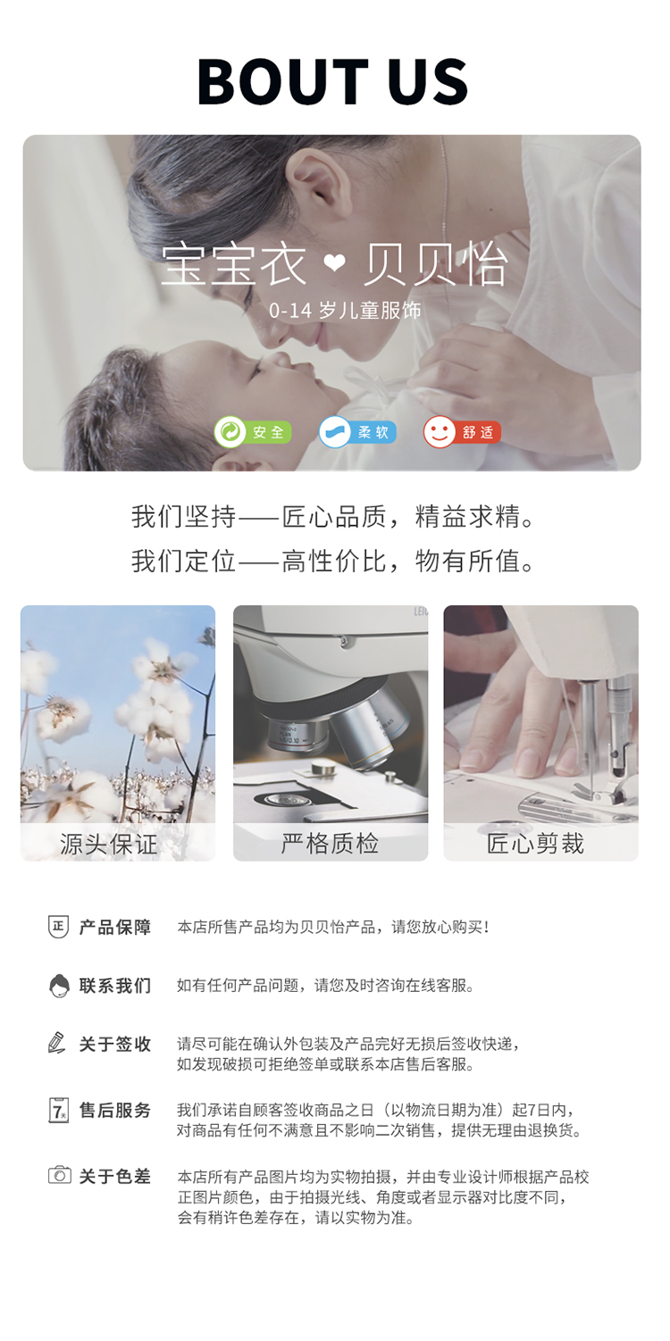 - 贝贝怡专注0-6岁婴幼儿服饰,坚持安全、柔软、舒适的产品理念,为千万中国家庭提供超高品质、安全可靠的婴幼儿服饰产品,妈妈放心,宝宝开心!