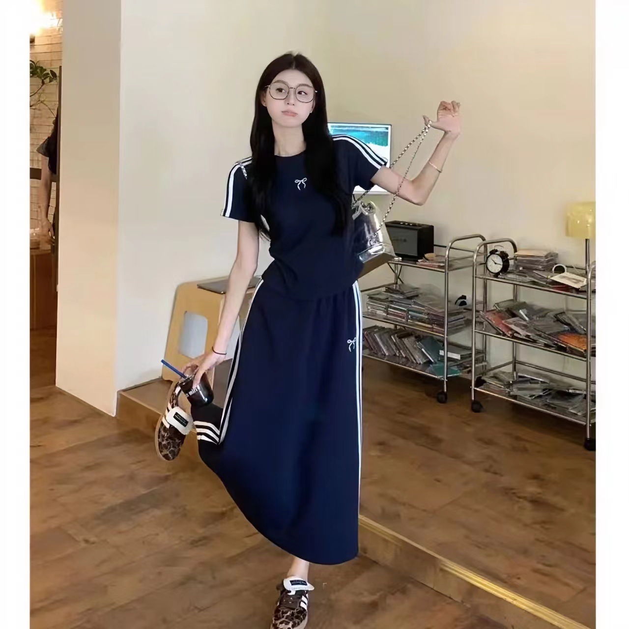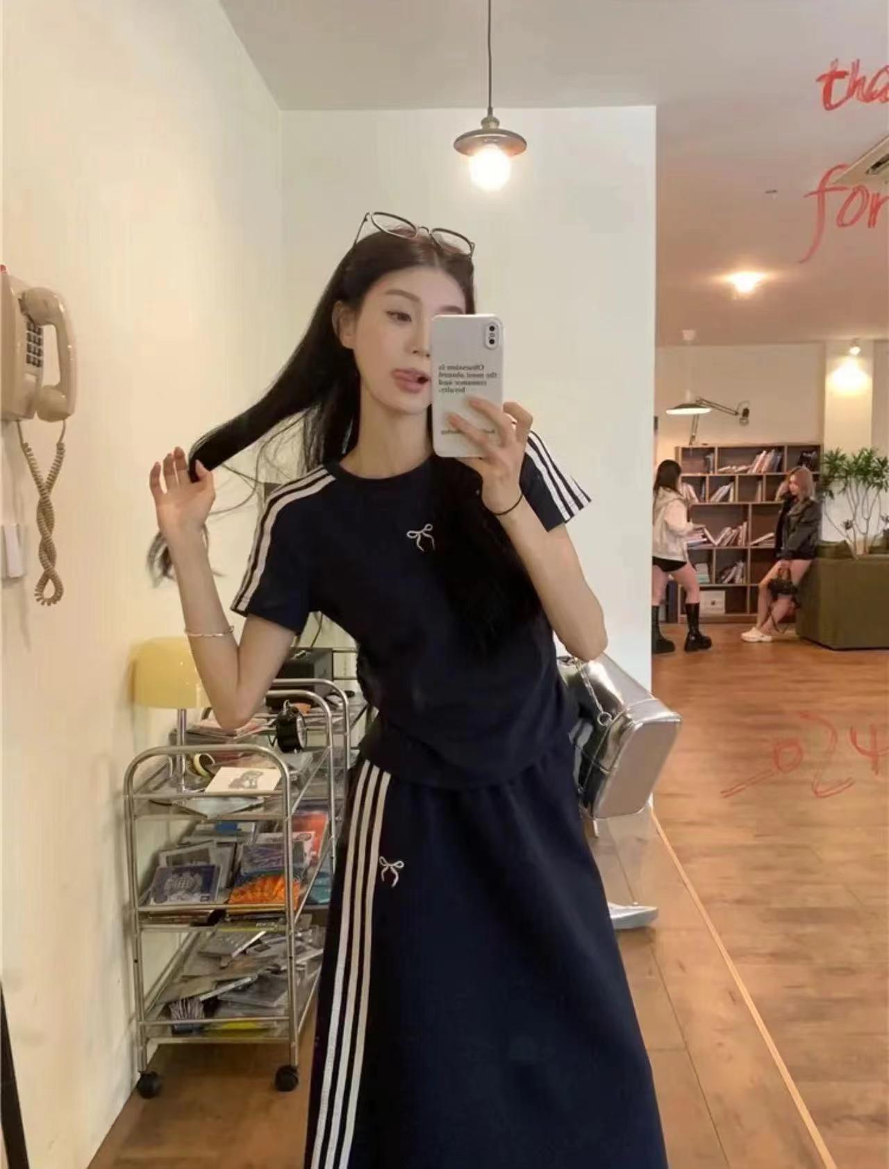 休闲运动套装女三条杠蝴蝶结短袖T恤夏季包臀半身长裙两件套6_ym
