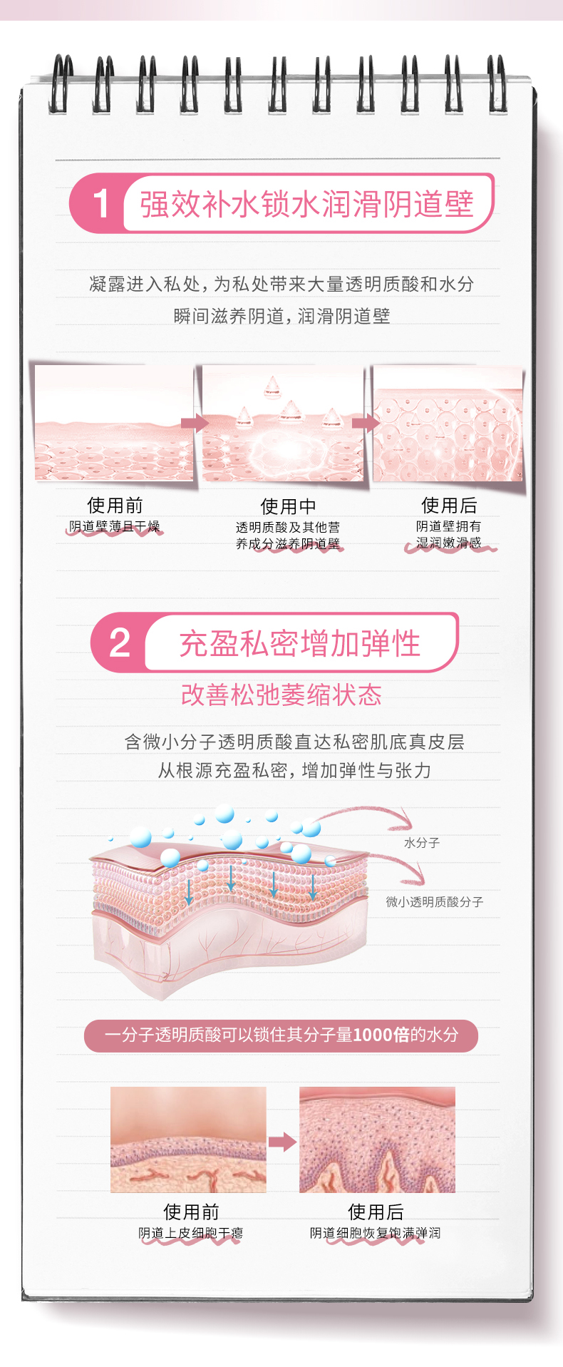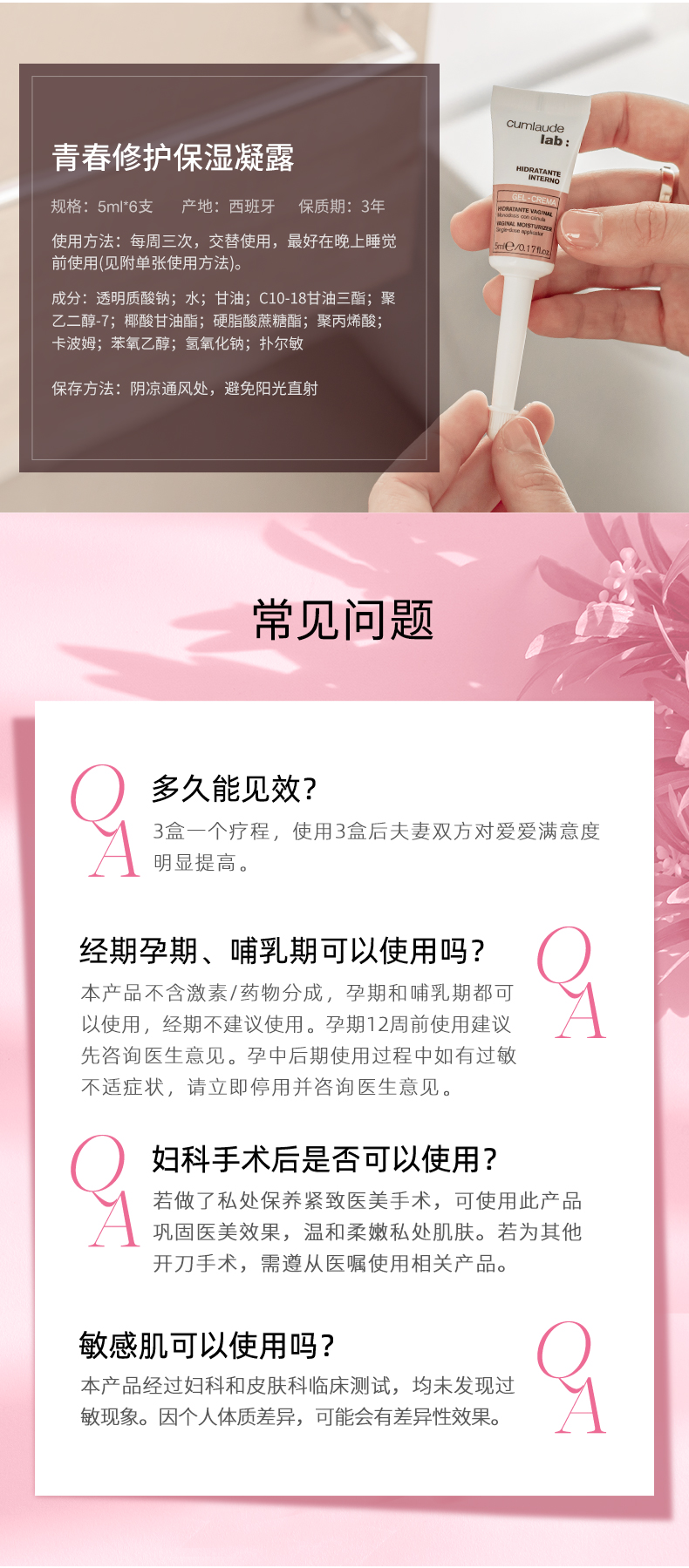 如果有阴道干涩的问题,用完三盒会有很明显的改善,干涩感会消失,阴道内壁明显膨胀和保湿,回到十八岁的自己不是梦。假如皮肤需要保养,阴道也是一样需要用"护肤品"的呵护才能保持青春。