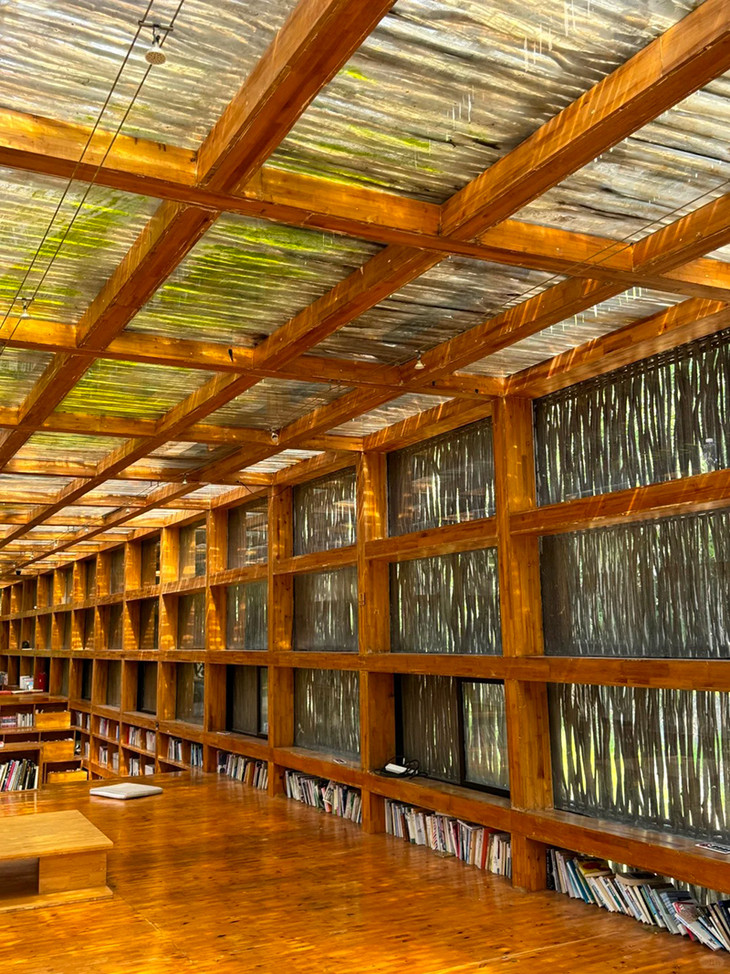 - 11:00|到达【篱苑书屋】,参观全球18个最美阅读天堂之一——独具匠心的篱苑书屋;篱苑书屋是清华大学教授李晓东的作品,它被评为 “全球最美 18 座书屋之一”,外观独特,用 4 万余根柴禾棍装饰,与自然环境浑然一体。室内采用合成杉木板装修,空间由大台阶及书架组成,藏书丰富,涵盖文史类、儿童读物、名著等。