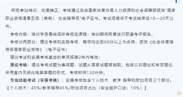 由国家体育总局和国家人力资源保障部共同颁发的《滑雪社会体育指导员国家职业资格》证书,纳入国家职业资格体系。