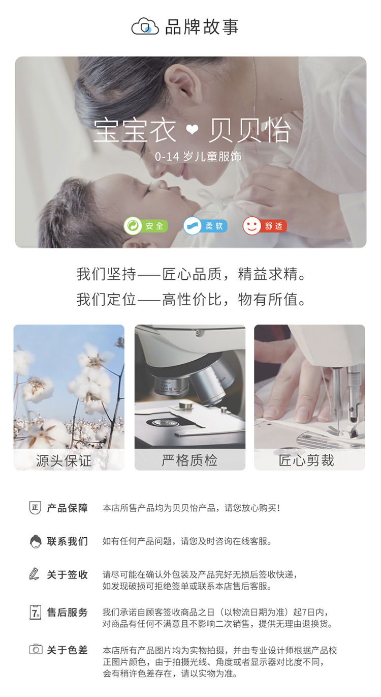 - 贝贝怡专注0-6岁婴幼儿服饰,坚持安全、柔软、舒适的产品理念,为千万中国家庭提供超高品质、安全可靠的婴幼儿服饰产品,妈妈放心,宝宝开心!