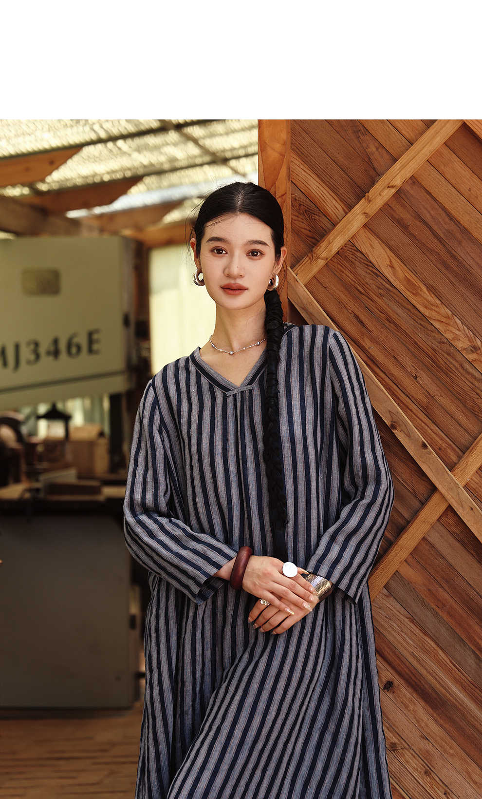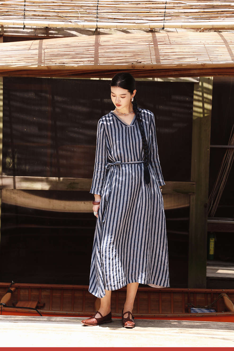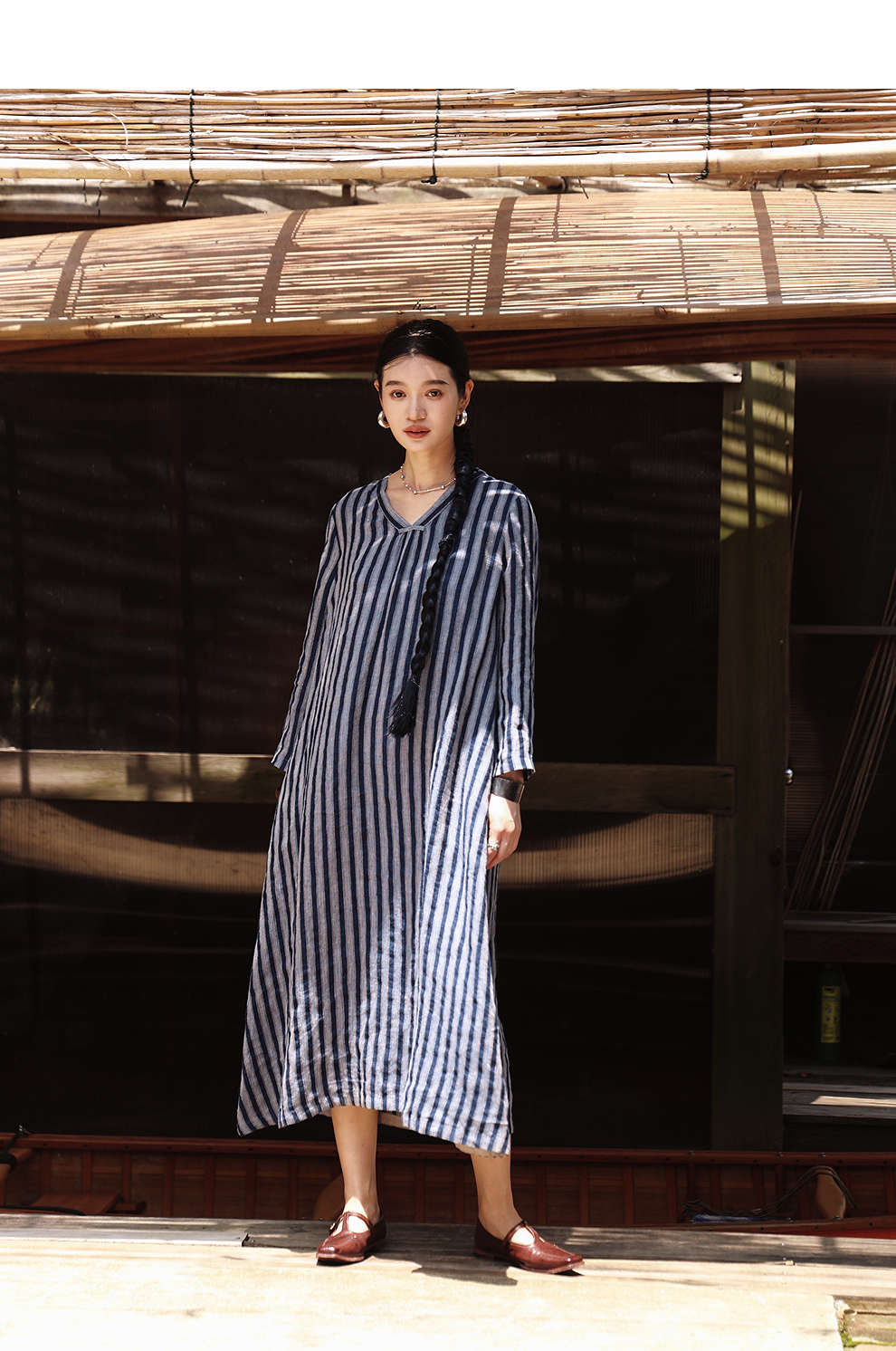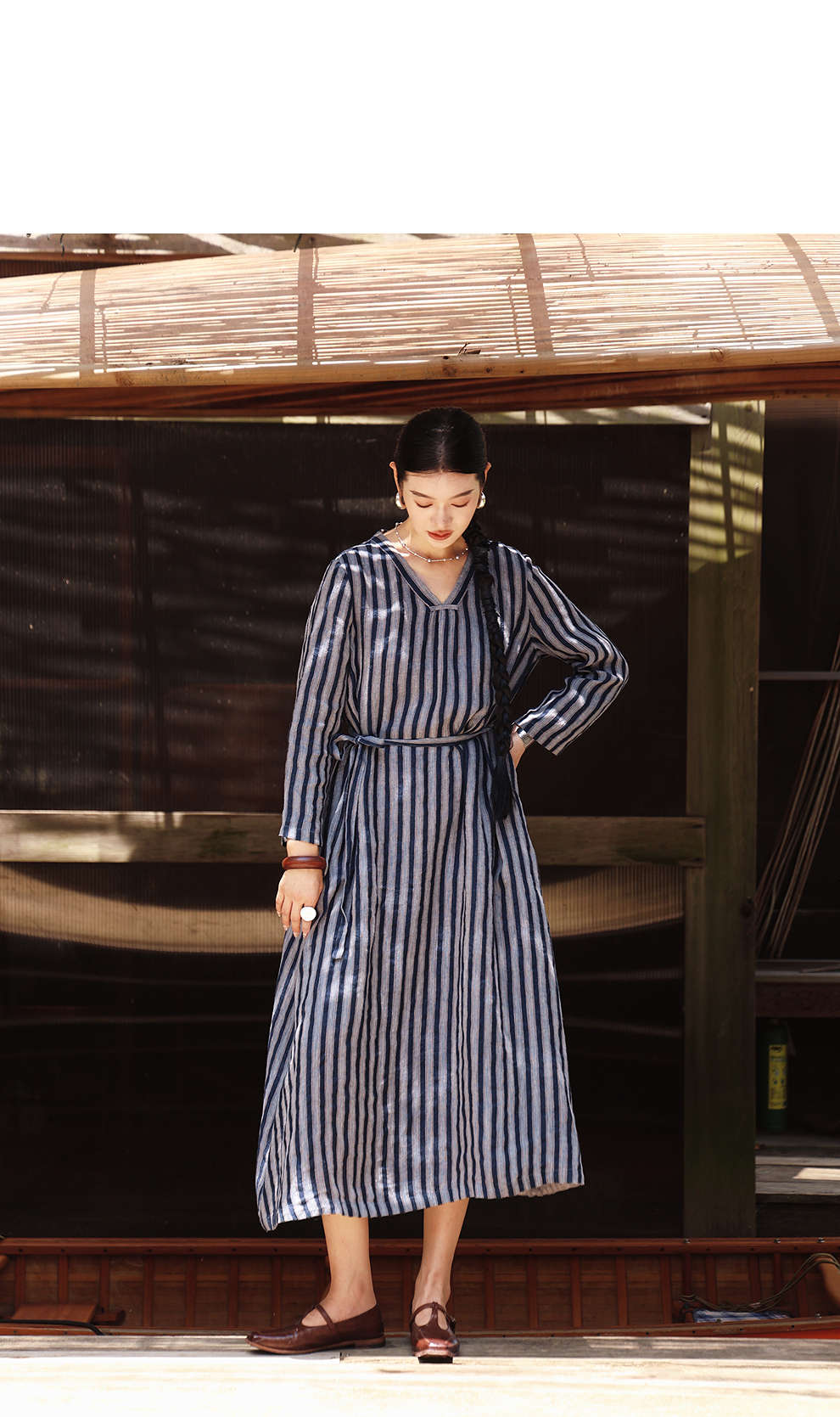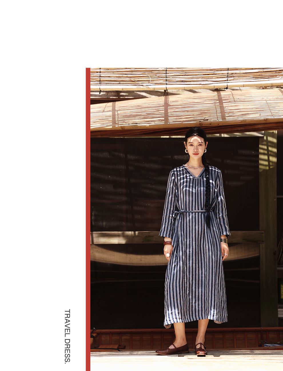 绽放旅行女装501朵/【大山的褶皱】色织条纹V领正常肩长袖连衣裙