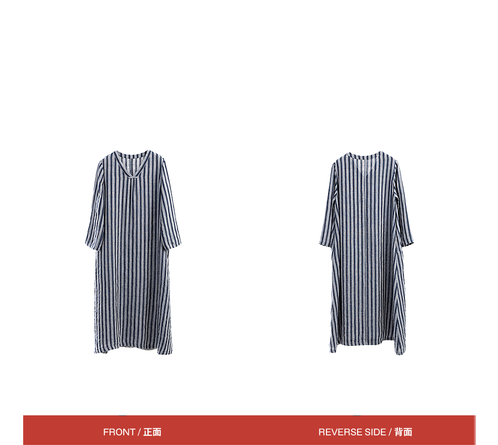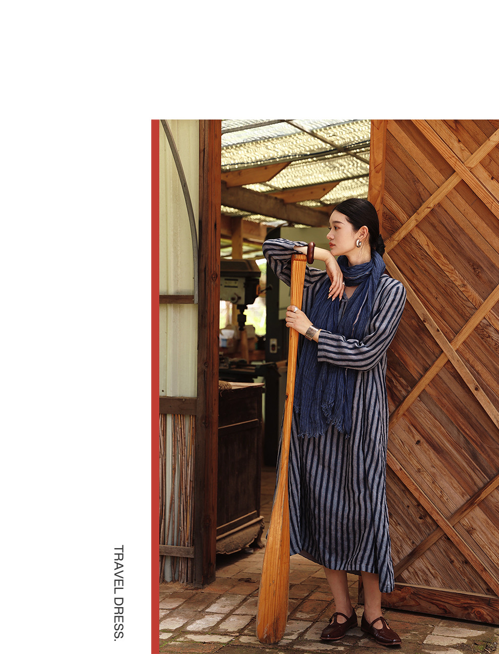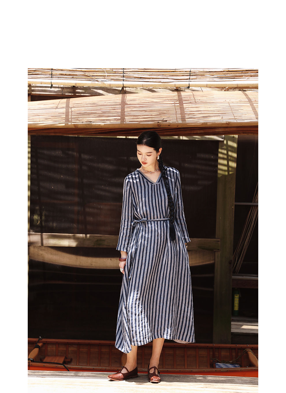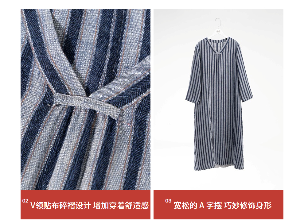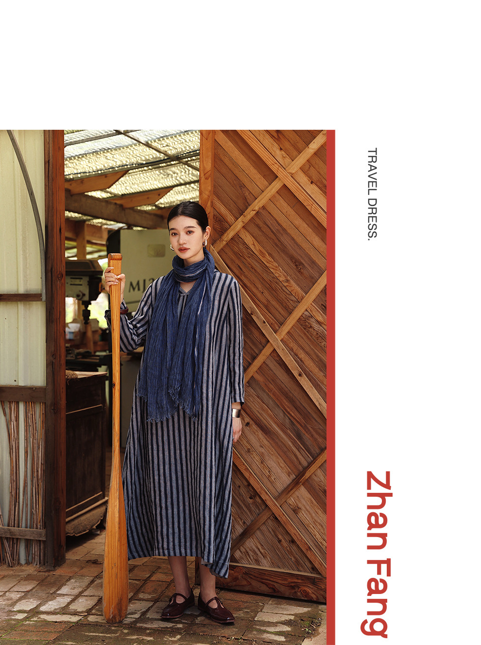 绽放旅行女装501朵/【大山的褶皱】色织条纹V领正常肩长袖连衣裙