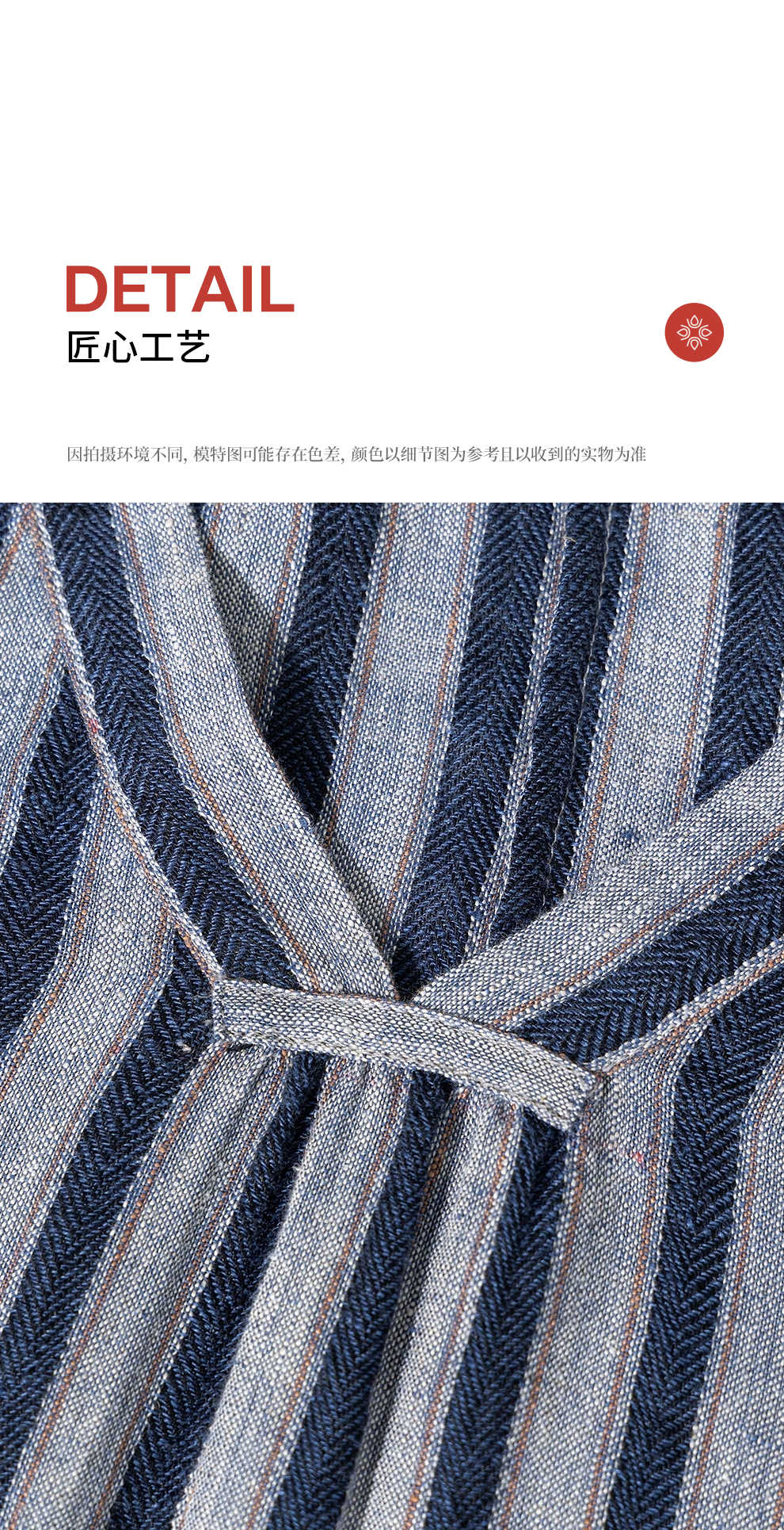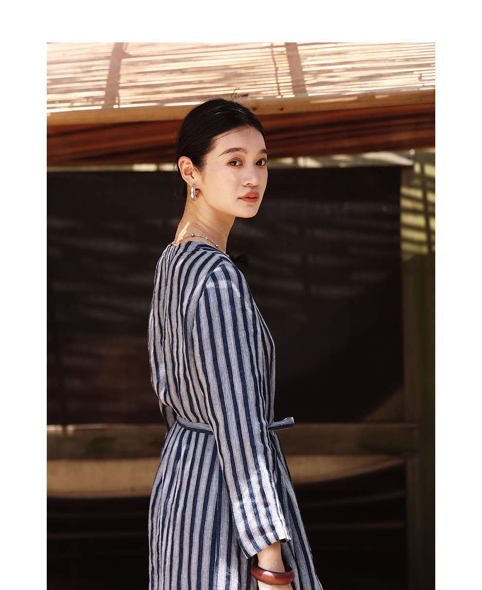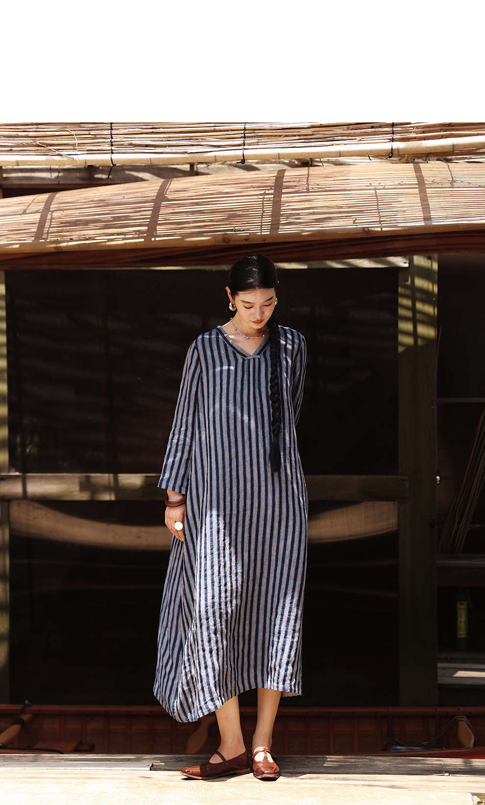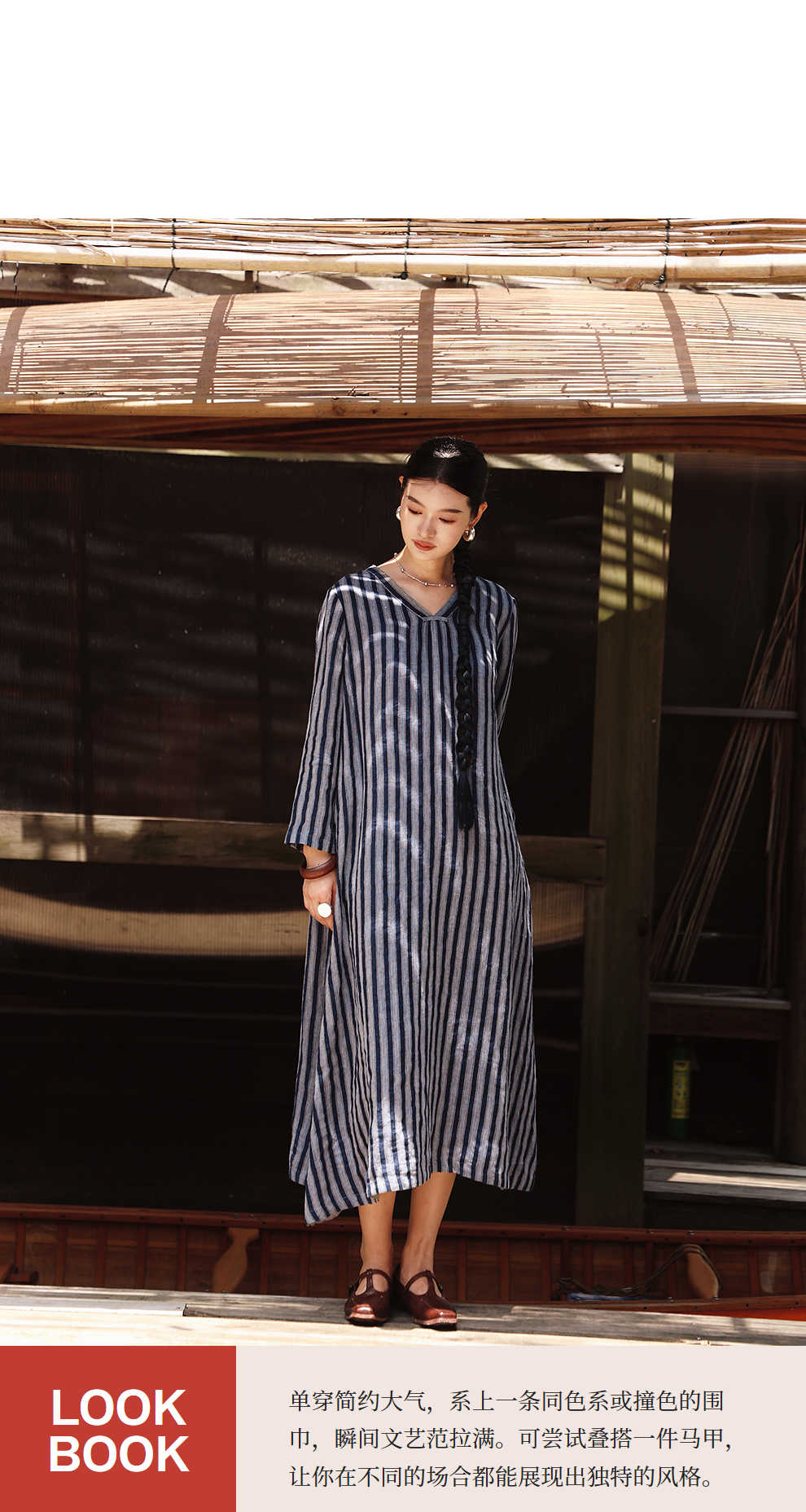 绽放旅行女装501朵/【大山的褶皱】色织条纹V领正常肩长袖连衣裙