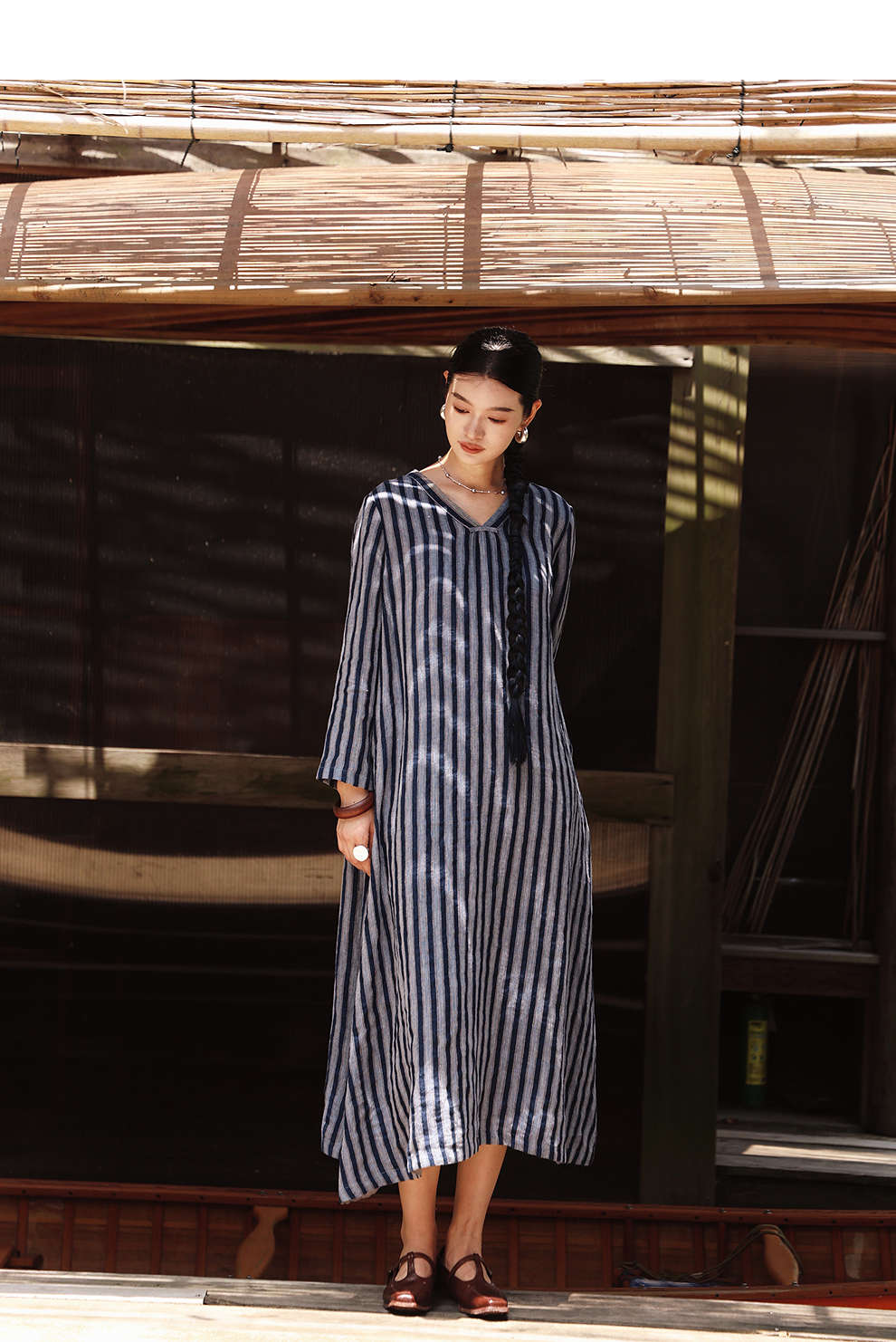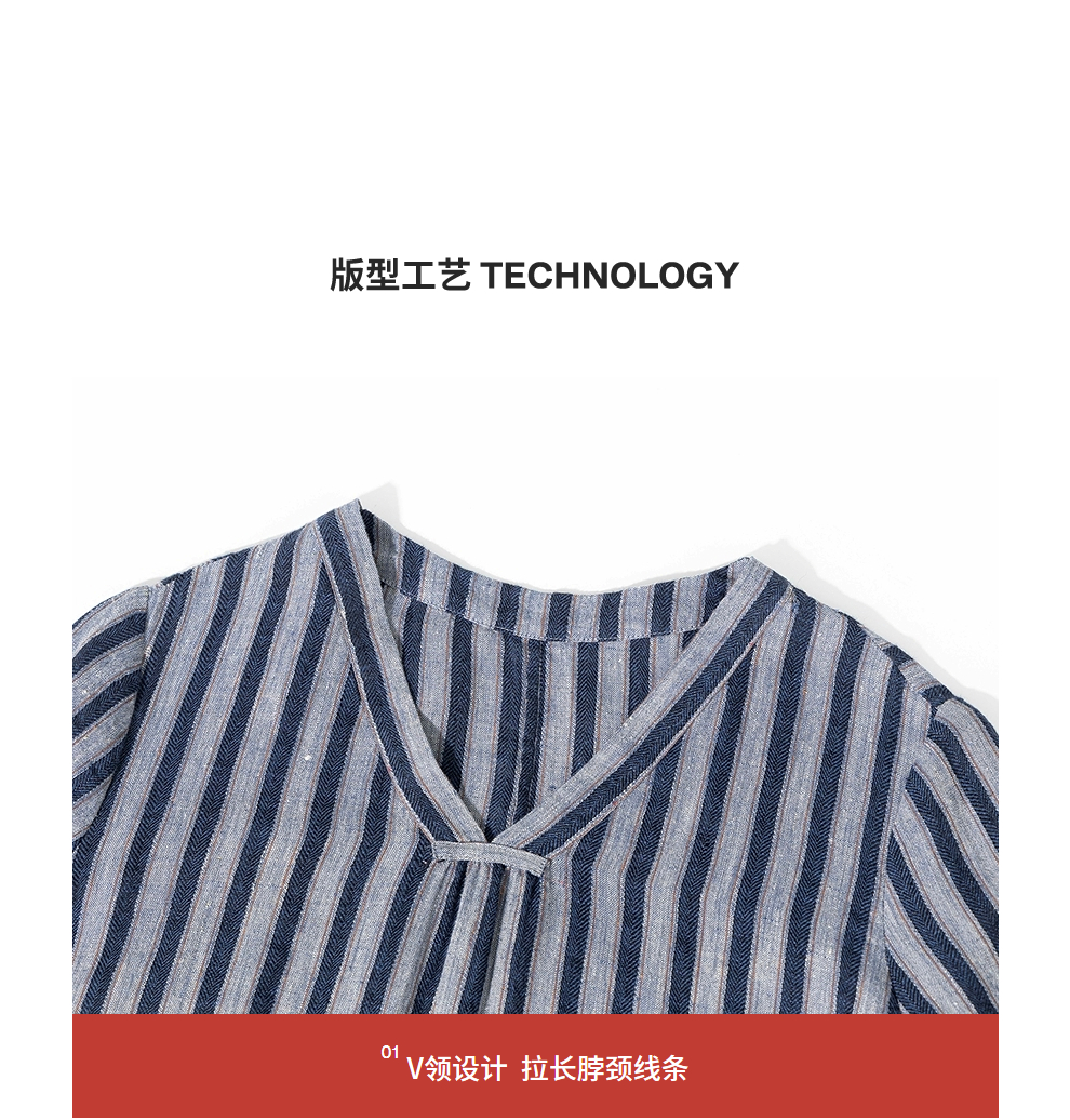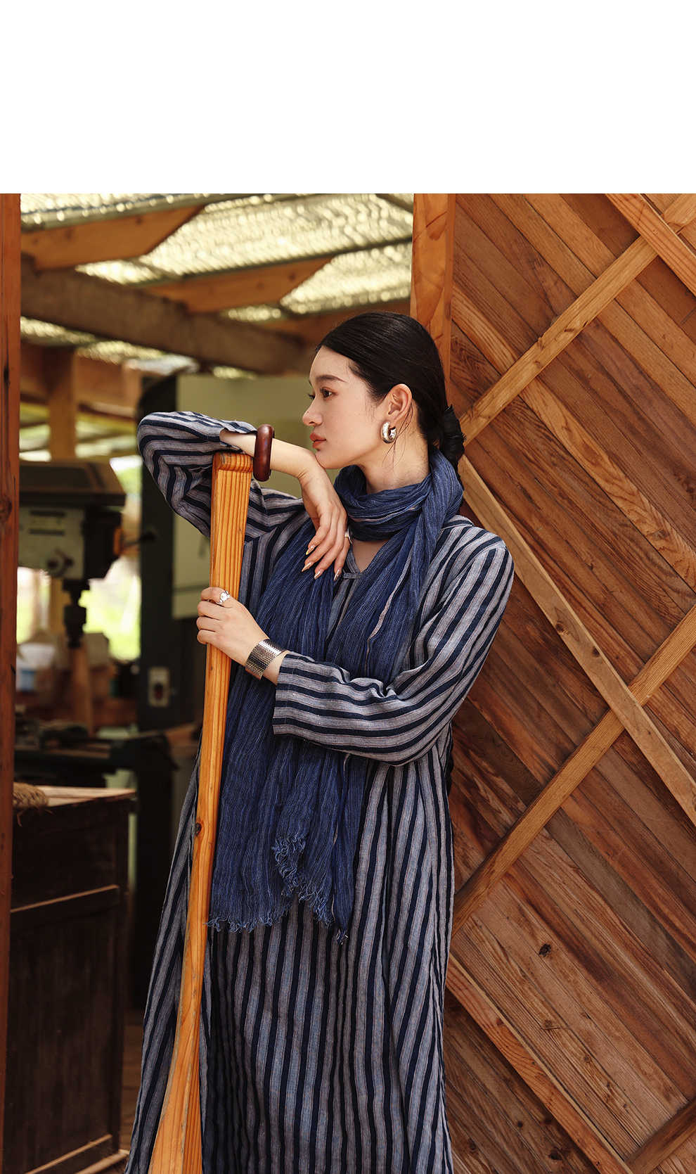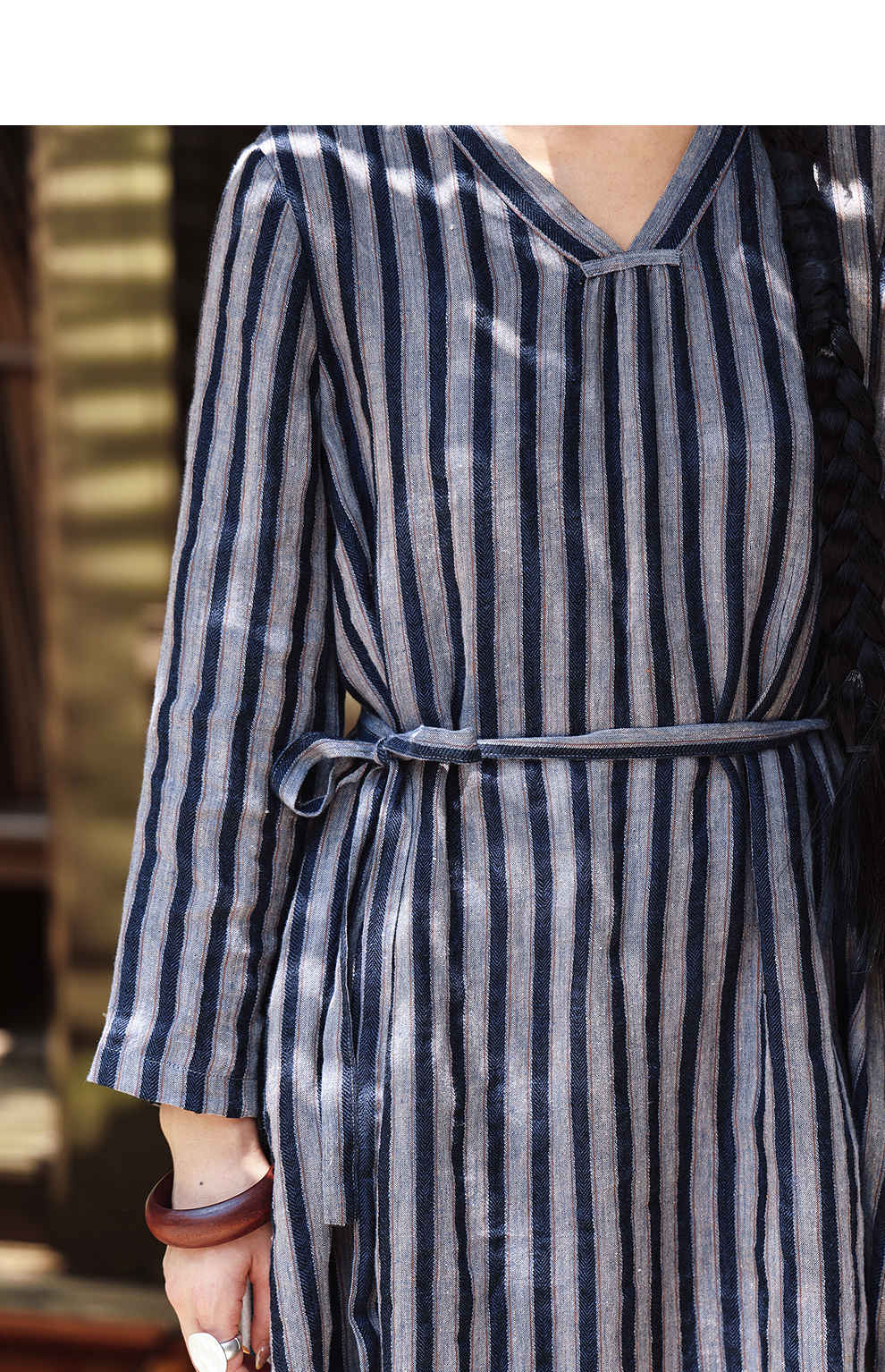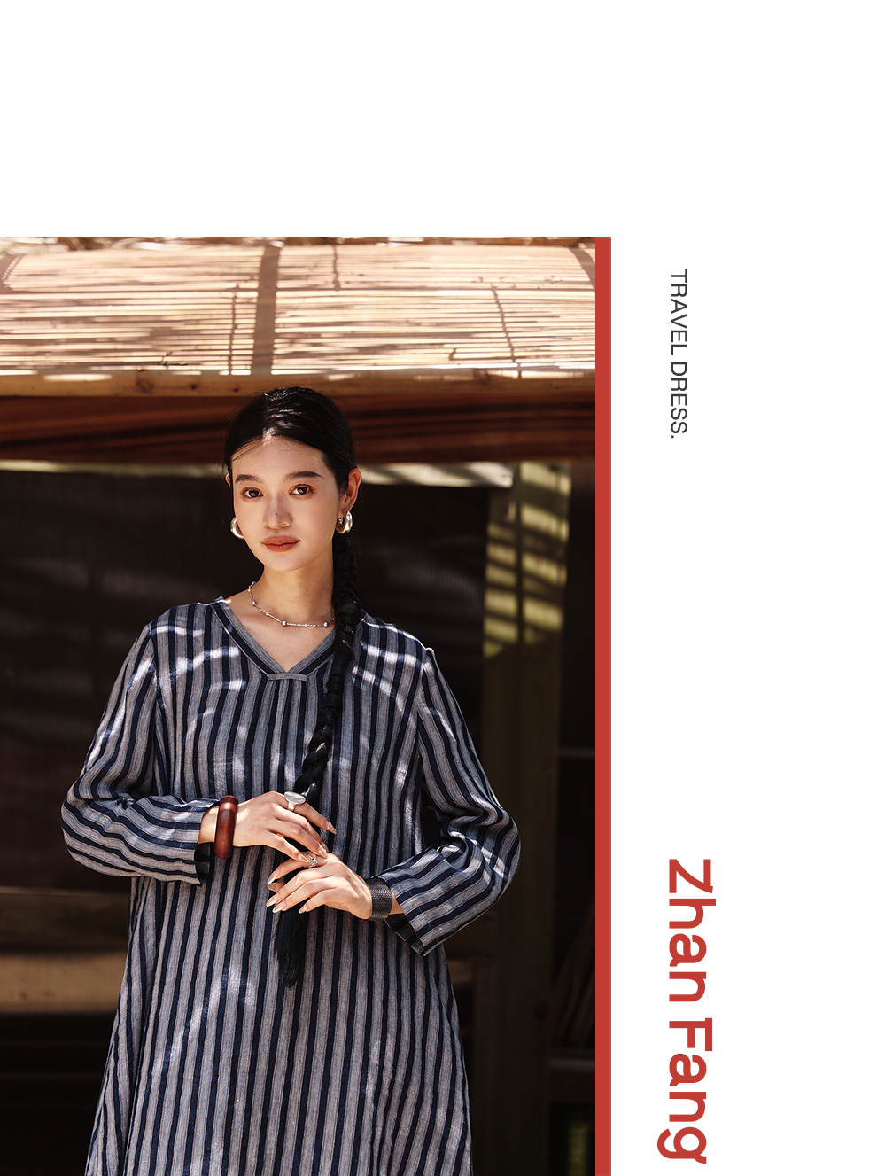 绽放旅行女装501朵/【大山的褶皱】色织条纹V领正常肩长袖连衣裙