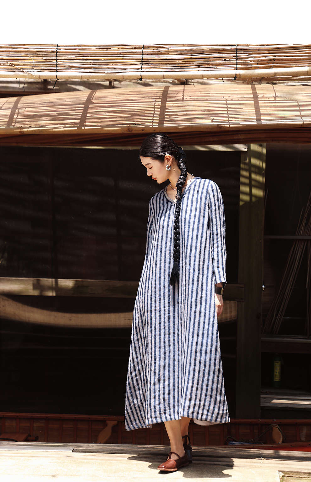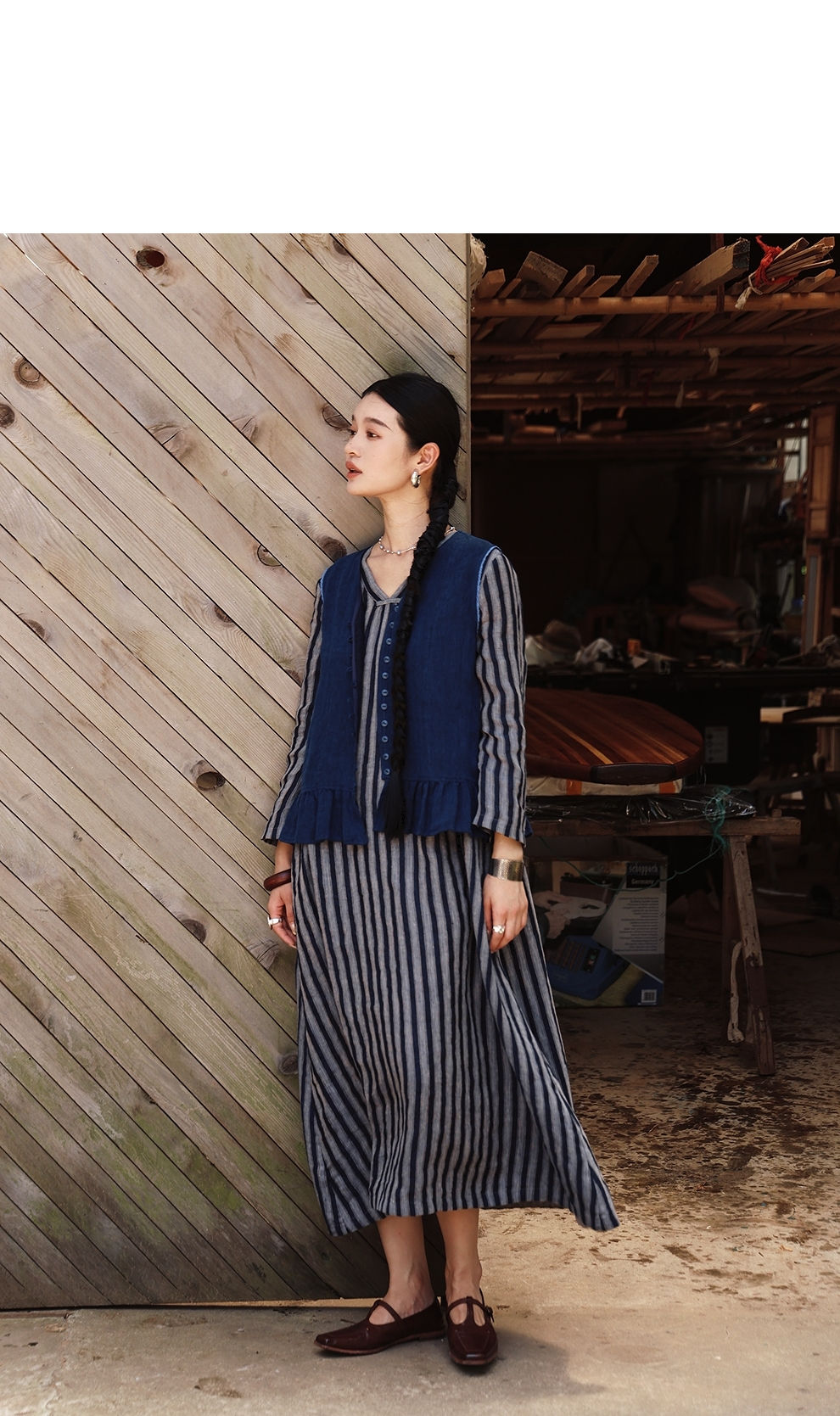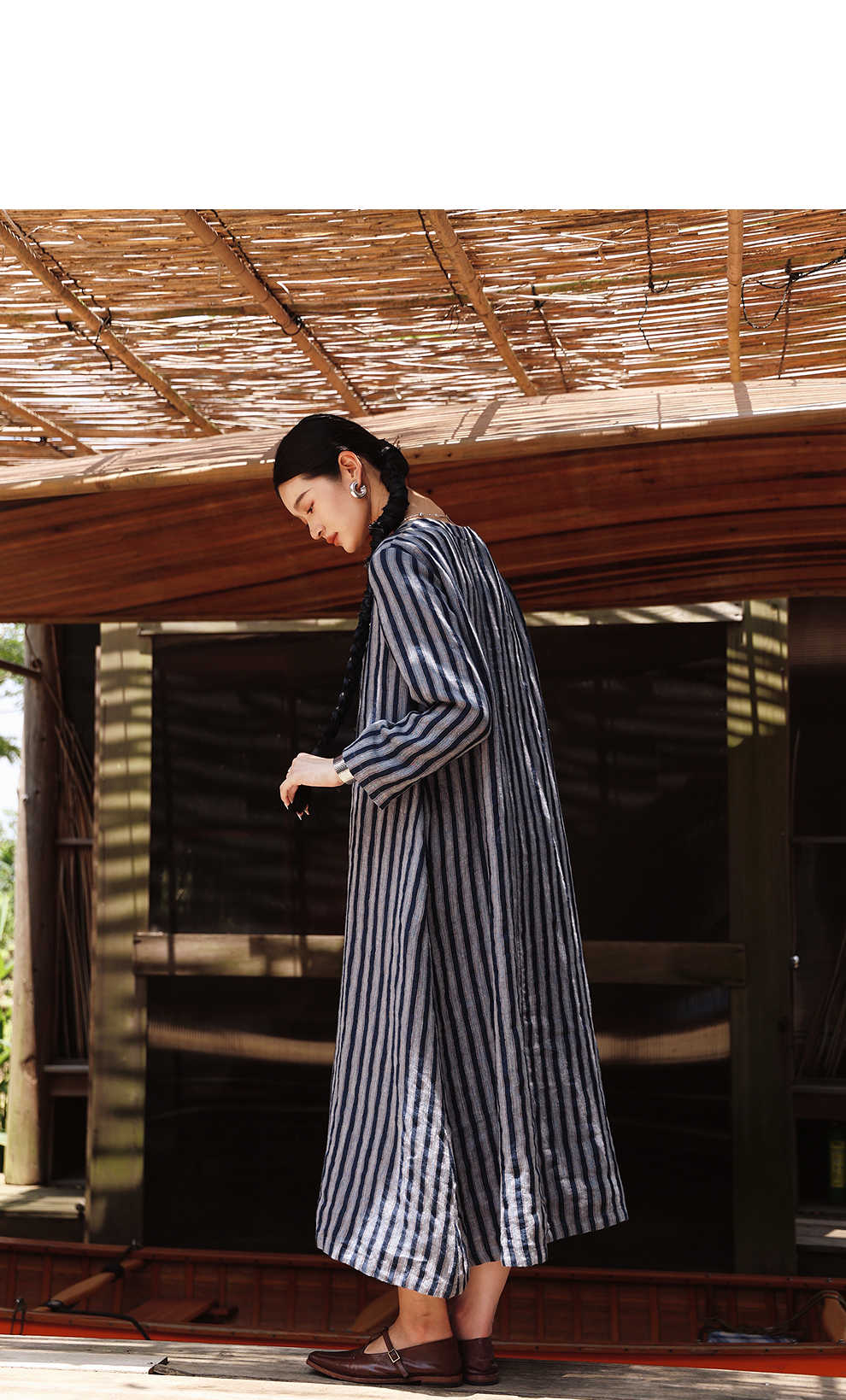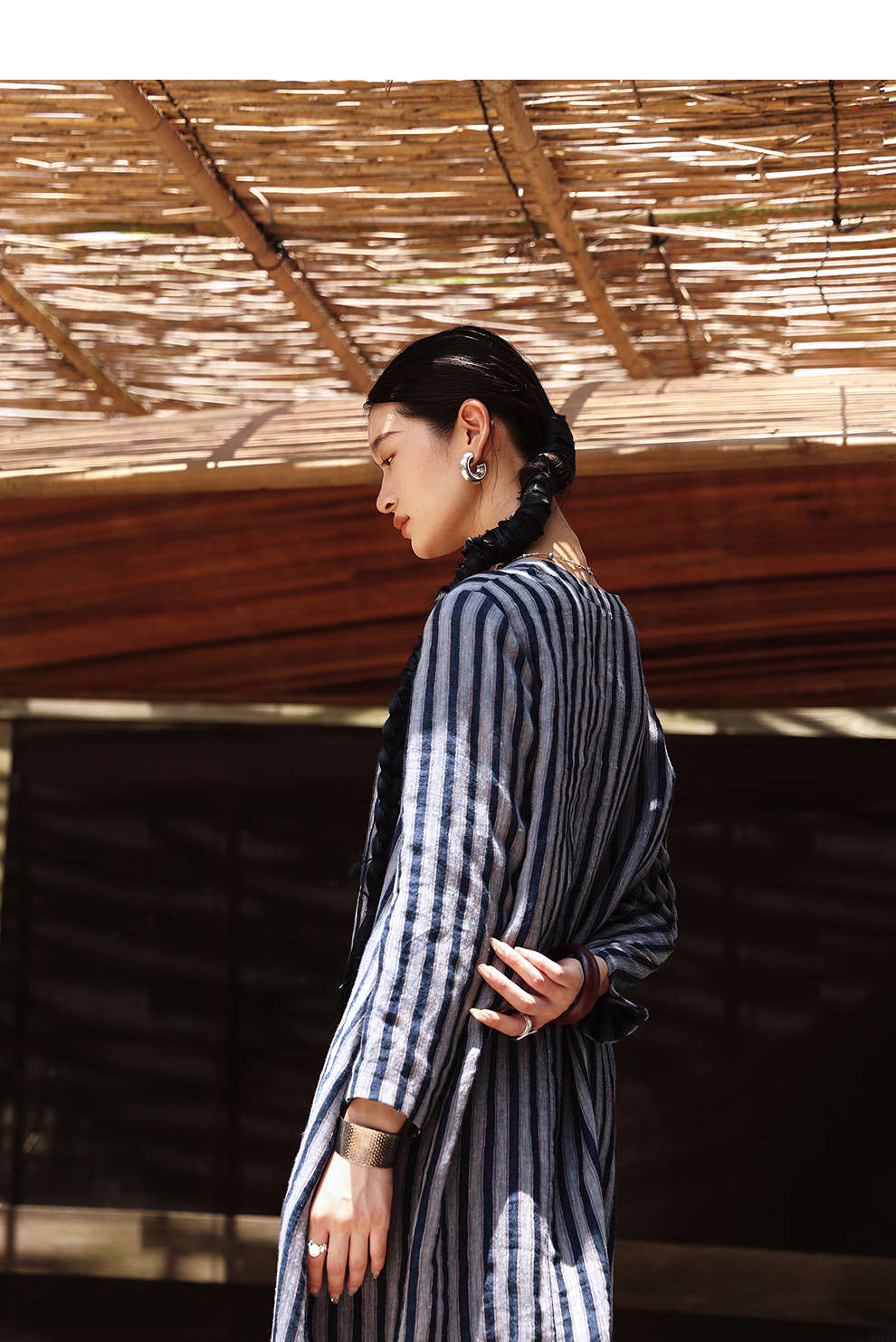绽放旅行女装501朵/【大山的褶皱】色织条纹V领正常肩长袖连衣裙