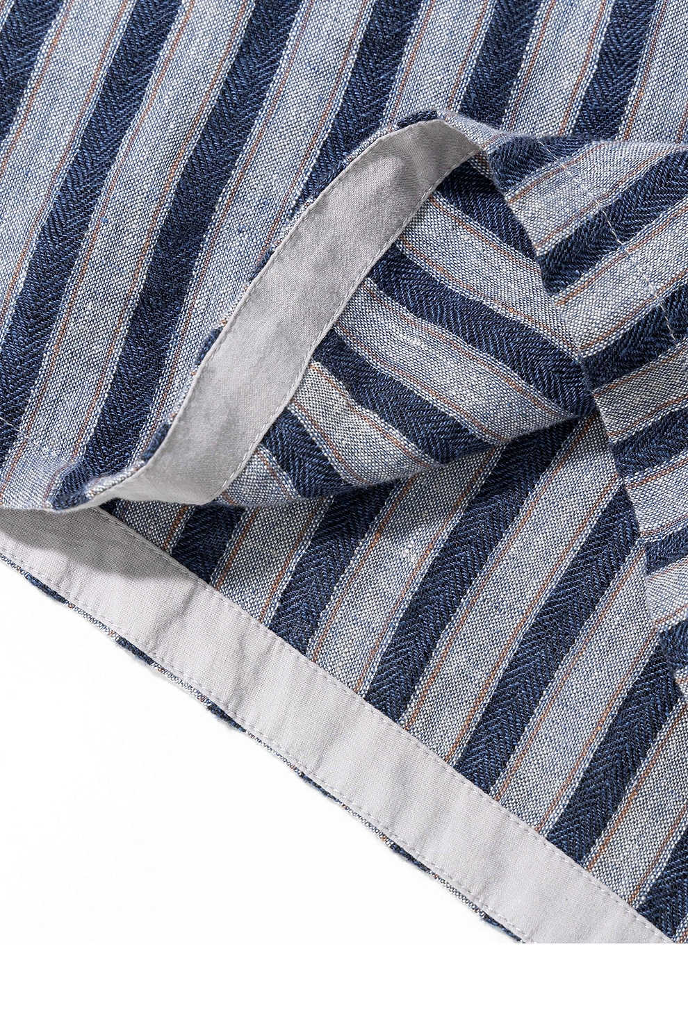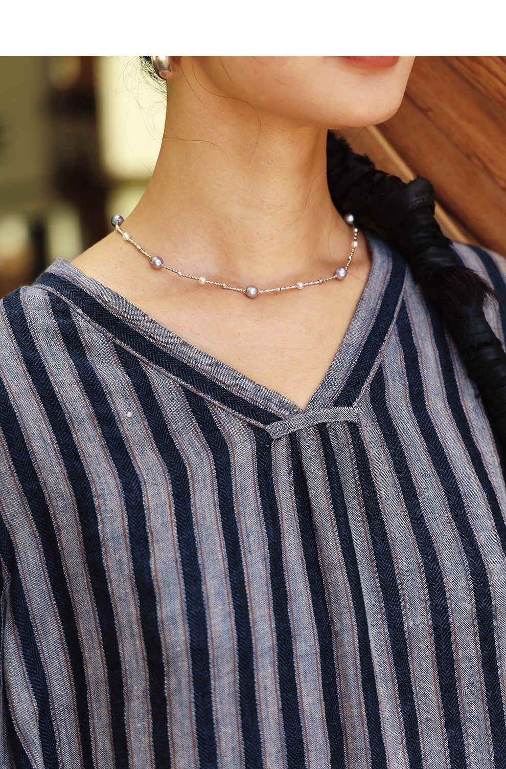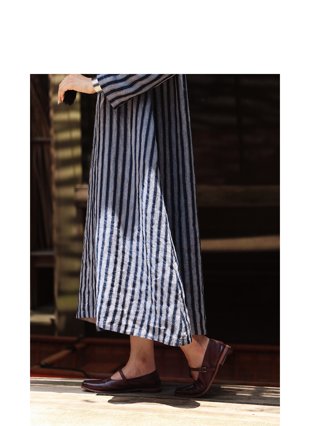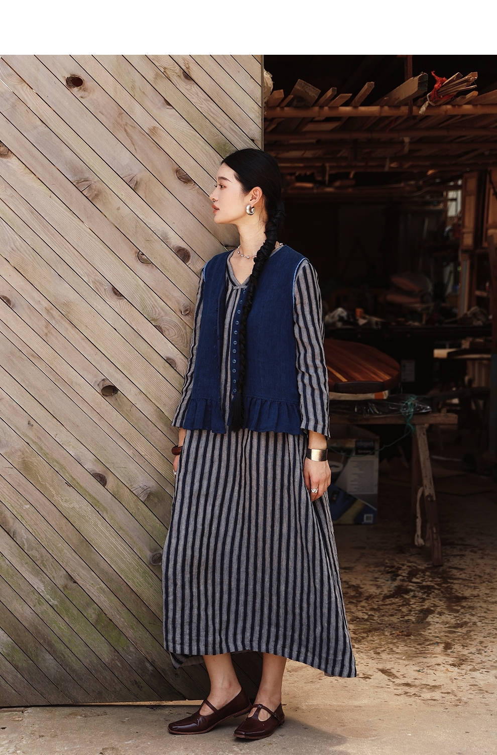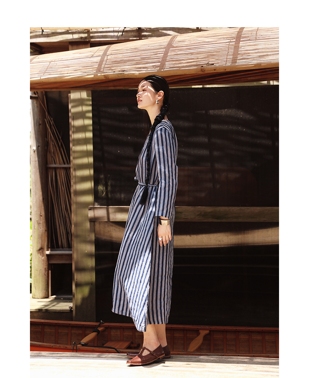 绽放旅行女装501朵/【大山的褶皱】色织条纹V领正常肩长袖连衣裙