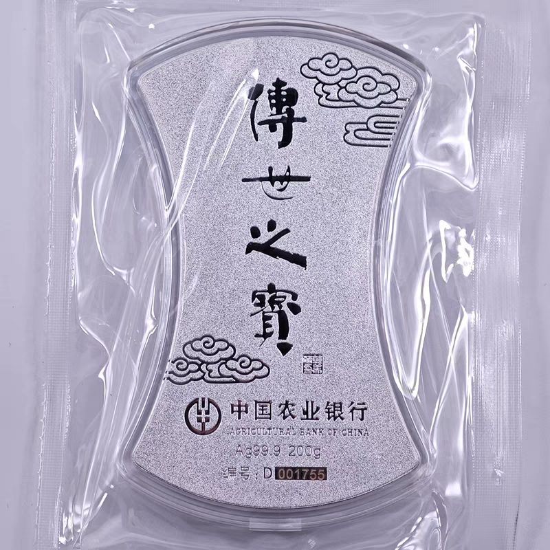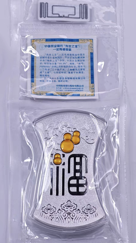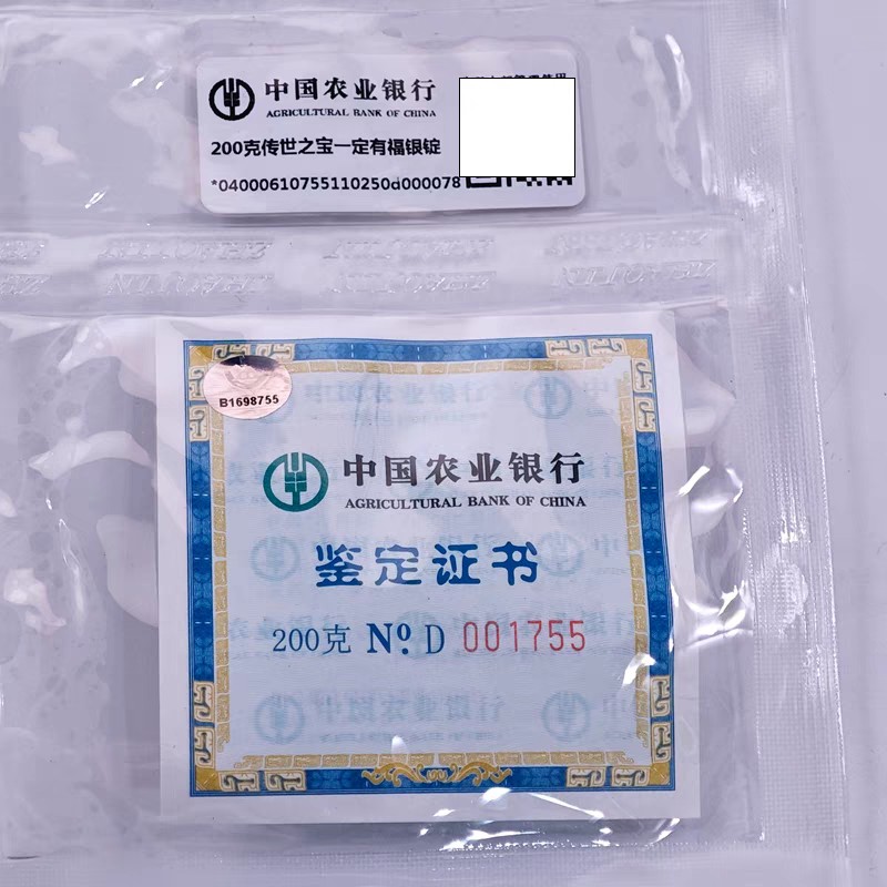 银锭正面还刻有中国农业银行名称和标志,并标注了成色和克重,同时还贴有防伪标签,永久保真!