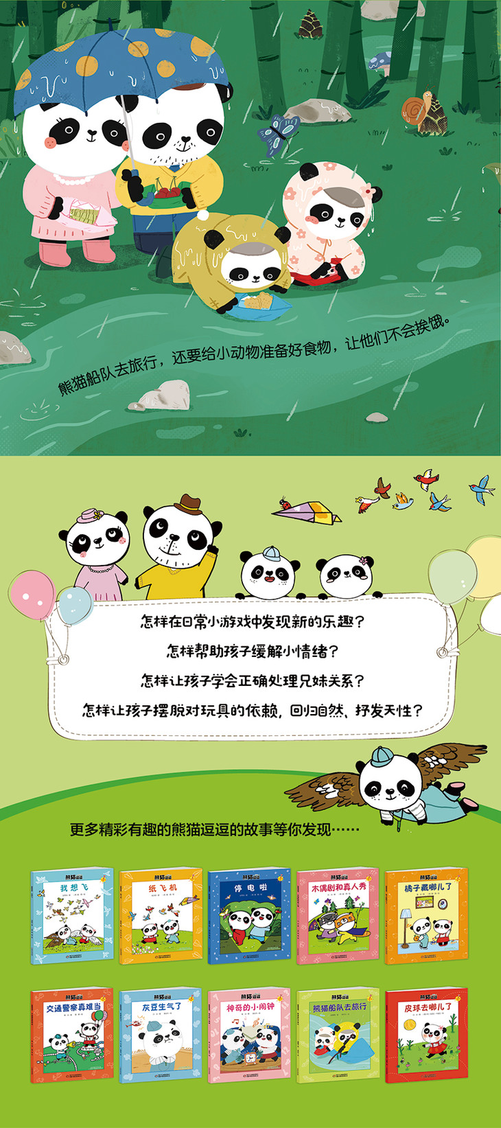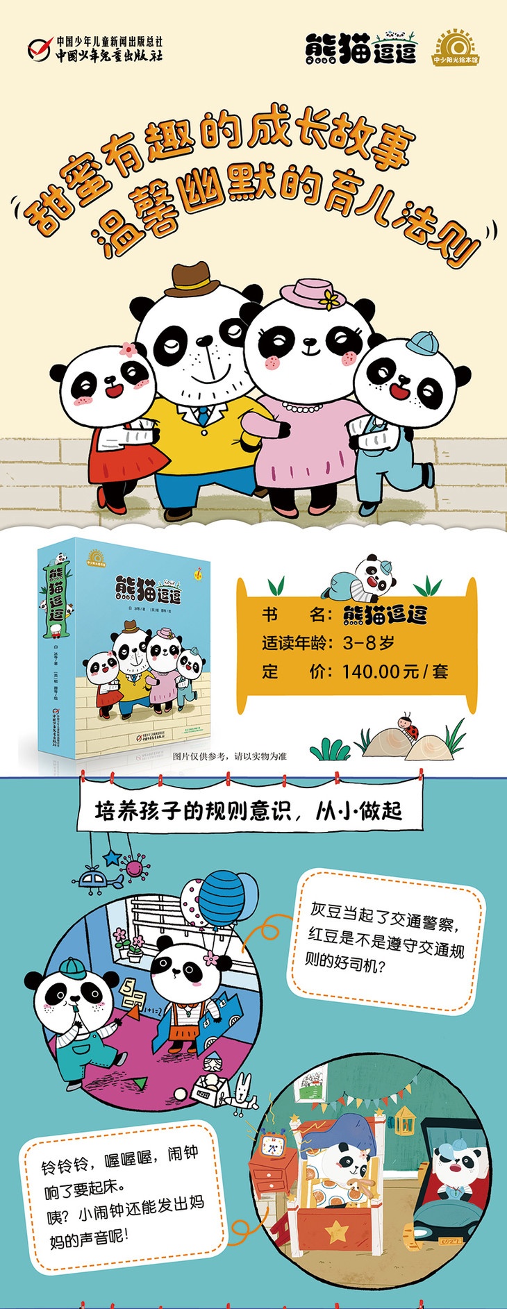 《熊猫逗逗》系列收录了10本图书,每一册都是一个温馨的家庭教育小故事,故事简单有趣,同时每个故事背后都蕴含家庭教育的深意。这套书围绕灰豆和他的家庭成员:黑豆爸爸、白豆妈妈和红豆妹妹展开。旨在通过幽默温馨的小故事传达优秀的家庭教育观念,引导家长正确教育孩子,缔造温馨欢乐的家庭气氛、给予孩子温柔耐心地指导,让孩子健康成长。
