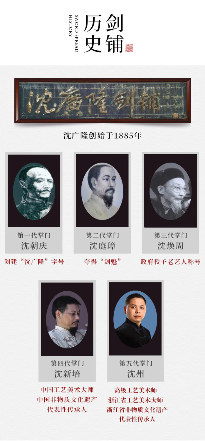 - 龙泉沈广隆剑舖创始于1885年(清光绪)位于浙江省龙泉市,是当地唯一一家“子承父业”一脉相承的中华老字号宝剑生产企业,是国家级非物质文化遗产龙泉宝剑项目保护单位,并以“天下第一剑”闻名于海内外....