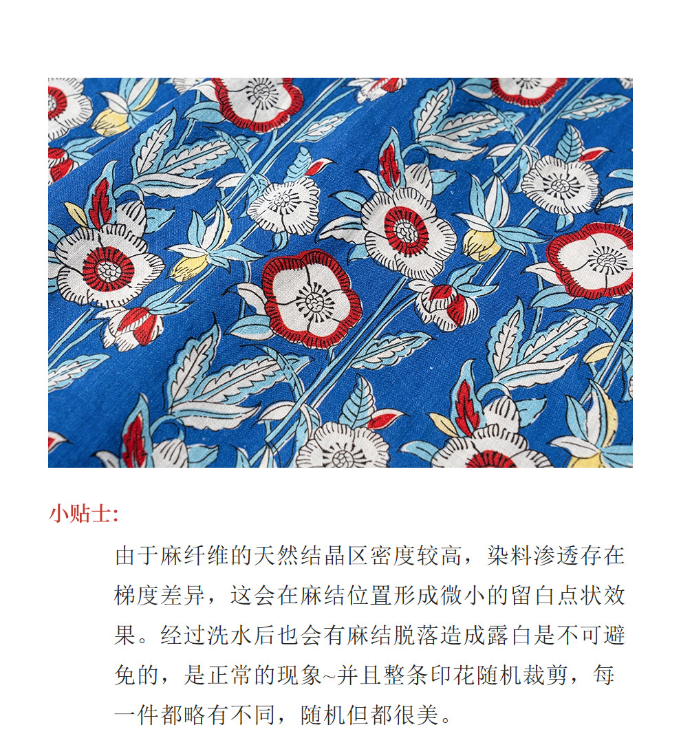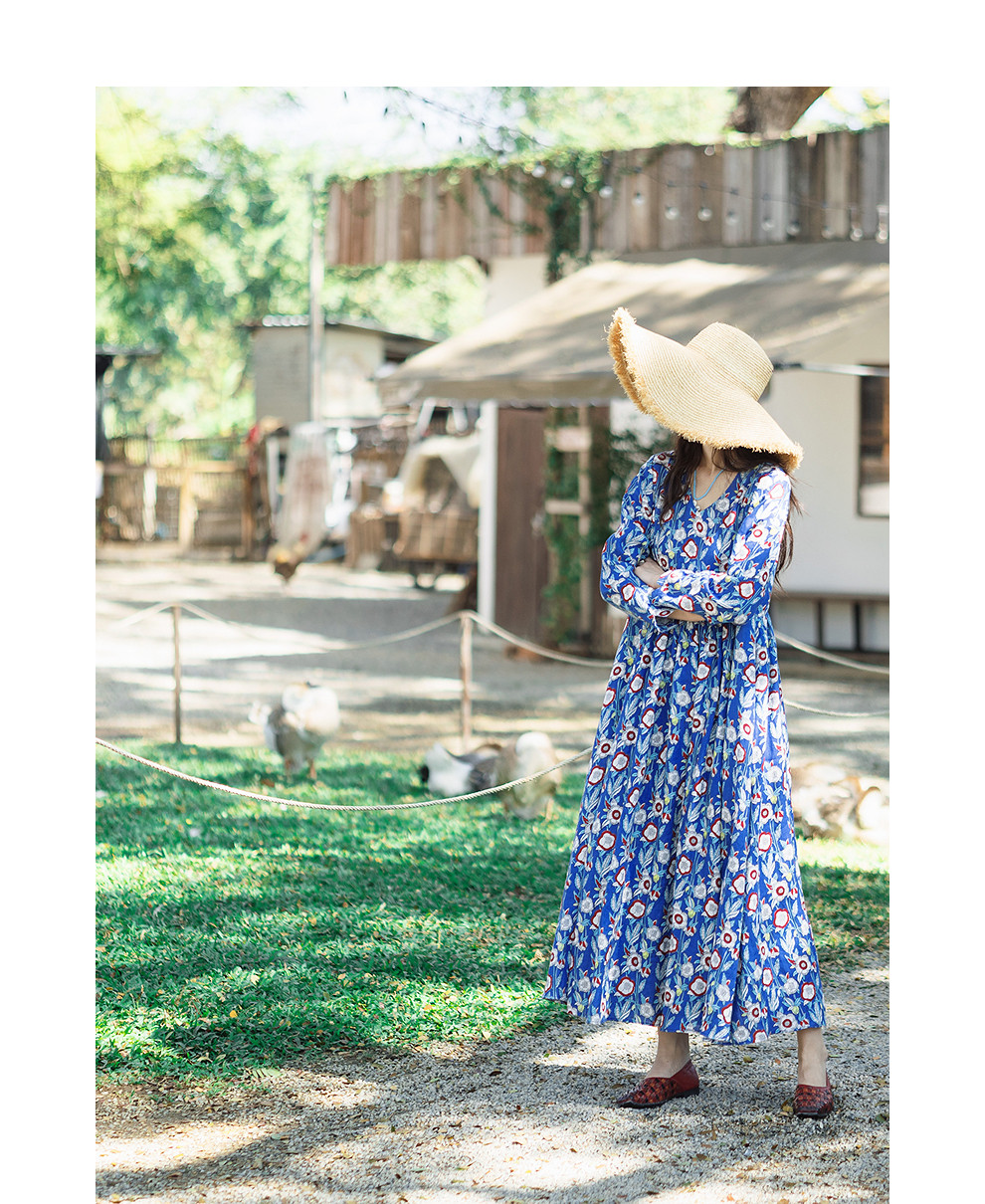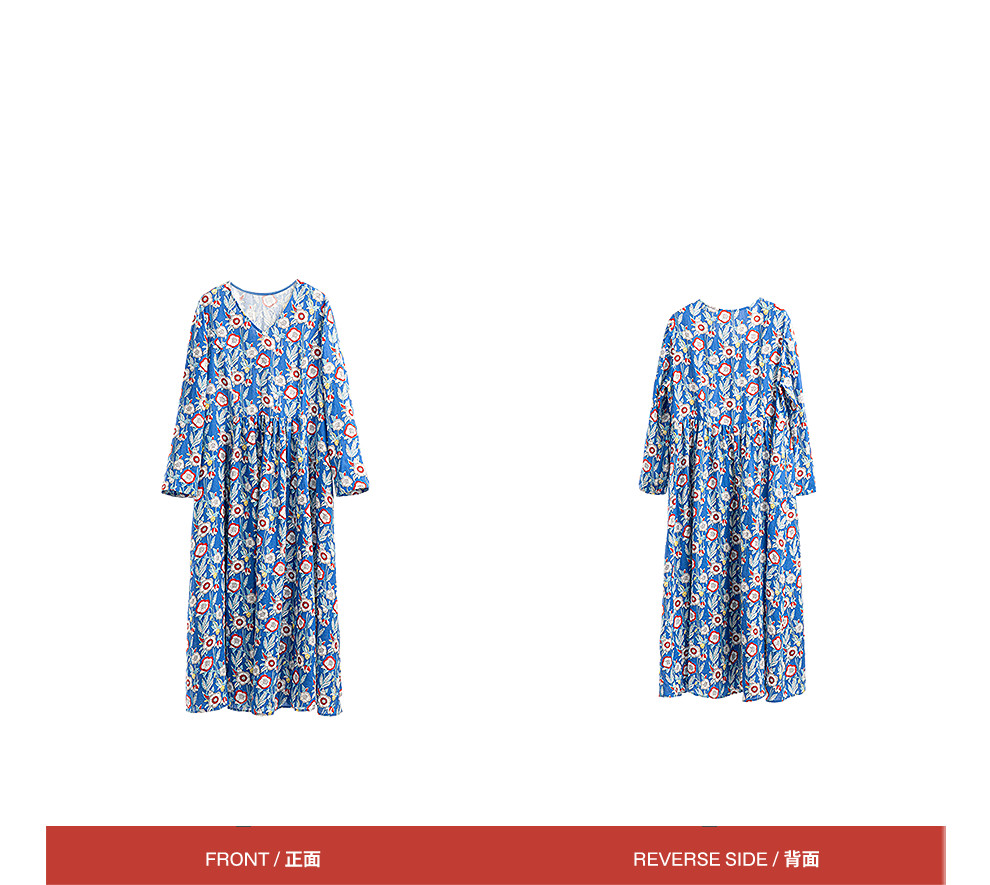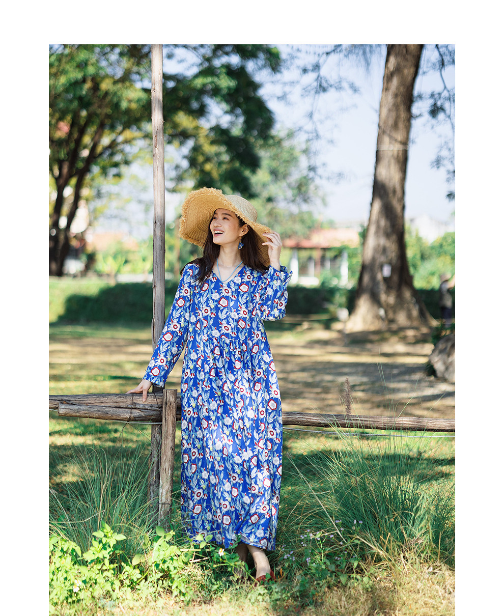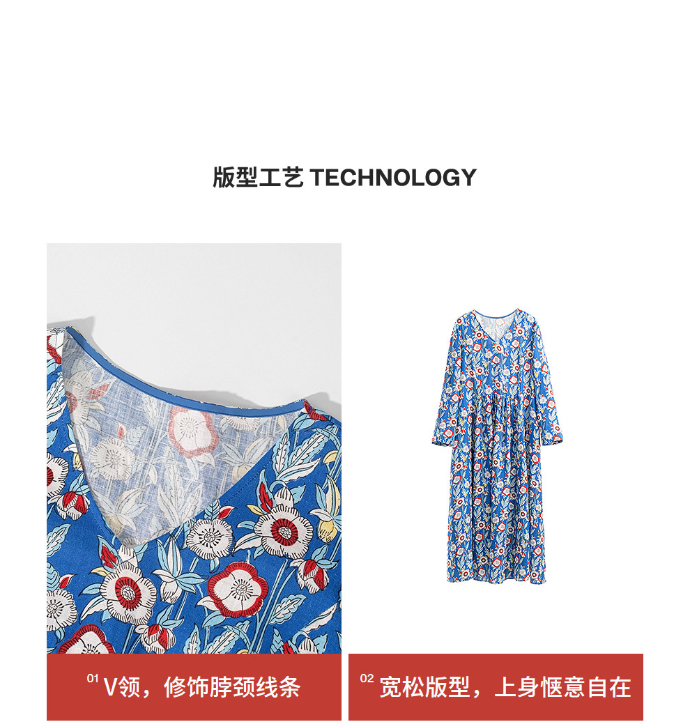 绽放122朵/重磅亚麻数码印花V领长袖连衣裙女春新款百搭大摆长裙