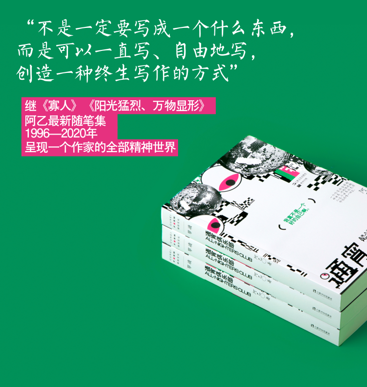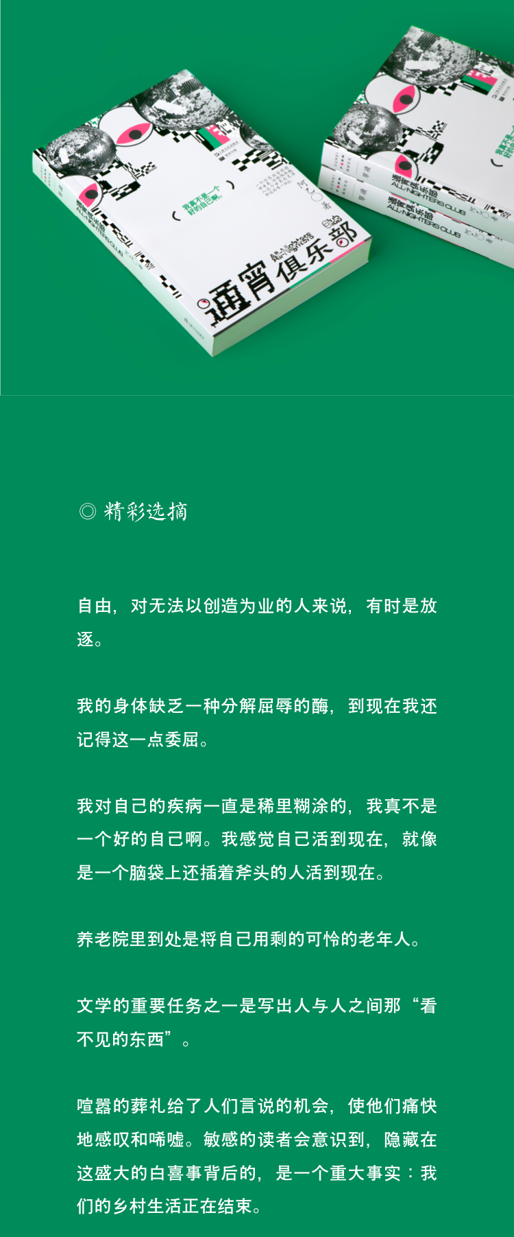 书名:通宵俱乐部 出版社:上海文艺出版社 责任编辑:肖海鸥 特约编辑:赵芳罗丹妮 书号: 978-7-5321-8302-9 出版时间:2022.10 定价:58.00元 装帧:平装 开本:32 尺寸:850mm * 1092mm 纸张:胶版纸