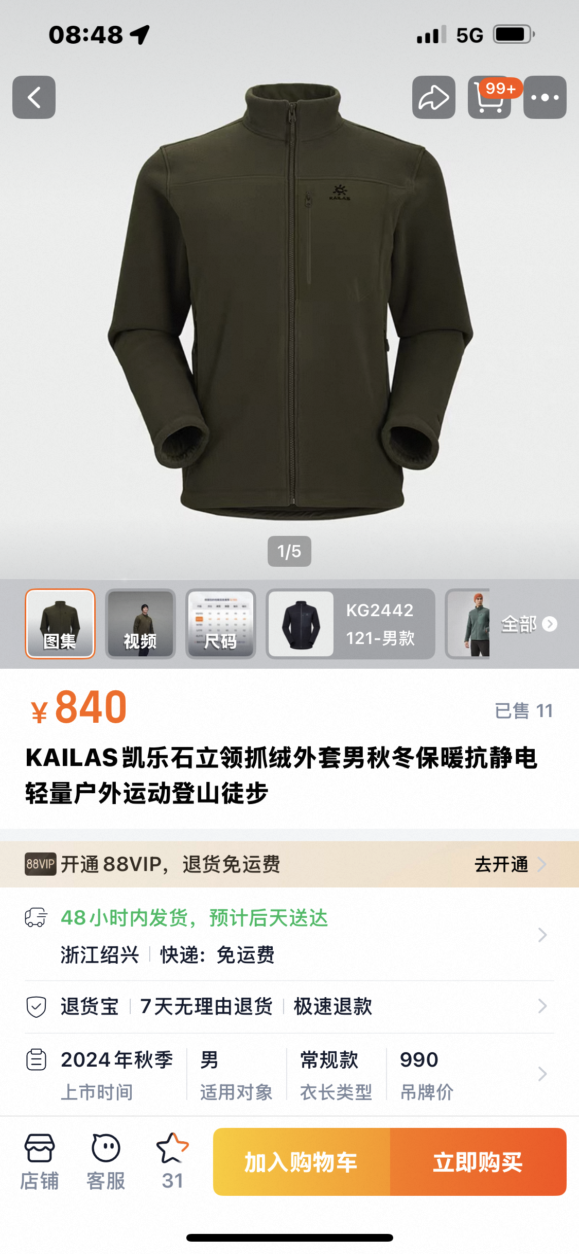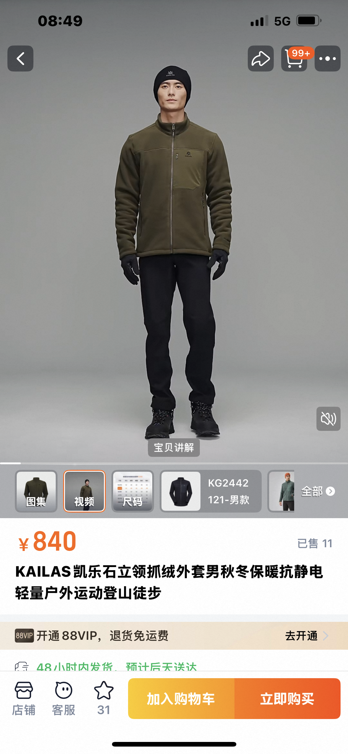 KAILAS凯乐石立领抓绒外套 男秋冬保暖抗静电轻量户外运动外套! 太阳毛毛