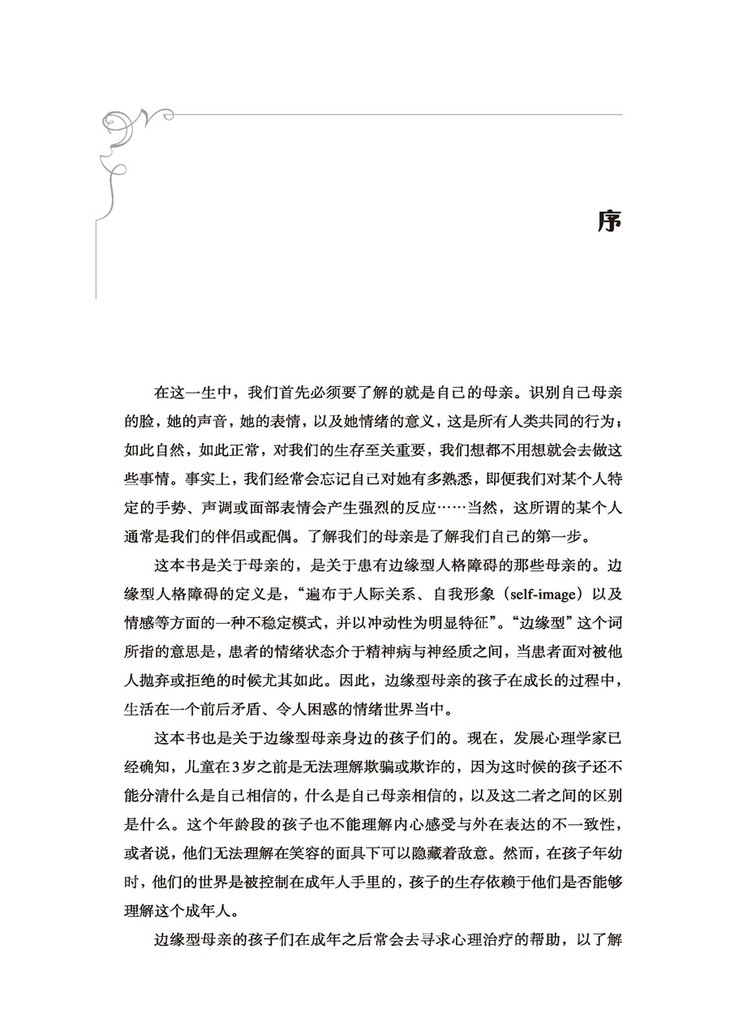 想象一下,你的母亲从未教过你走路,甚至不让你知道什么是走路,以致你40年的人生都在爬行。同理,在边缘型母亲身边长大的我,不会爱人,也不会信任人。而这本书让我看清自己成长过程中缺失的是什么,以及我现在可以如何去弥补,从而靠近有爱、有信任的正常人生。