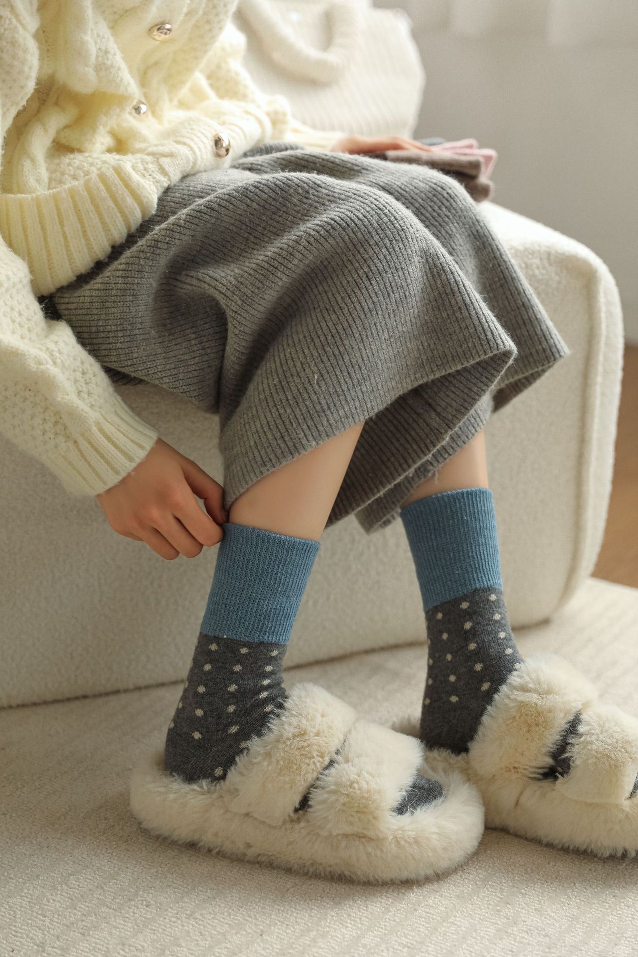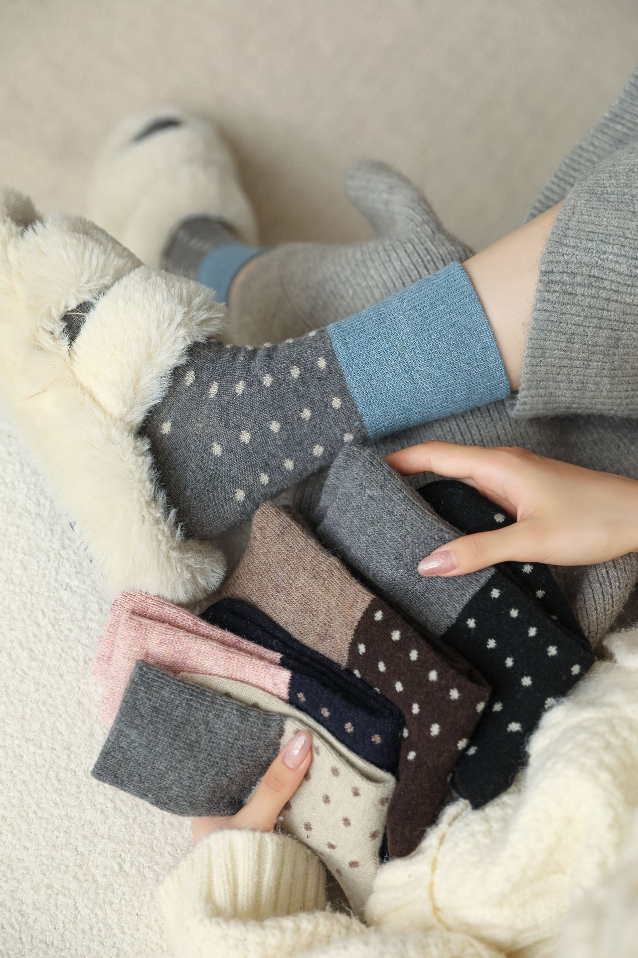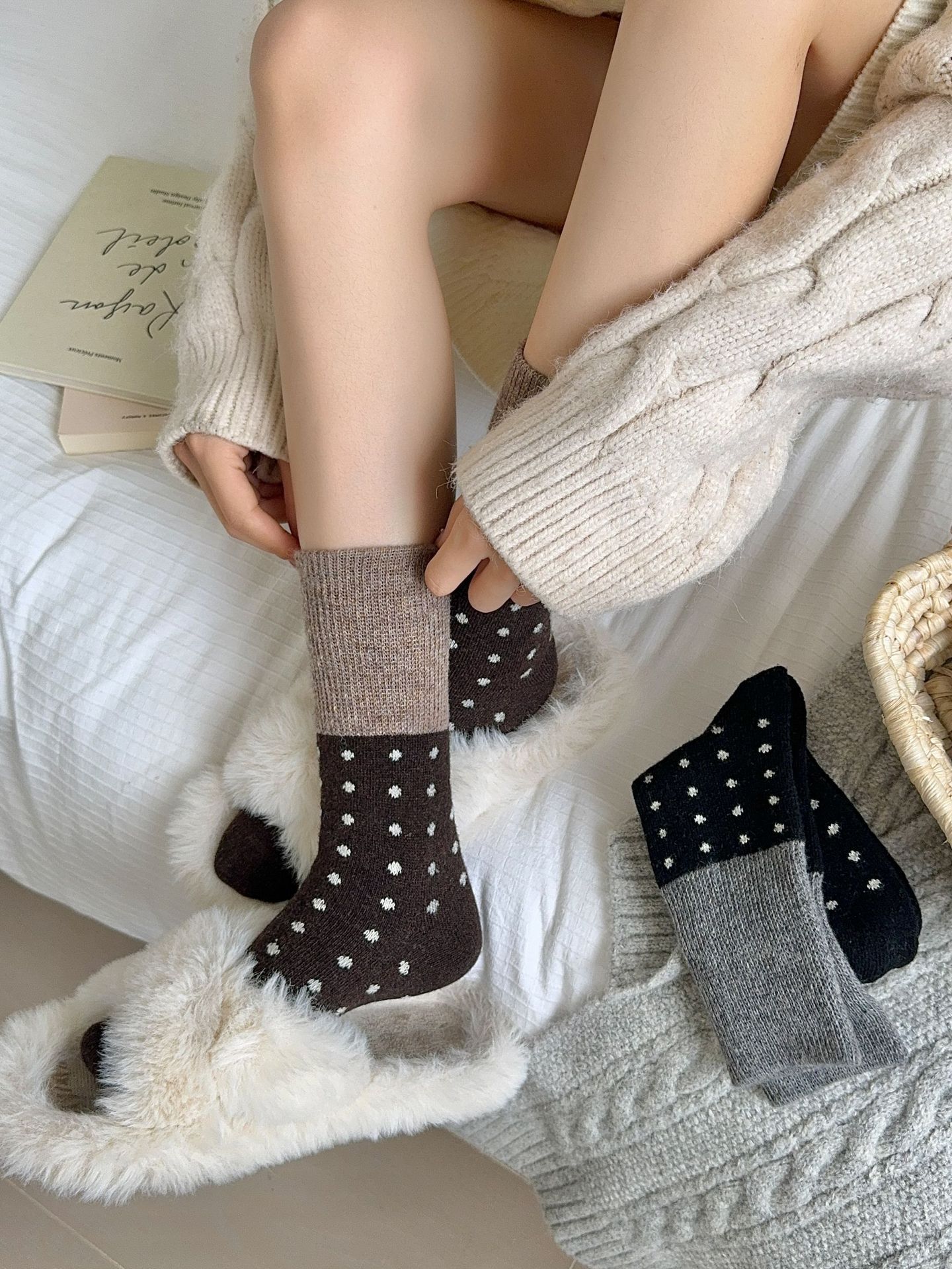 【3双超值!秋冬加厚拼色波点袜】秋冬加厚保暖羊毛拼色小波点袜,加绒加厚透气不闷,撞色男中筒堆堆袜子女日系复古诸暨QQ