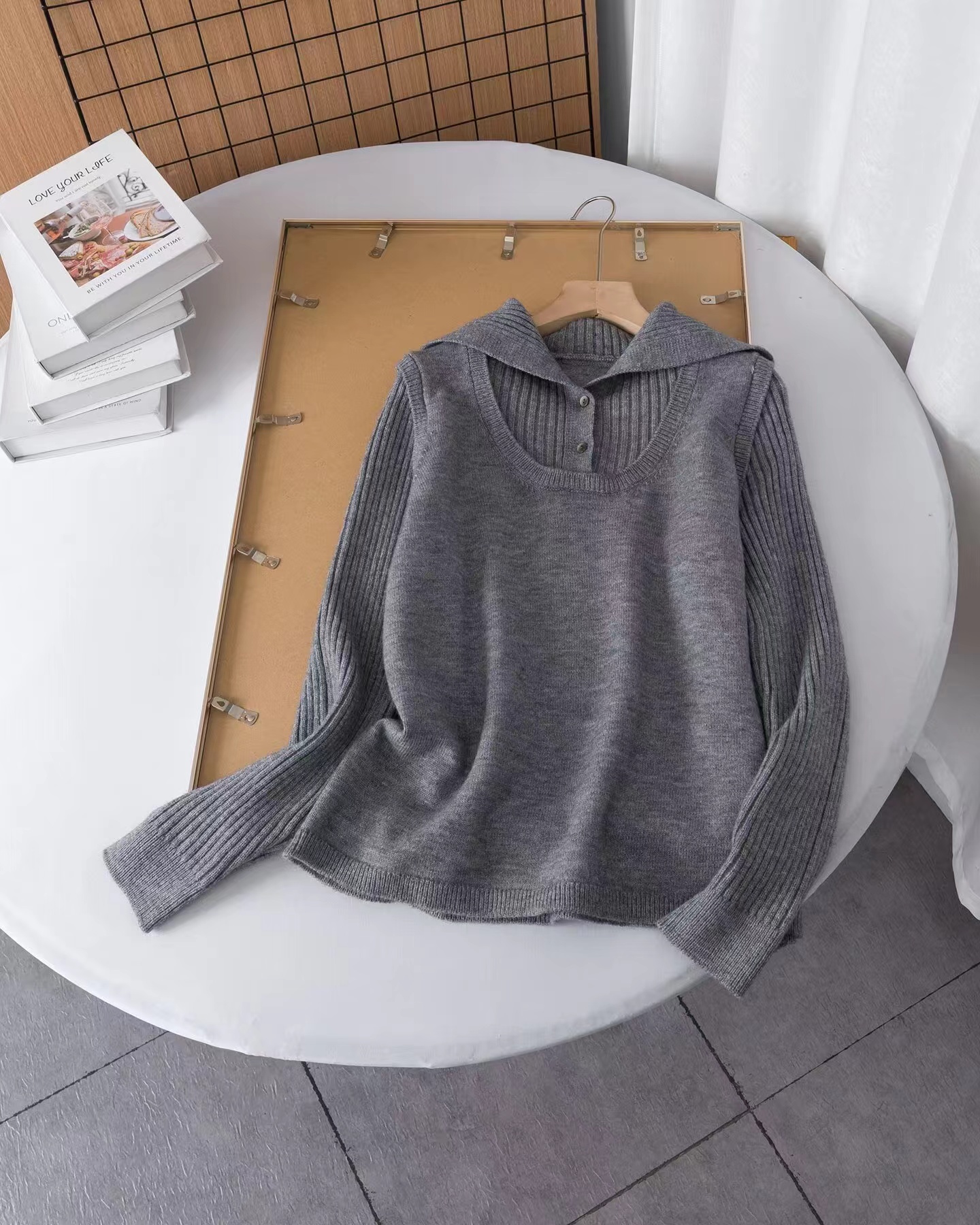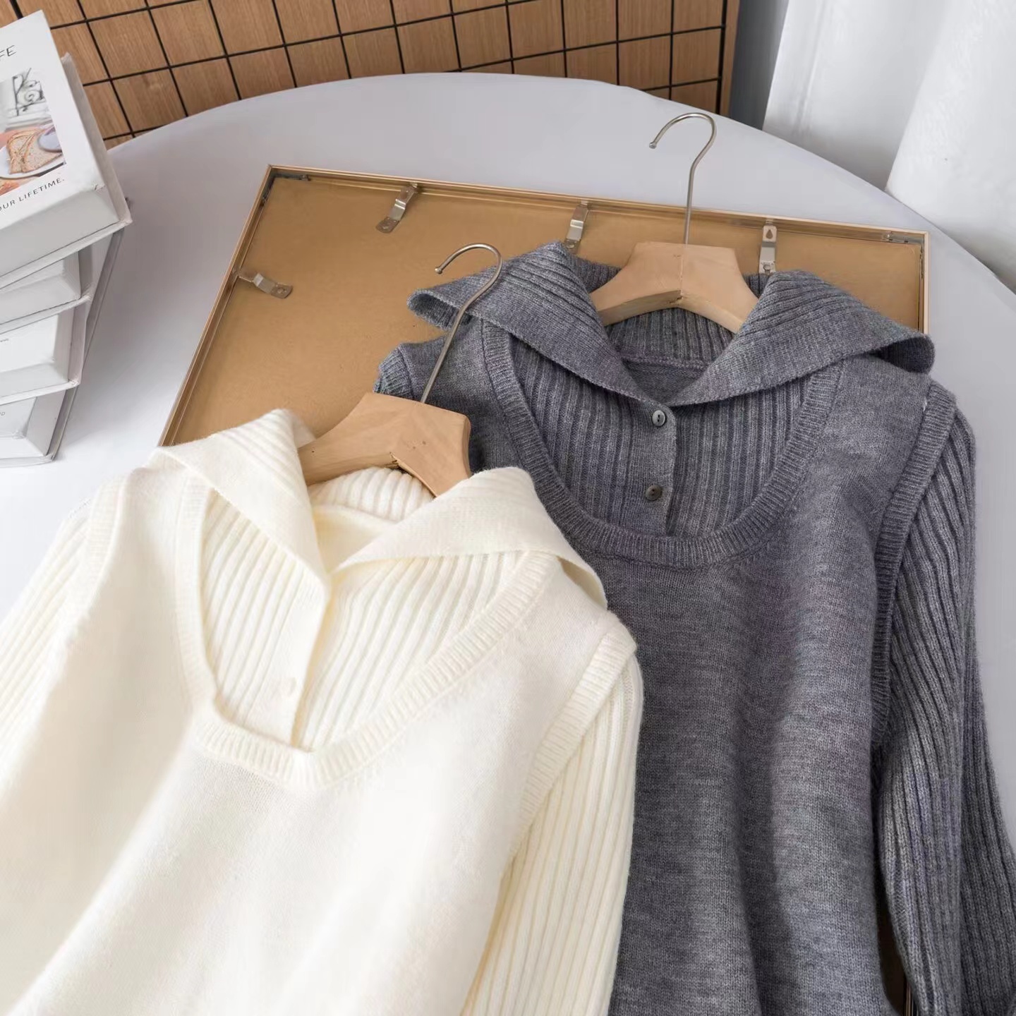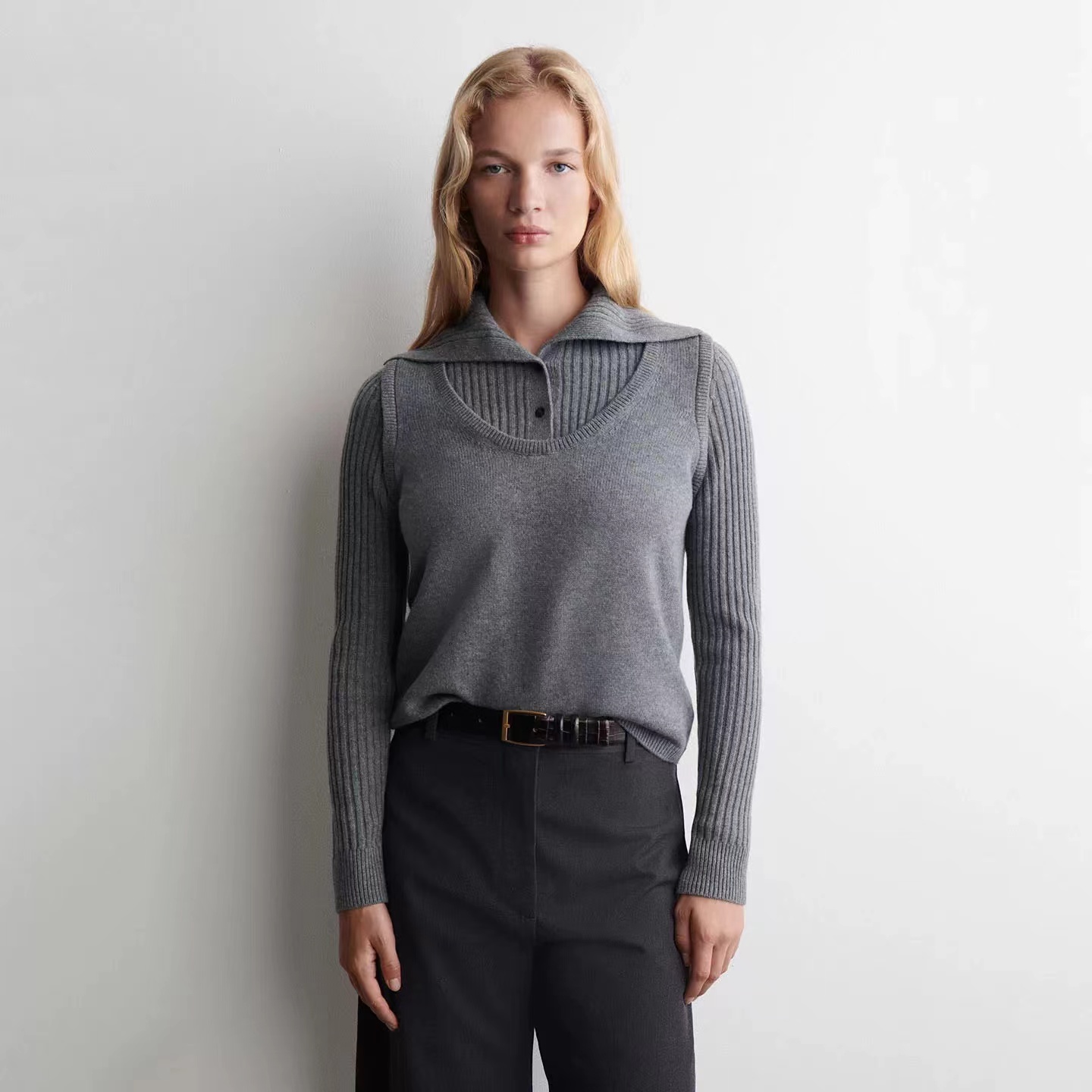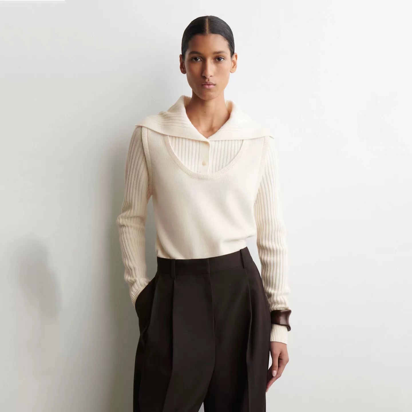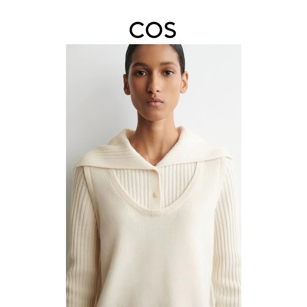 罗纹翻领长袖拼接假两件设计纽扣半开襟毛衣上衣小众设计感毛衣套衫,领子及袖子部分罗纹编织拼接与大身带出造型层次感 领子可高领可翻领穿,纽扣半开襟套头 版型小宽松,松量舒shi,很显瘦 假两件设计上身时髦洋气 面料手感软糯,有的小筋骨感,弹力不紧绷,贴肤不扎