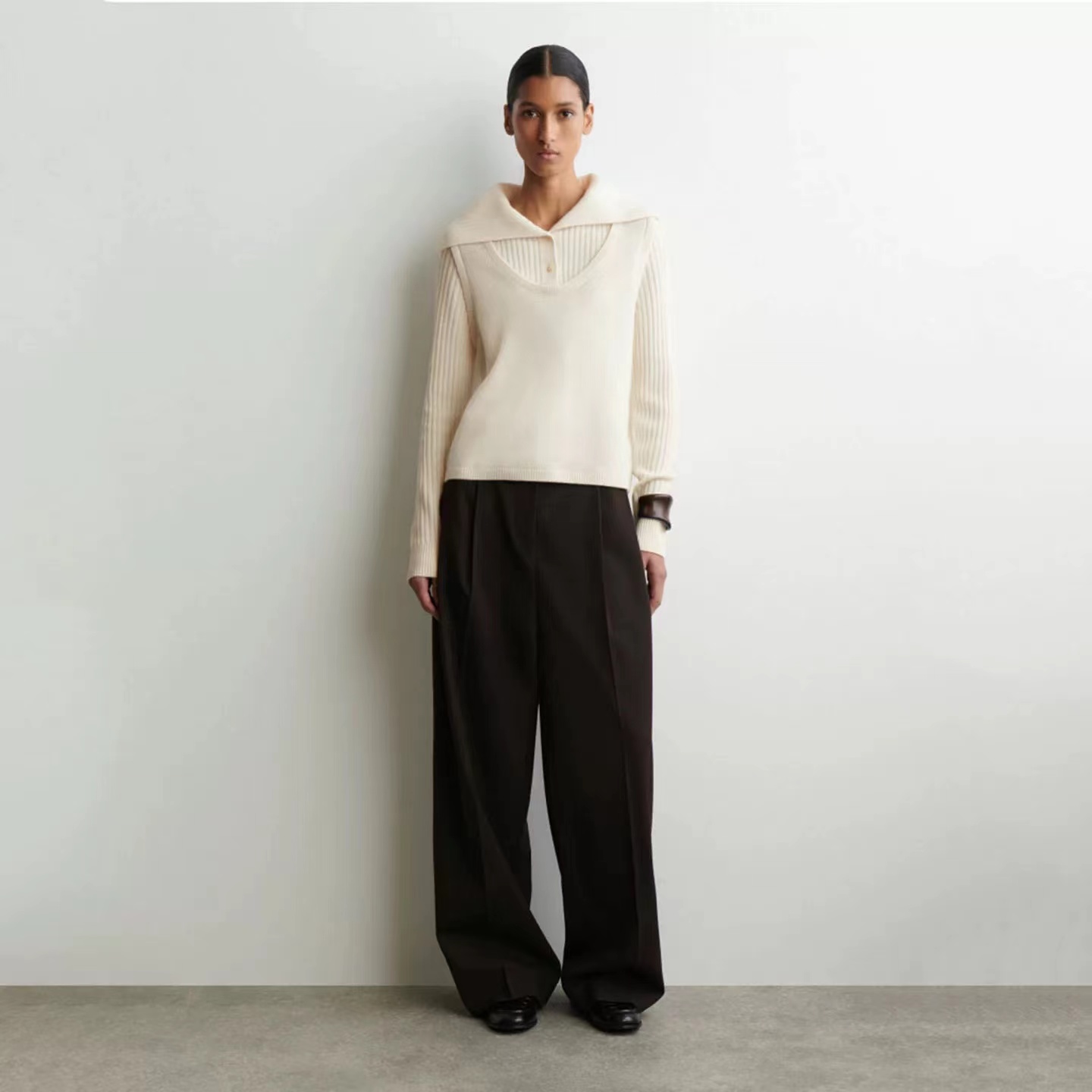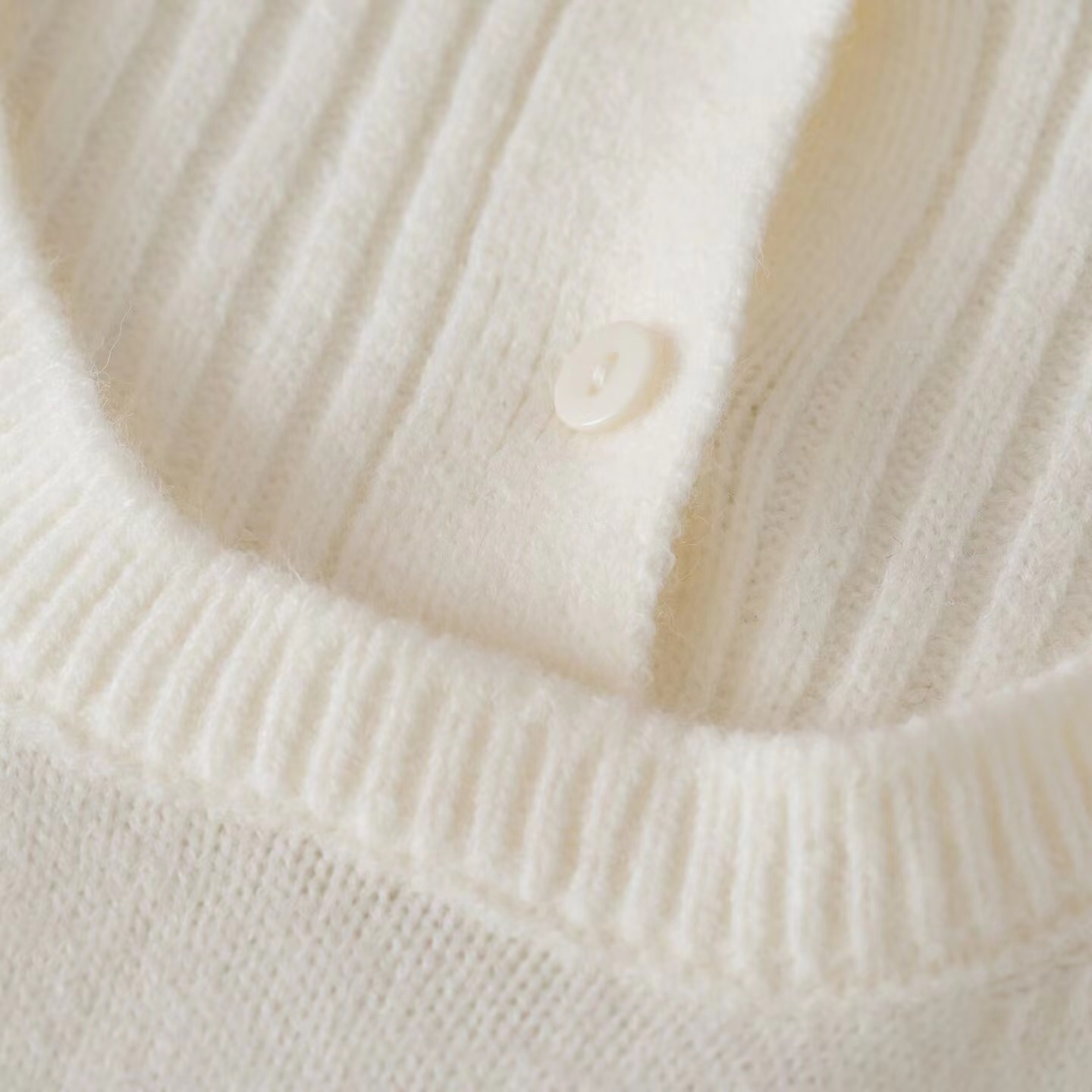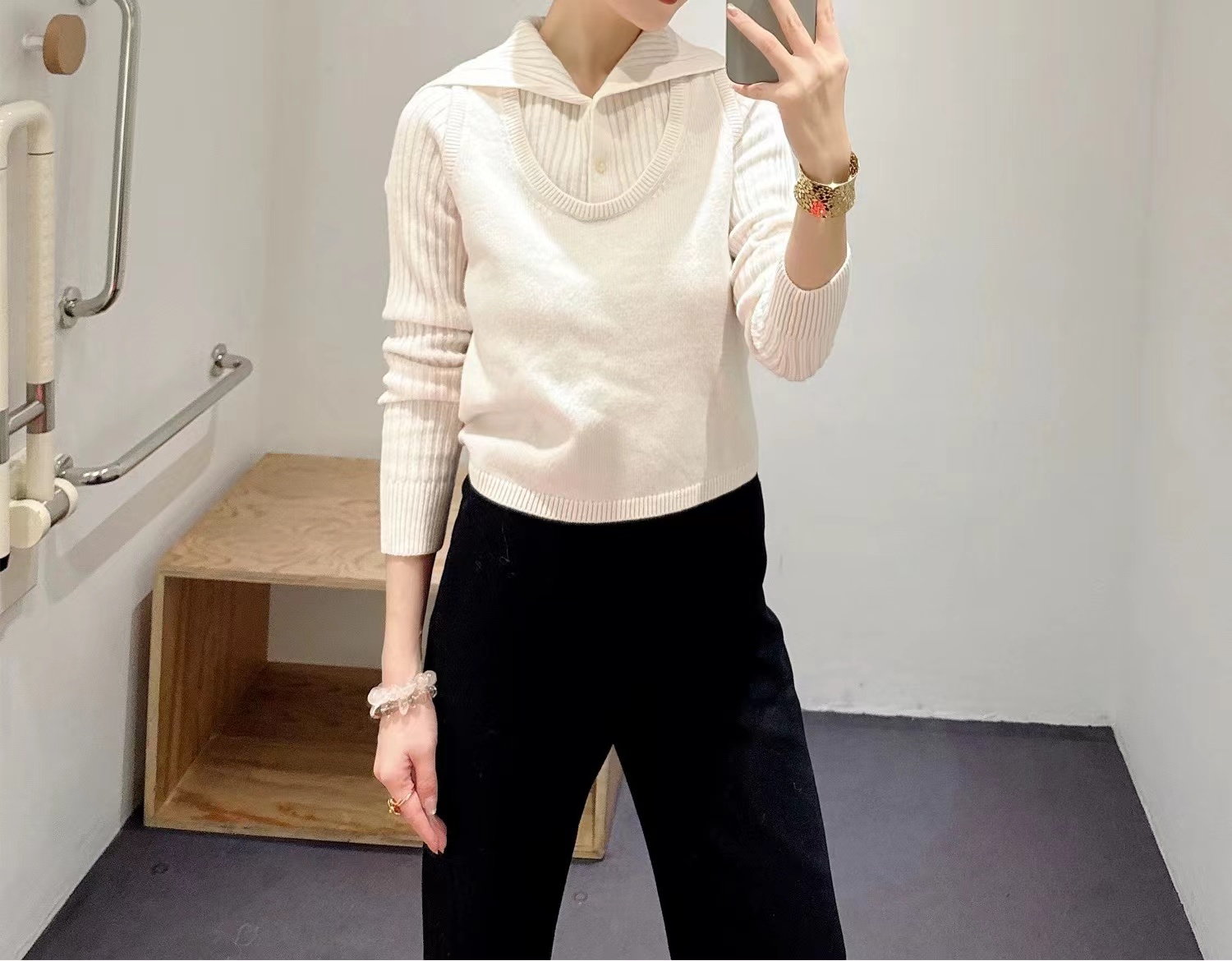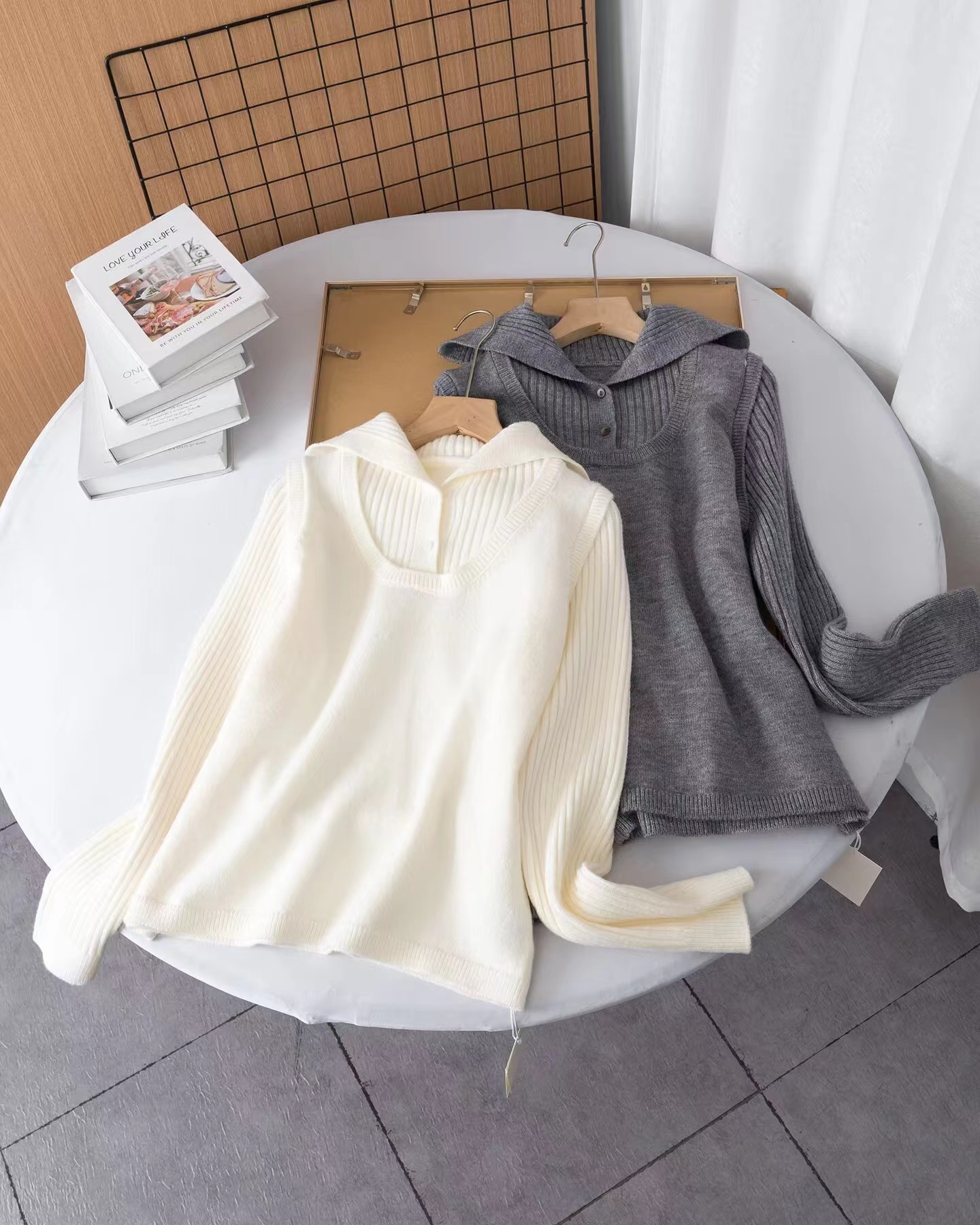 罗纹翻领长袖拼接假两件设计纽扣半开襟毛衣上衣小众设计感毛衣套衫,领子及袖子部分罗纹编织拼接与大身带出造型层次感 领子可高领可翻领穿,纽扣半开襟套头 版型小宽松,松量舒shi,很显瘦 假两件设计上身时髦洋气 面料手感软糯,有的小筋骨感,弹力不紧绷,贴肤不扎