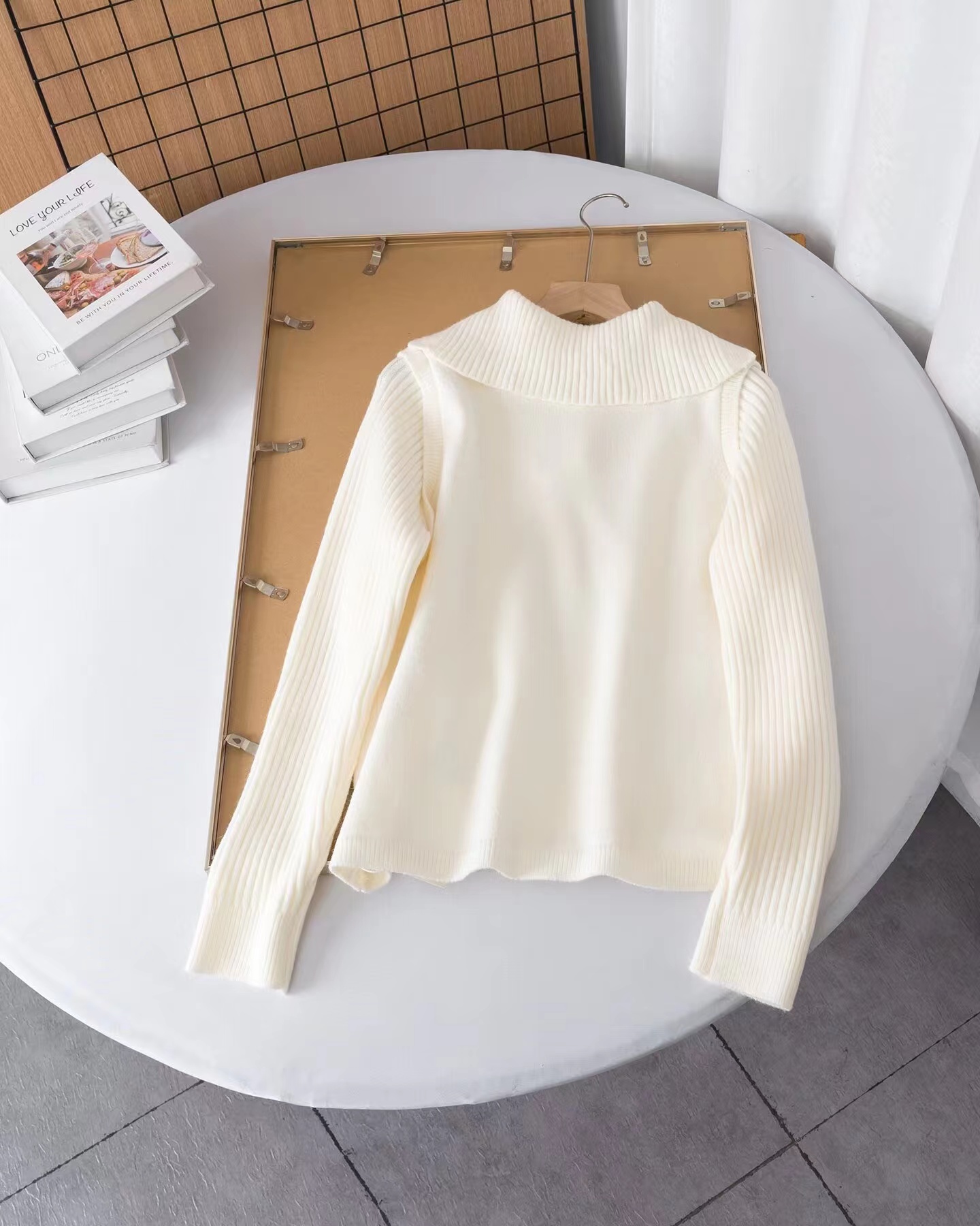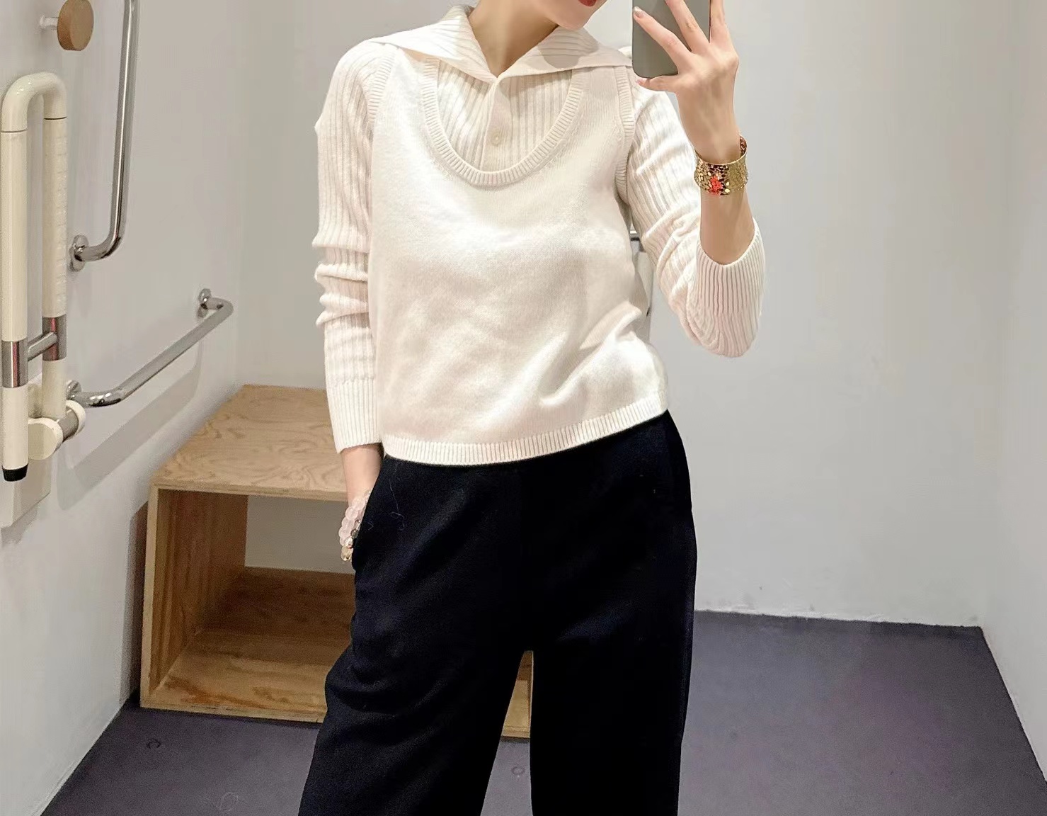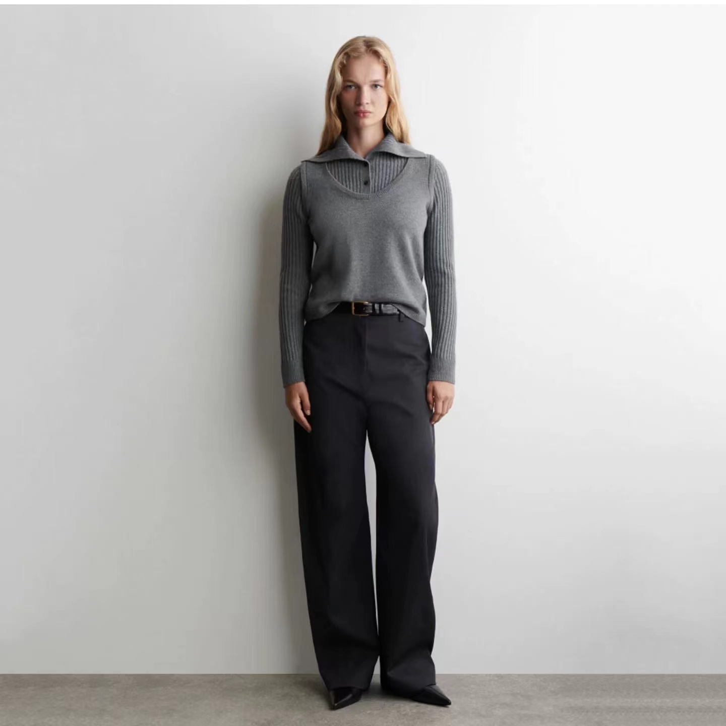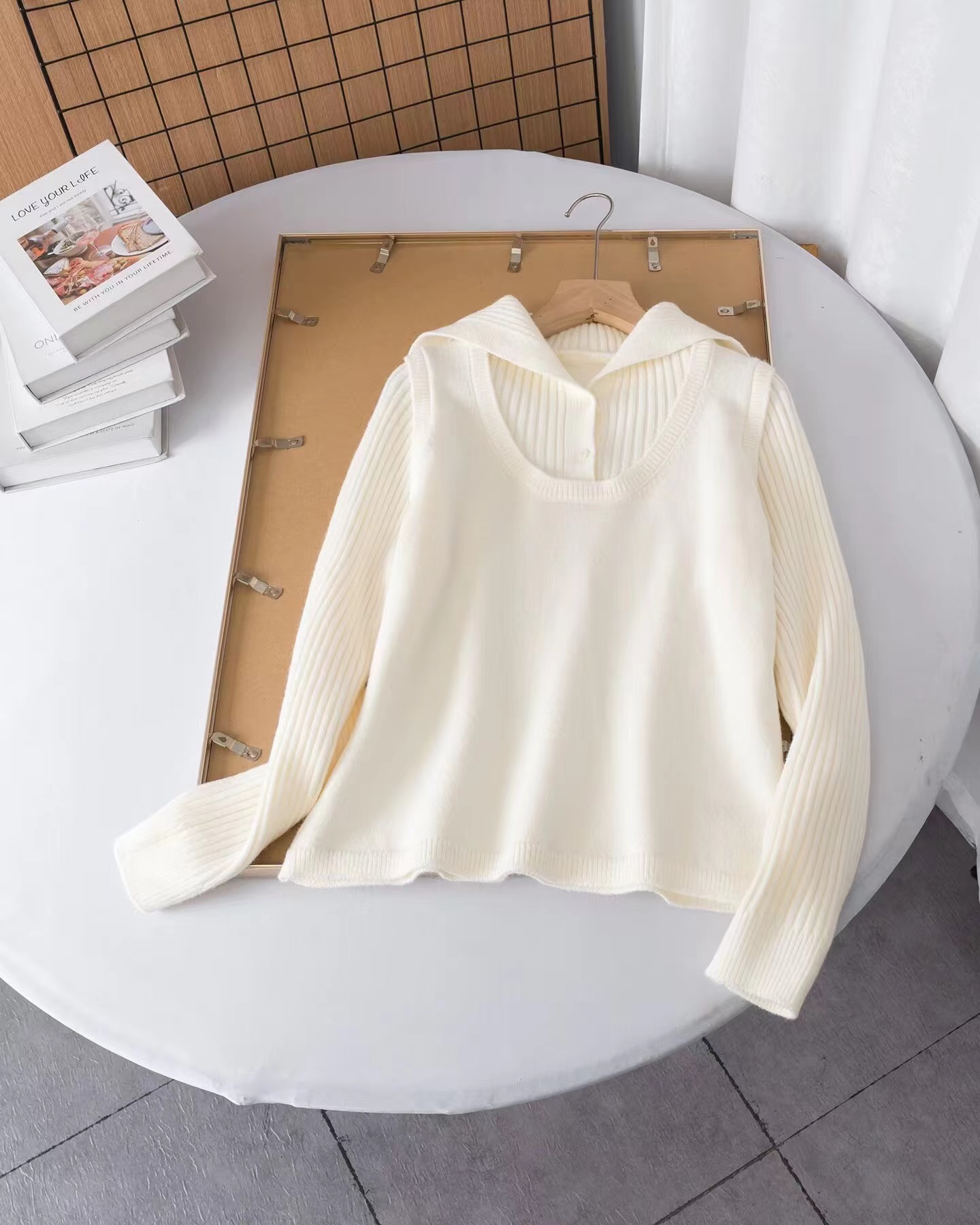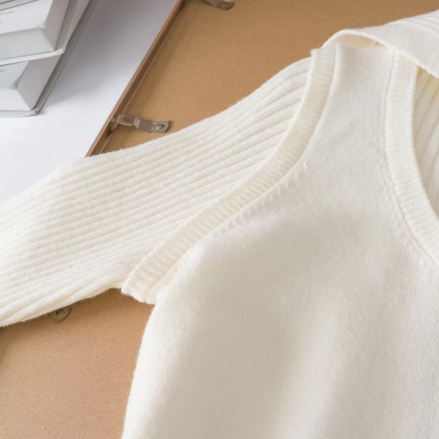 罗纹翻领长袖拼接假两件设计纽扣半开襟毛衣上衣小众设计感毛衣套衫,领子及袖子部分罗纹编织拼接与大身带出造型层次感 领子可高领可翻领穿,纽扣半开襟套头 版型小宽松,松量舒shi,很显瘦 假两件设计上身时髦洋气 面料手感软糯,有的小筋骨感,弹力不紧绷,贴肤不扎