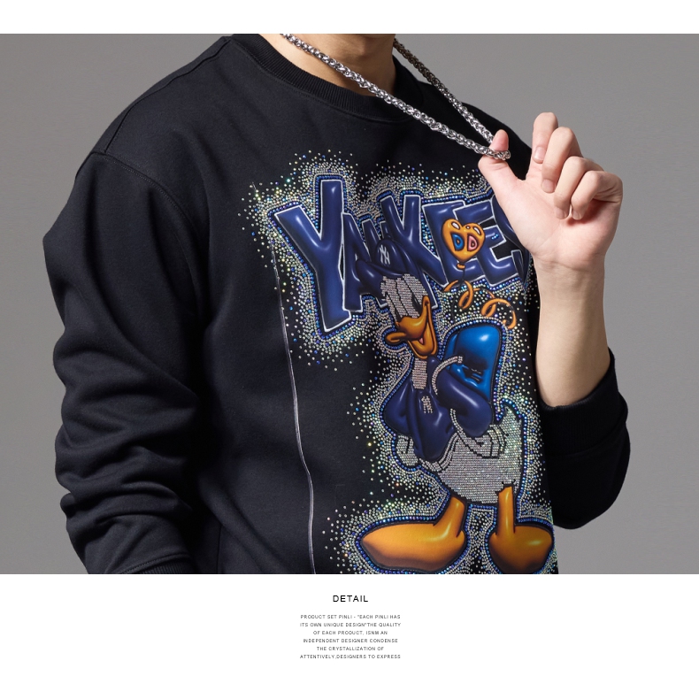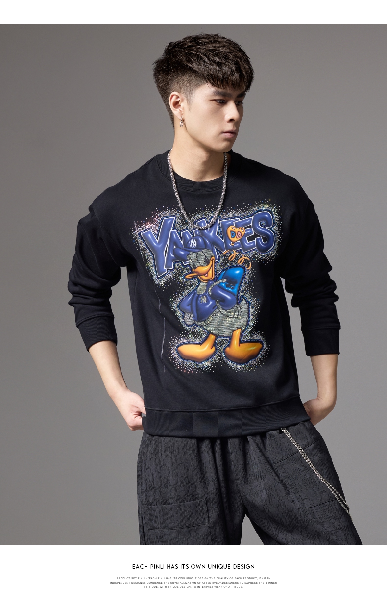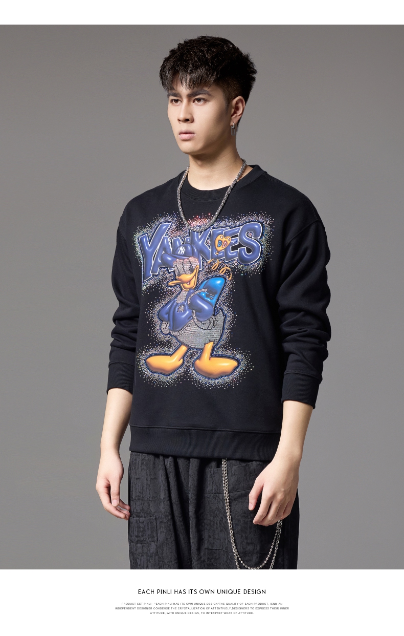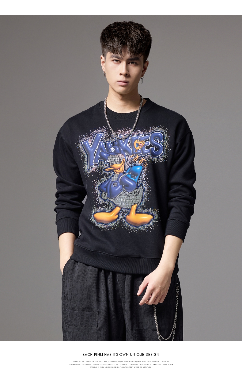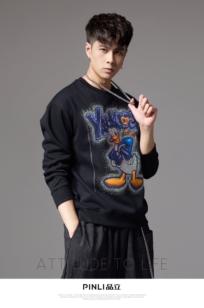 PINLI品立2024秋季新款男装圆领宽松落肩字母卡通烫钻套头卫衣潮BG243109032