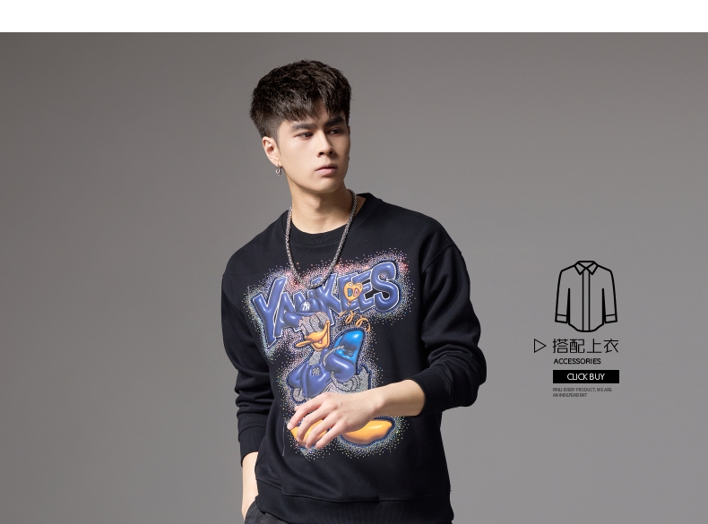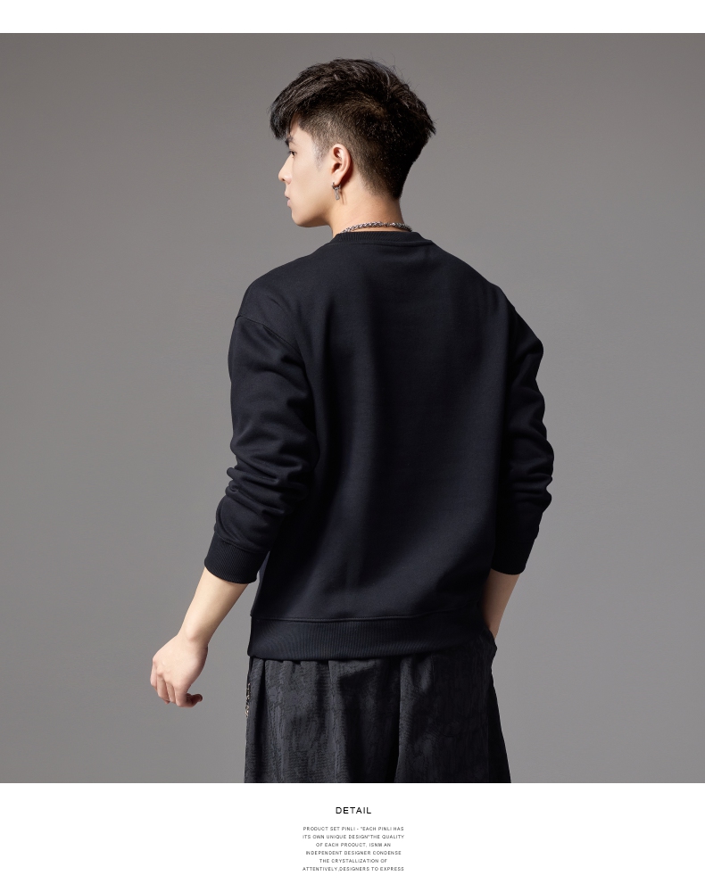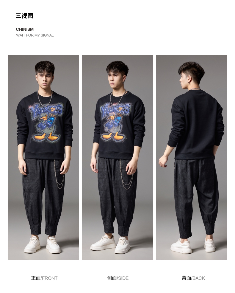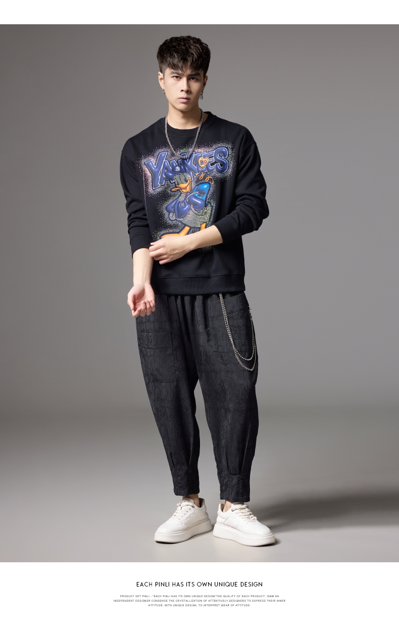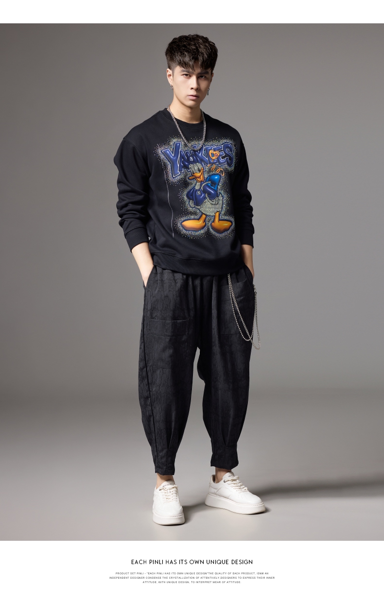 PINLI品立2024秋季新款男装圆领宽松落肩字母卡通烫钻套头卫衣潮BG243109032