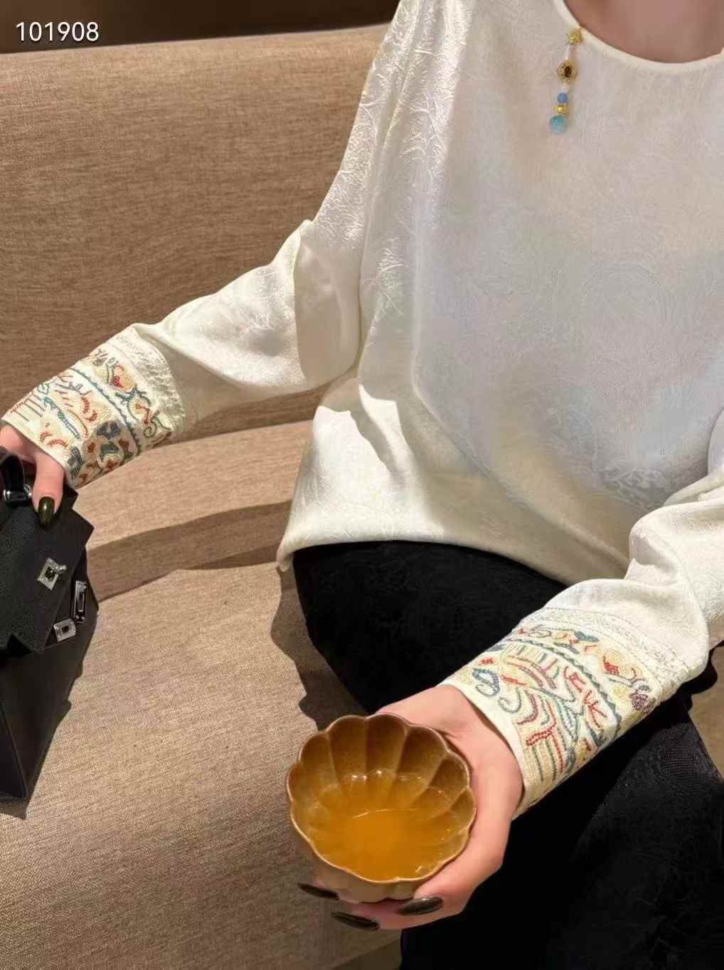 暗花纹袖口重工刺绣国风长袖衫 9621020010