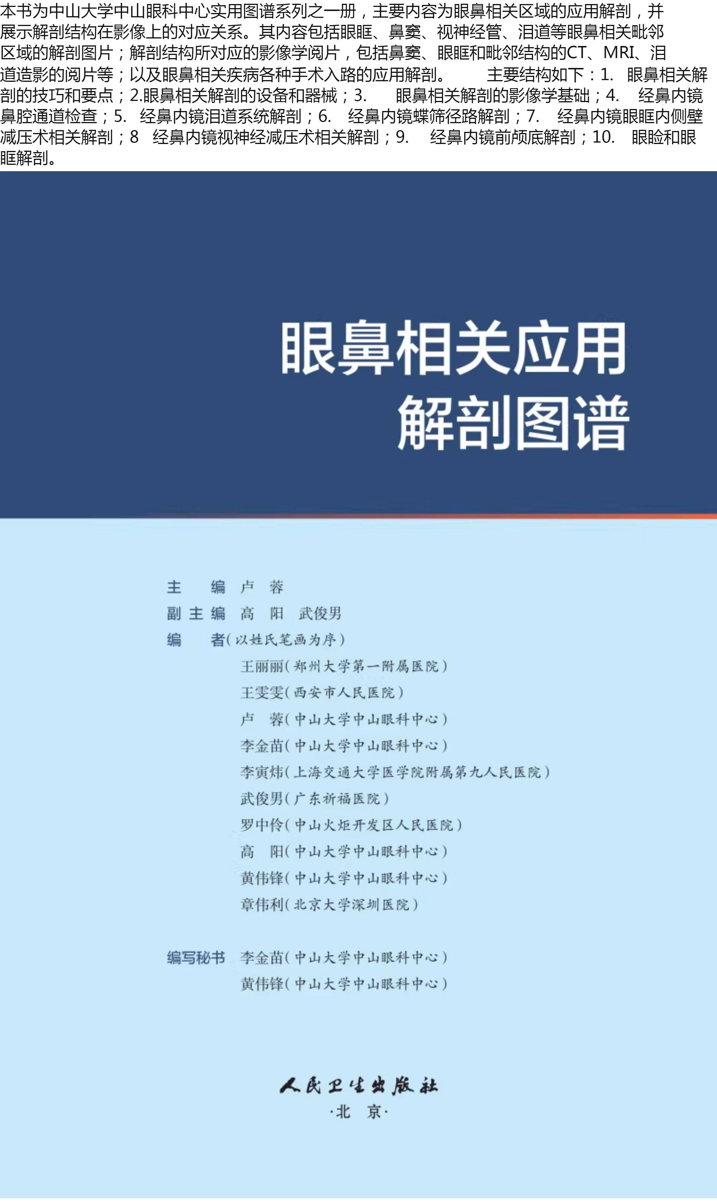 本书为中山大学中山眼科中心实用图谱系列之一册,主要内容为眼鼻相关区域的应用解剖,并展示解剖结构在影像上的对应关系。其内容包括眼眶、鼻窦、视神经管、泪道等眼鼻相关毗邻区域的解剖图片;解剖结构所对应的影像学阅片,包括鼻窦、眼眶和毗邻结构的CT、MRI、泪道造影的阅片等;以及眼鼻相关疾病各种手术入路的应用解剖。主要结构如下:1.眼鼻相关解剖的技巧和要点;2.眼鼻相关解剖的设备和器械;3.眼鼻相关解剖的影像学基础;4.经鼻内镜鼻腔通道检查;5.经鼻内镜泪道系统解剖;6.经鼻内镜蝶筛径路解剖;7.经鼻内镜眼眶内侧壁减压术相关解剖;8 经鼻内镜视神经减压术相关解剖;9.经鼻内镜前颅底解剖;10.眼睑和眼眶解剖。