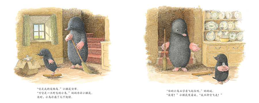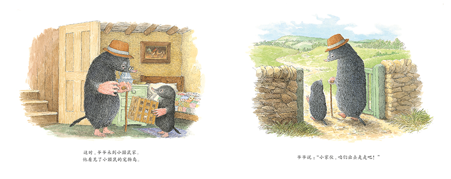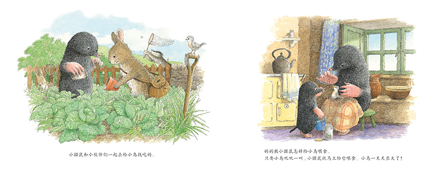这本书的作者用简单的故事让我们了解到成长的烦恼,小鼹鼠要承担宠物护理的责任,小鸟失去自由的痛苦,小鼹鼠祖父对小鼹鼠的细心引导。