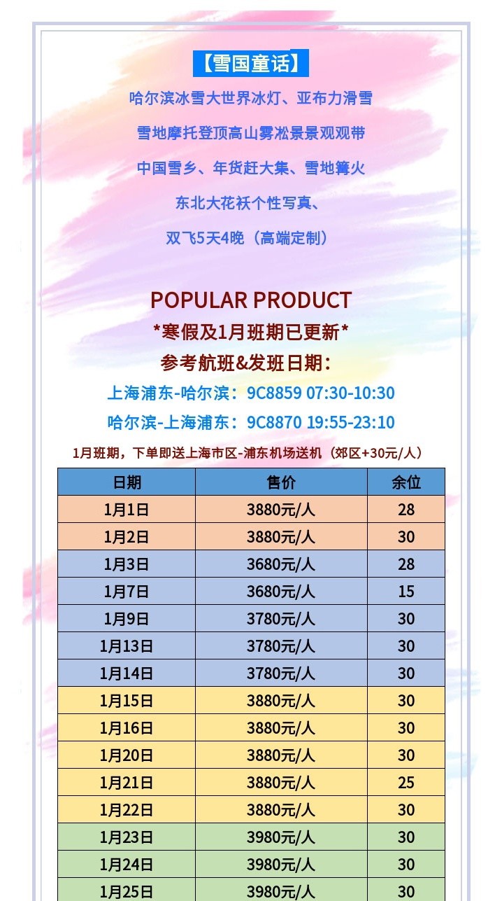 【大交通】上海浦东-哈尔滨,哈尔滨-上海浦东往返机票含税 (准确起飞时间以出团团通知单为准)
