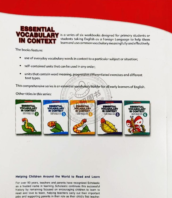 Essential Vocabulary in Context《学乐语境记英语词汇》是美国学乐出版社(Scholastic)为小学1年级学生编写的一本词汇练习册,其将单词按主题分类,并结合“语境记忆法”精心设计了大量有趣的练习题,帮助学生在特定的主题或情境中学习单词,从而摆脱枯燥记忆的困境。