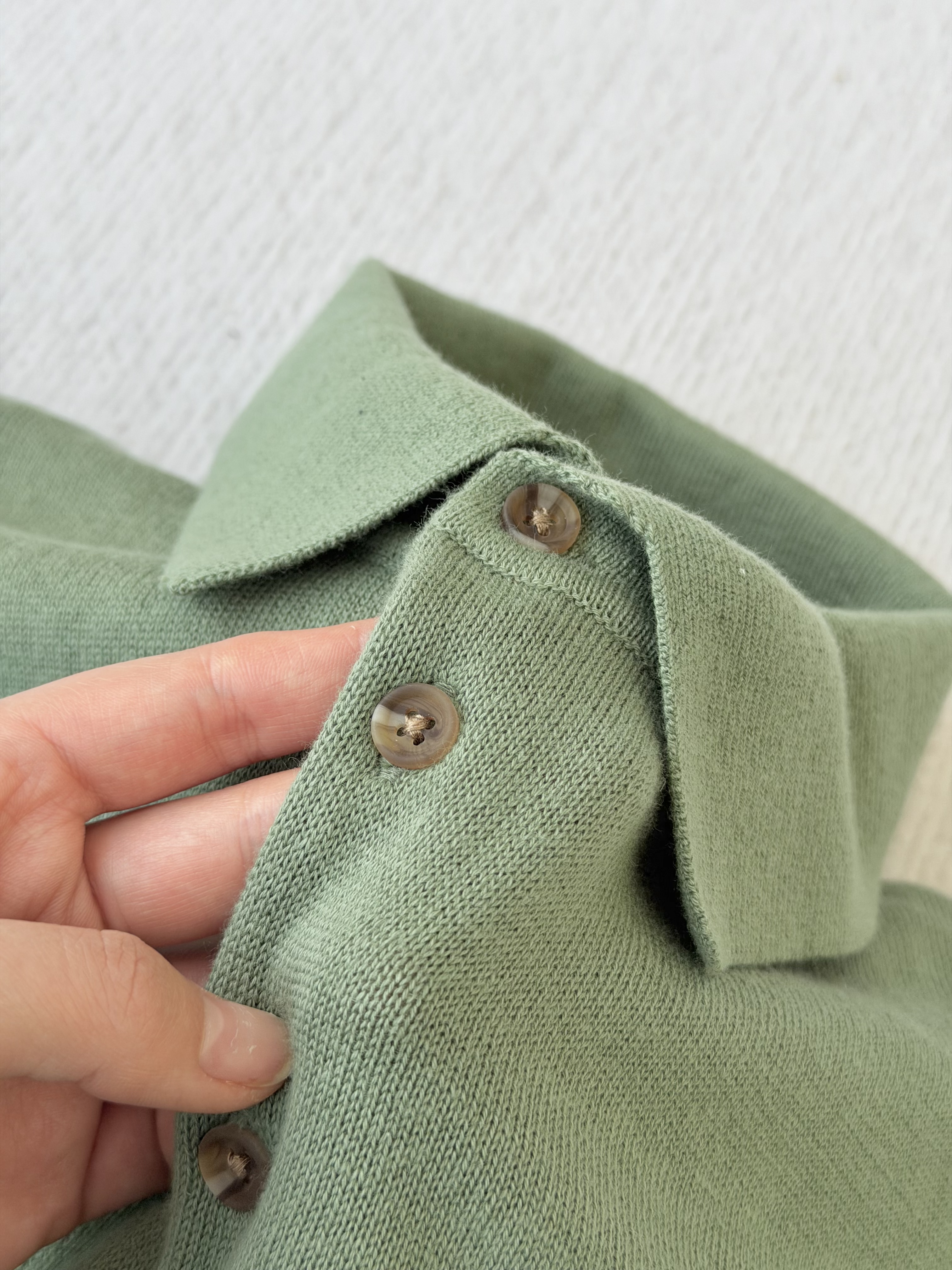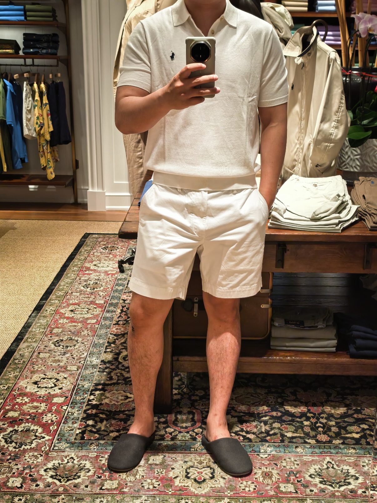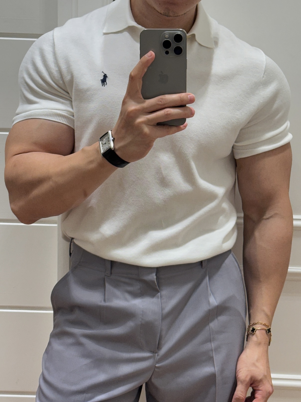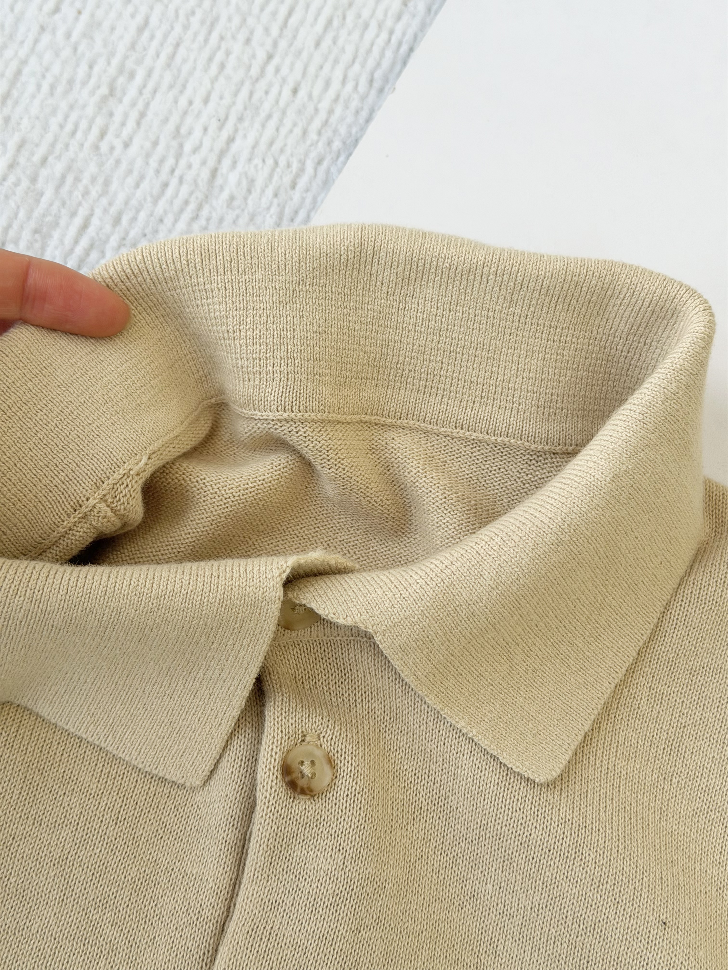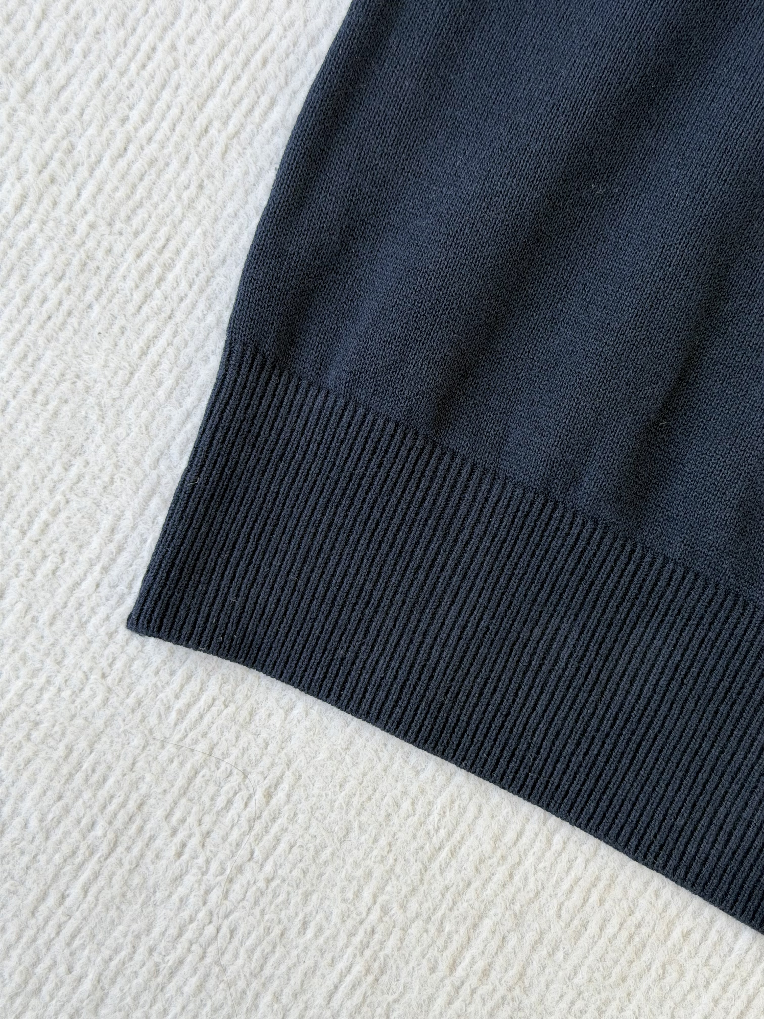 版型是正肩、直筒微宽松,下摆和袖口都是螺纹收口,符合男士针织Polo的经典剪裁