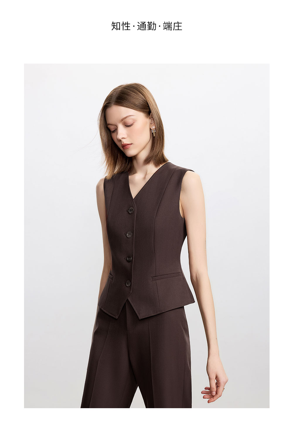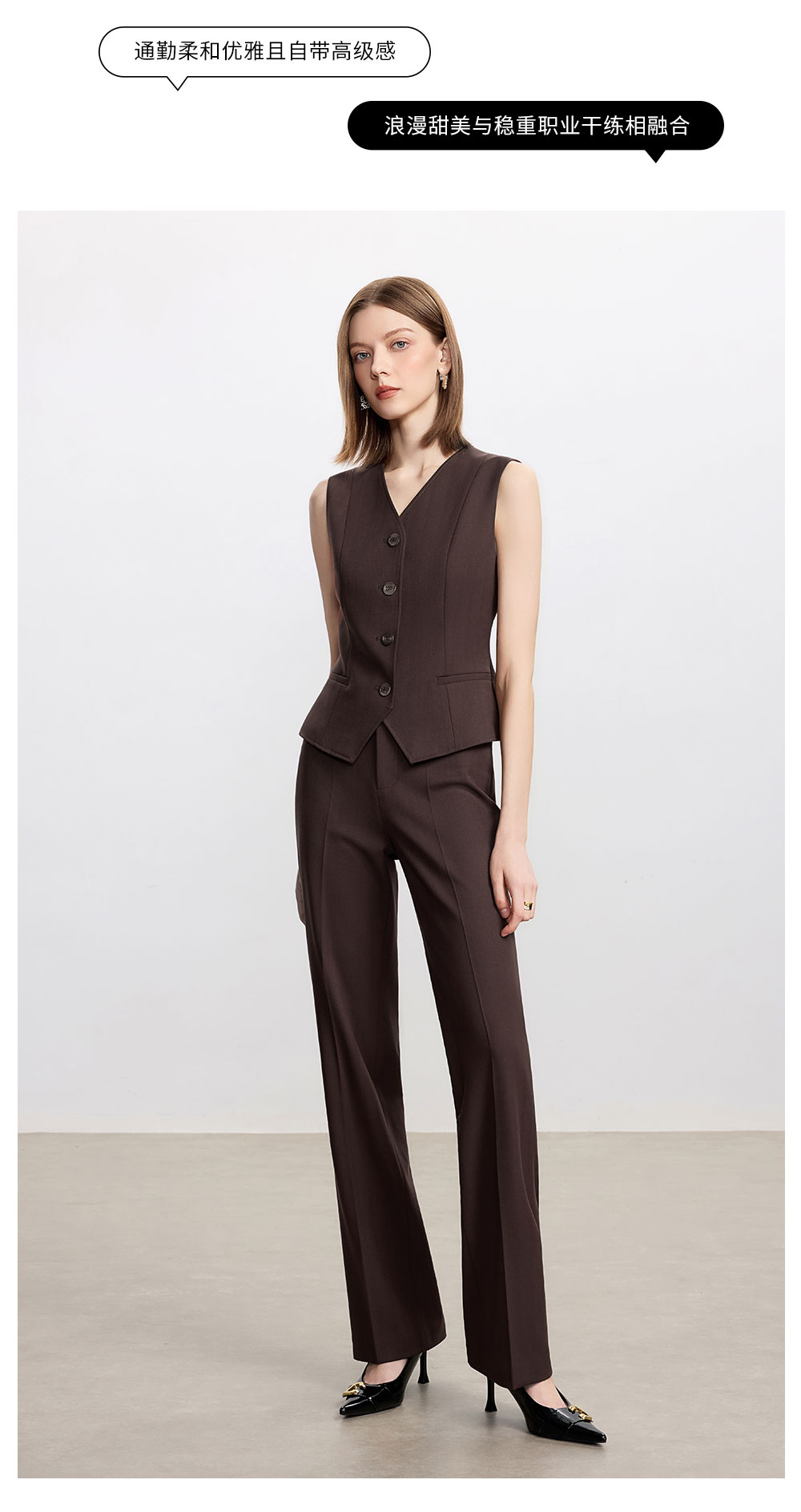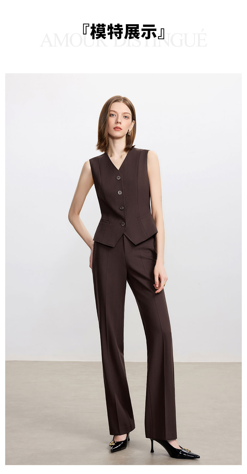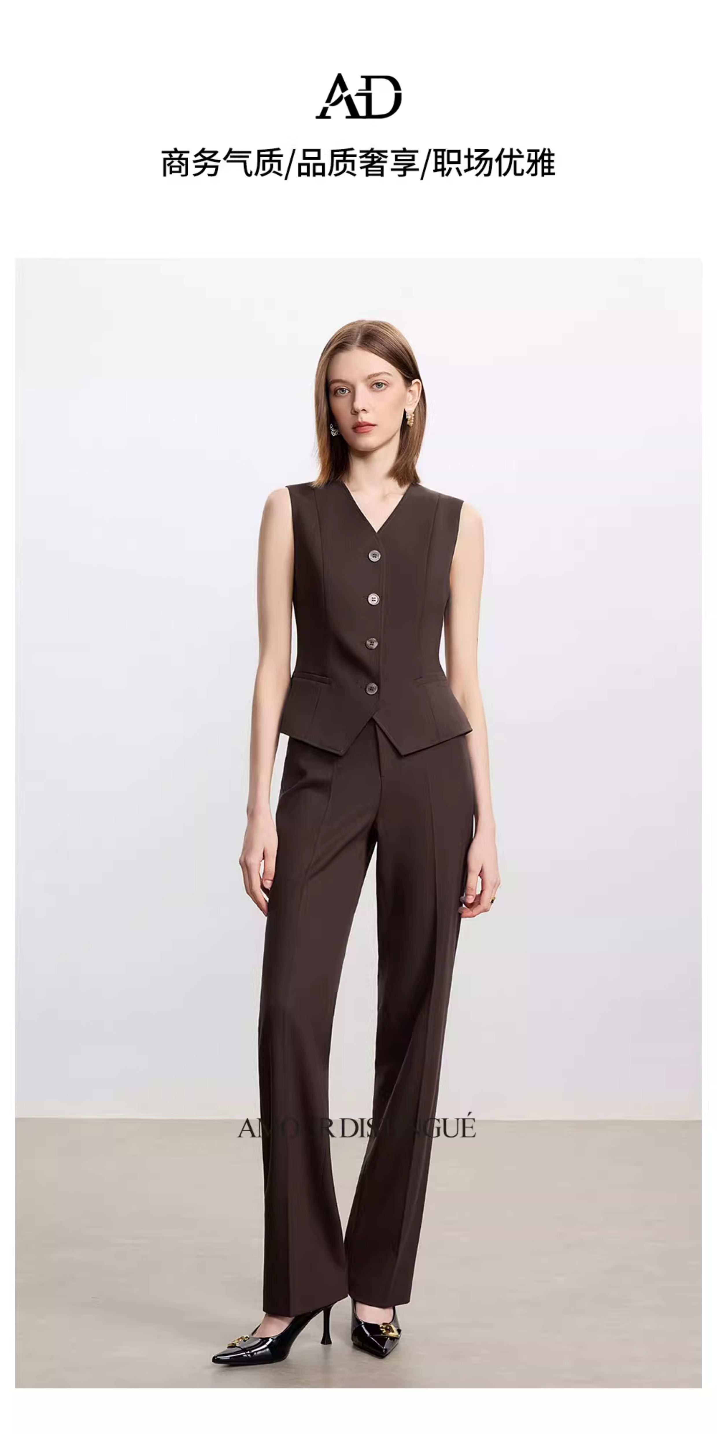 AD时尚通勤马甲职业装2025新款高级感深棕色羊毛西装裤气质两件套