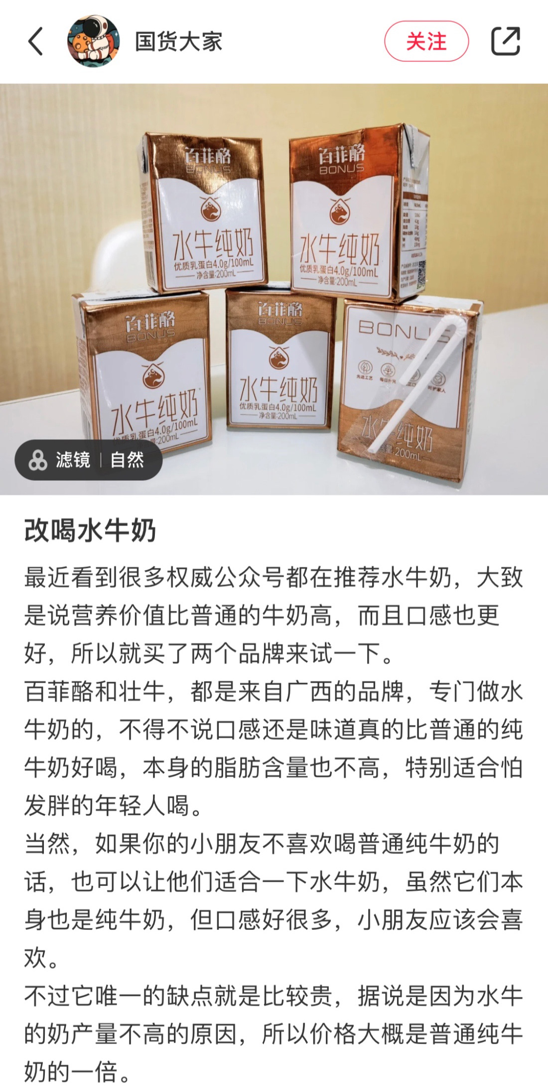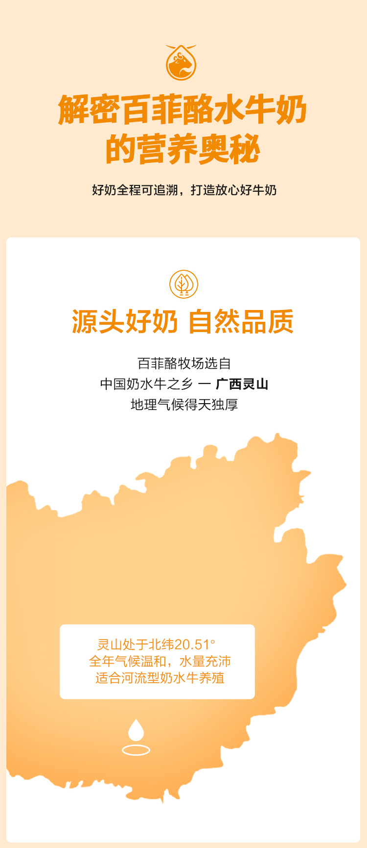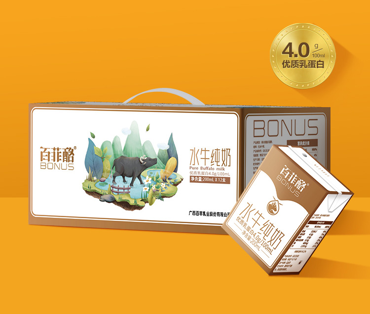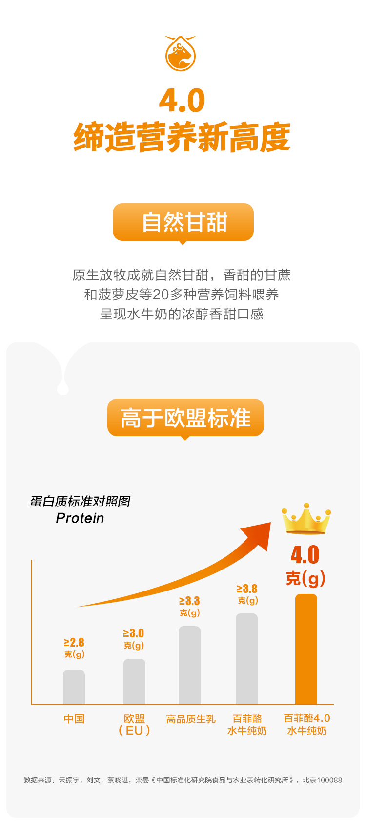 百菲酪升级版水牛奶,把乳蛋白上从3.8g升级到了4.0g,大家可别小看这小小的0.2g,那真的是需要体质更优的奶水牛才能产出来。百菲酪在自有牧场里,通过原生放养,用甘蔗、菠萝皮等20多种营养饲料,使得高品质的奶水牛产出高钙、高蛋白的生牛乳。很多进口的常温奶,像大家熟悉的安佳也只有3.3g,所以国产水牛奶百菲酪真的完胜!