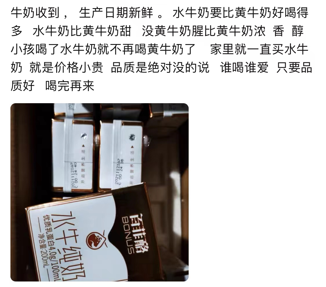 相信在我的安利下,大家应该对百菲酪都不陌生了,他们家主打的就是水牛奶。相比黑白花奶牛产的奶,水牛奶的产量较低,营养价值却很出色,所以在市面上并不多见,我之前就真的没有喝过。据国家相关科研部分实验测得,1公斤的水牛奶所含的营养价值相当于黑白花牛奶1.85公斤,水牛奶含有1.5倍的蛋白质,1.3倍的钙,3倍的氨基酸和数倍到数十倍的微量元素和维生素,这些营养成分也能让身体更多吸收。