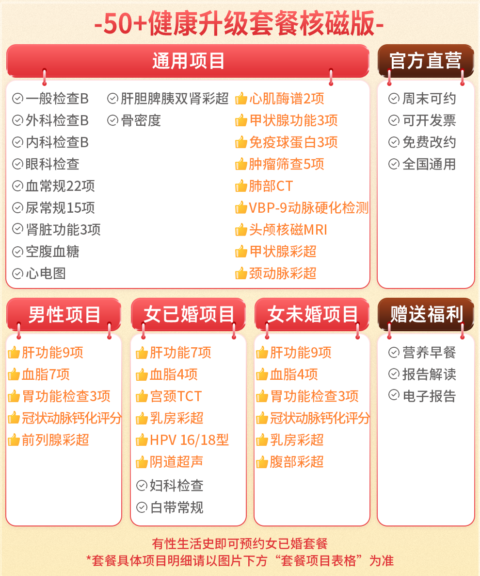 | 套餐名称:中老年50+健康升级套餐核磁版 | |||||