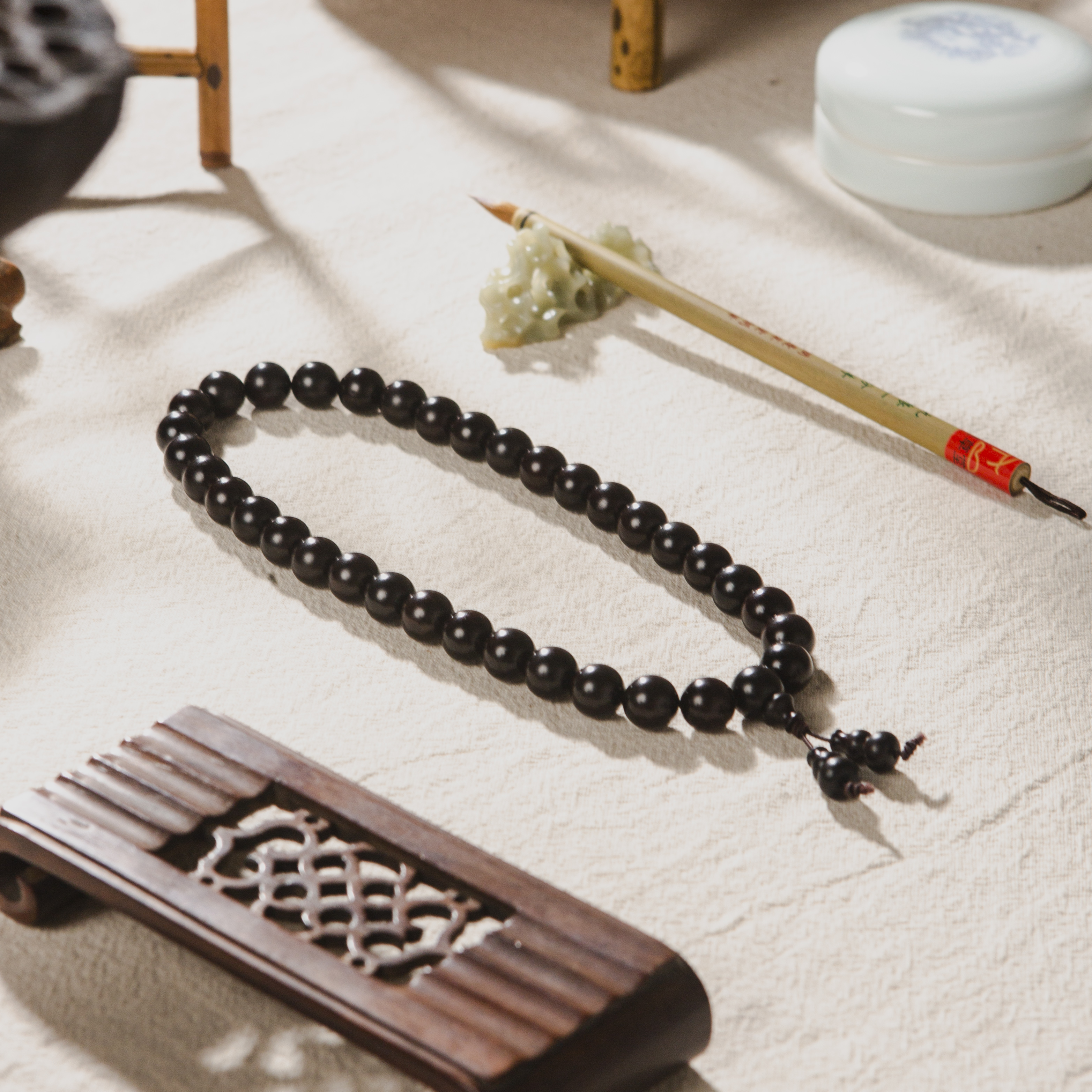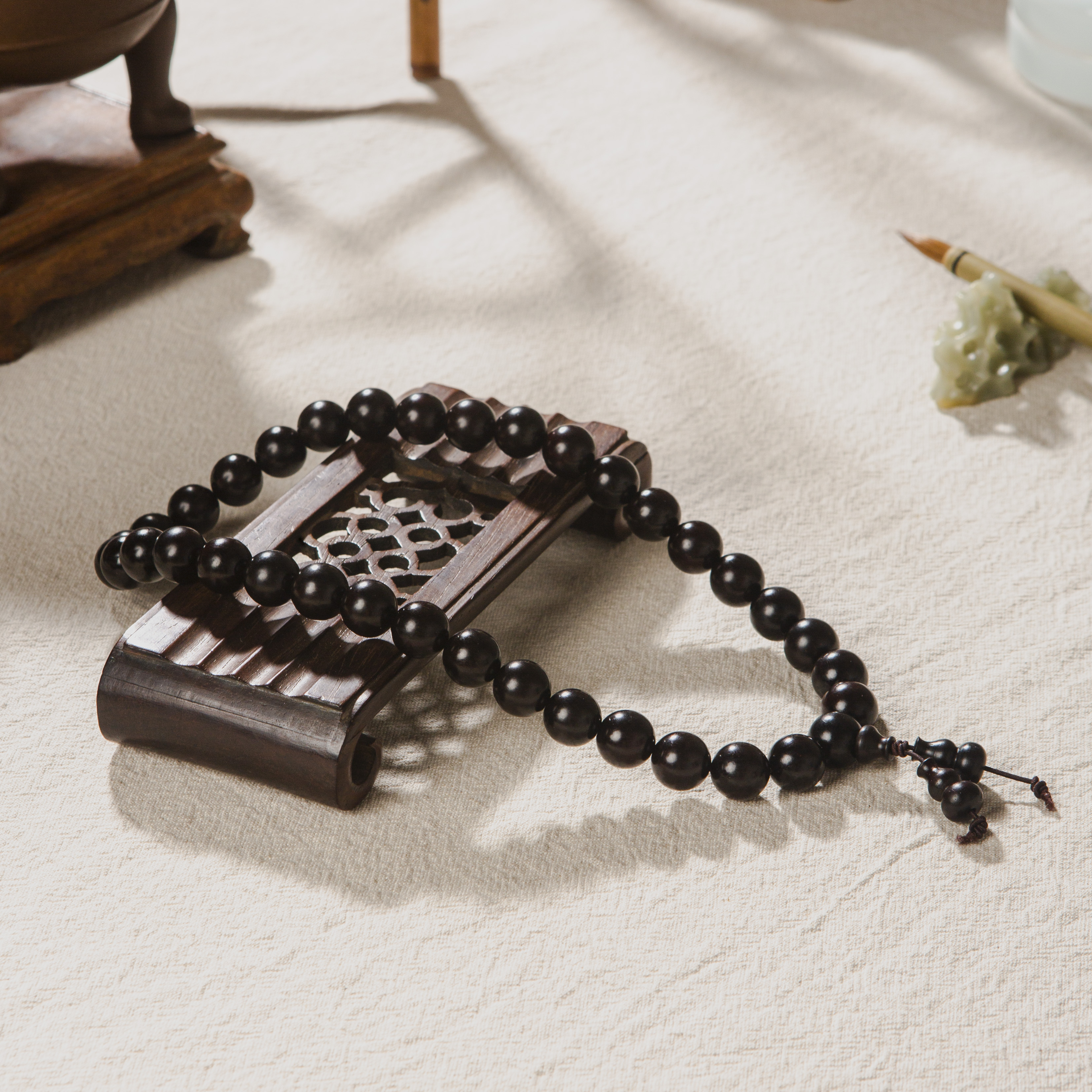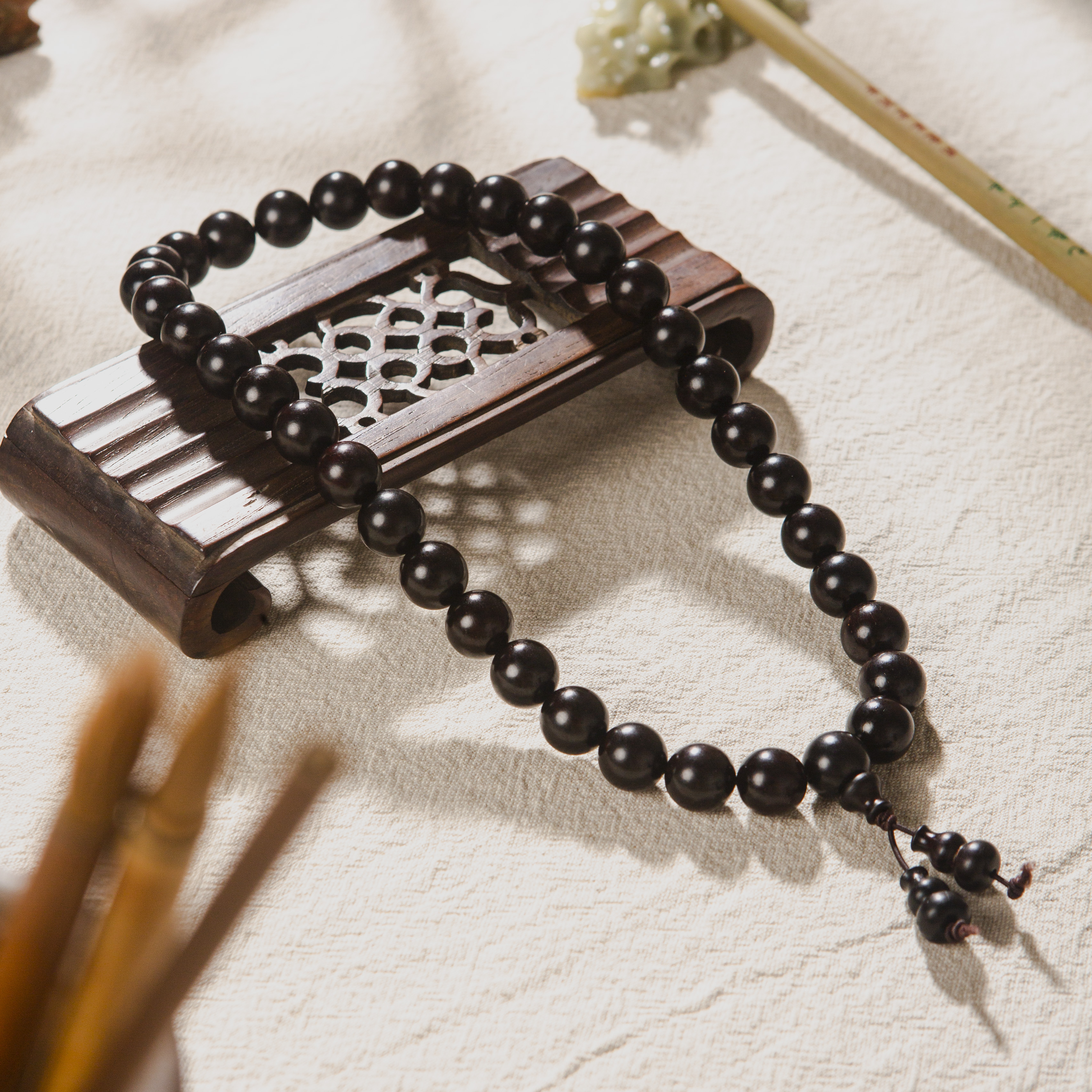 清代紫檀家具老料制手持。百年紫檀老料油性大、密度高,气息古朴沉稳。手工制珠精细至极。是难得的清玩之物。