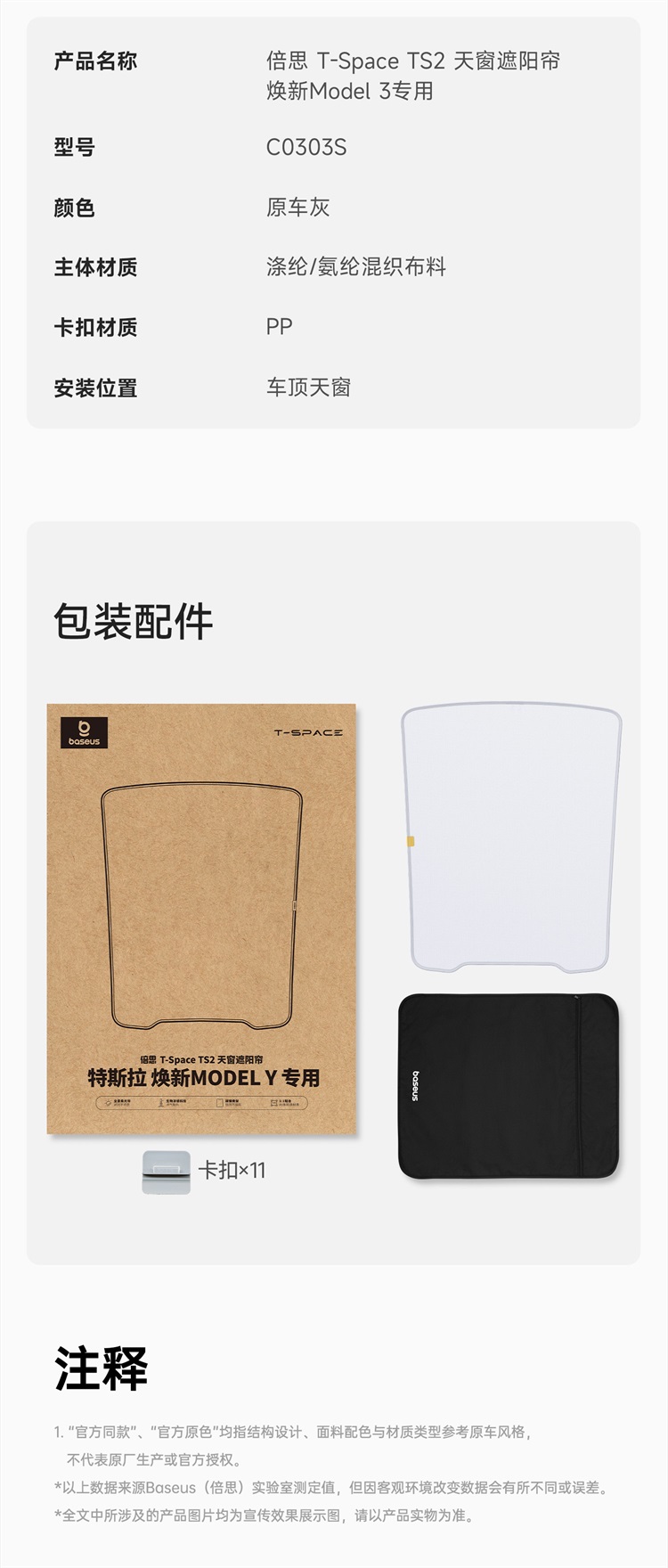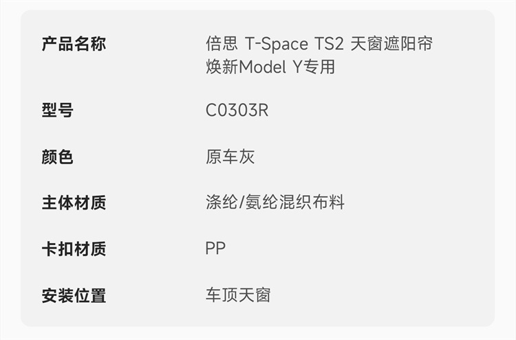 倍思 T-Space TS2 天窗遮阳帘 特斯拉 焕新Model 3/Y 专用