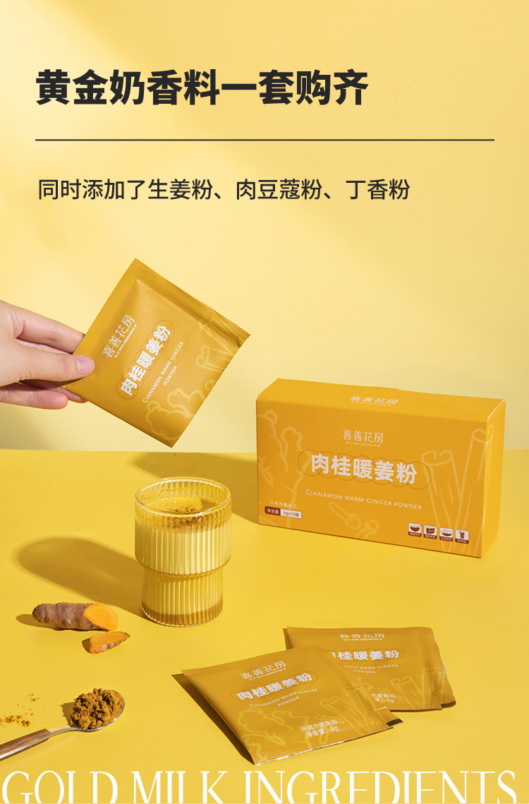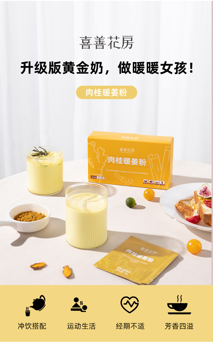 喜善花房的肉桂暖姜粉,是升级版黄金奶哦,来源于印度,是印度阿育吠陀草本学推崇的健康饮品之一,姜黄中中含有的姜黄素,因为天然疗愈力被广泛运用于饮食和医疗。多项研究证明,它在亢炎、解热、亢氧化、调节新陈代谢、以及减重等方面有着强大能力!而且0蔗糖,0脂肪,热量比普通饮料低很多,被誉为疗愈世界中的“天然奶〞,喝完后身体暖暖,不做“冰冰”人儿,每天喝1袋,好喝还掉秤!