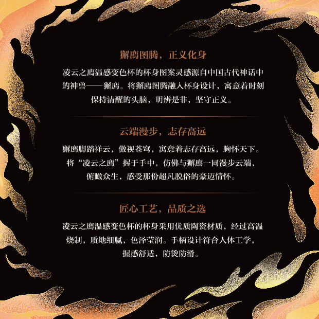 匠心工艺,品质之选:凌云之廌温感变色杯的杯身采用优质陶瓷材质,经过高温烧制,质地细腻,色泽莹润。手柄设计符合人体工学,握感舒适,防烫防滑。