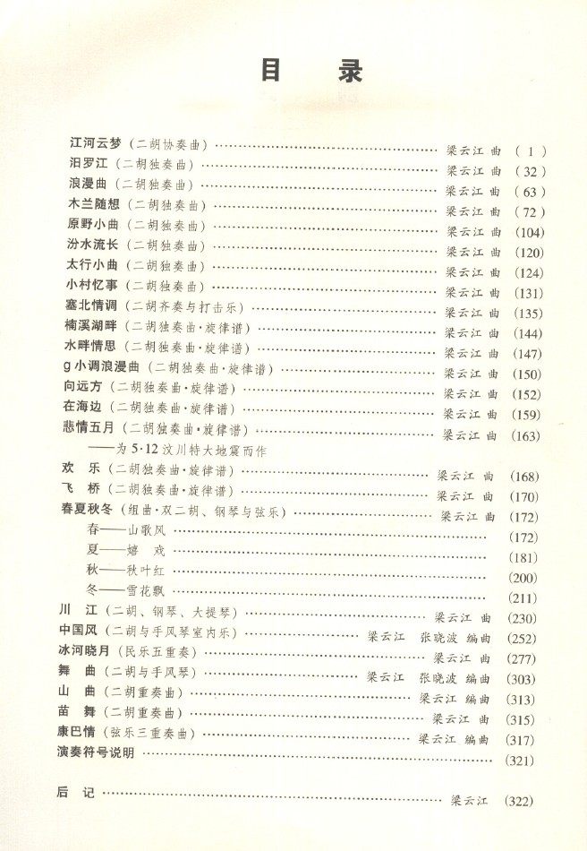 本书精心选编了著名二胡教授梁云江先生的中高级程度的二胡作品,包括二胡独奏曲《汨罗江》《浪漫曲》《木兰随想》《太行小曲》等,二胡协奏曲《江河云梦》,二胡齐奏与打击乐《塞北情调》,二胡组曲《春夏秋冬》,民乐五重奏《冰河晓月》等,作品题材多样、体裁丰富,为二胡学生进一步提高二胡演奏水平提供了高质量的二胡练习曲目,这些曲目同时也适合于作音乐会演奏曲目。