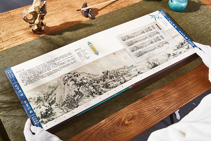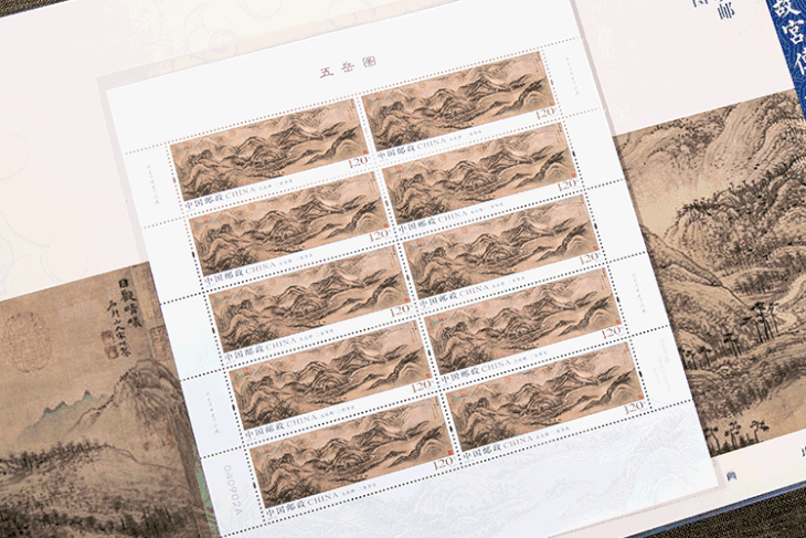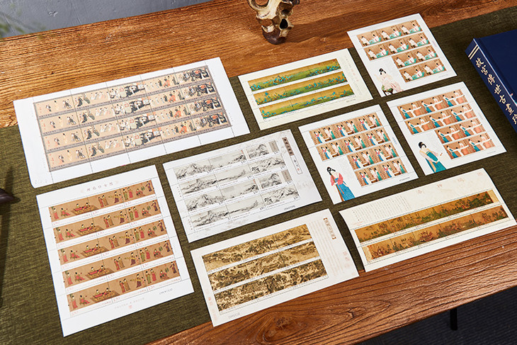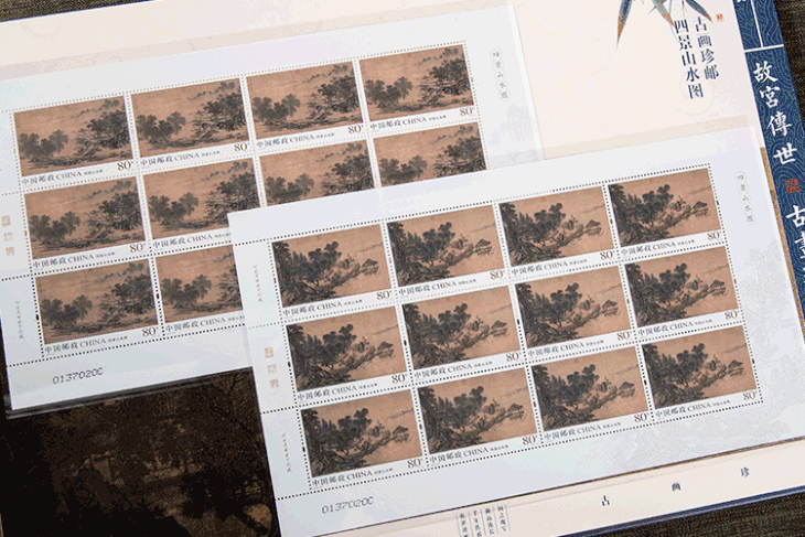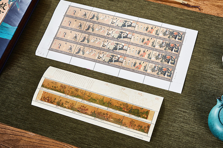 中国古画,注重意境悠远,多是长卷画幅,故名画珍邮多以大版张的形式呈现,缺一不可。