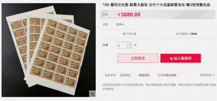 1984年发行的《簪花仕女图》大版张,目前市场价已达到3680元;